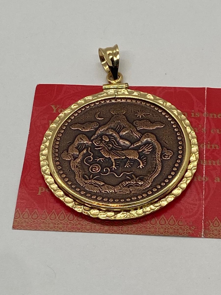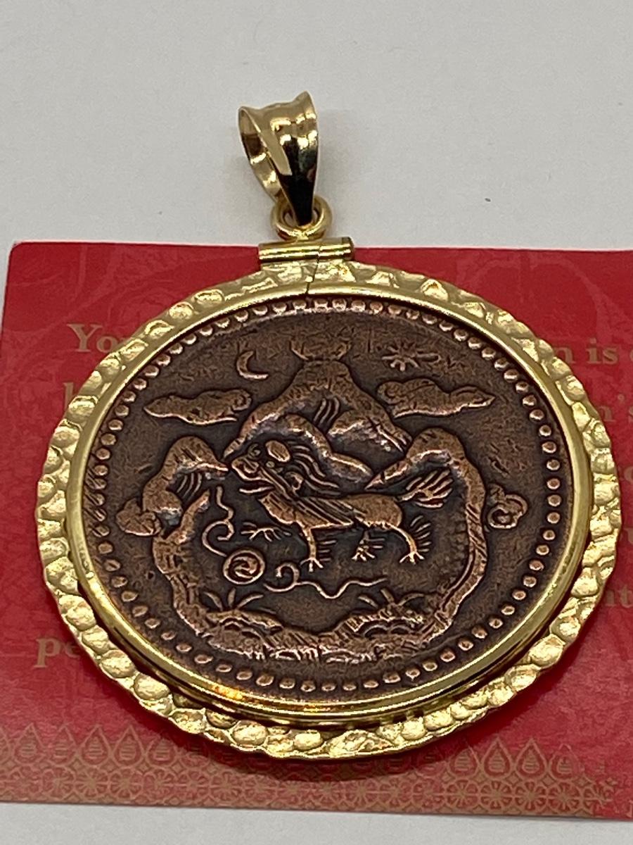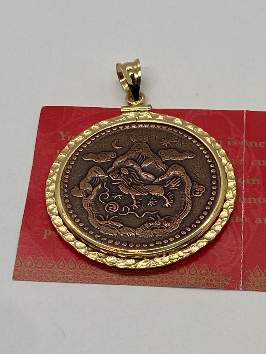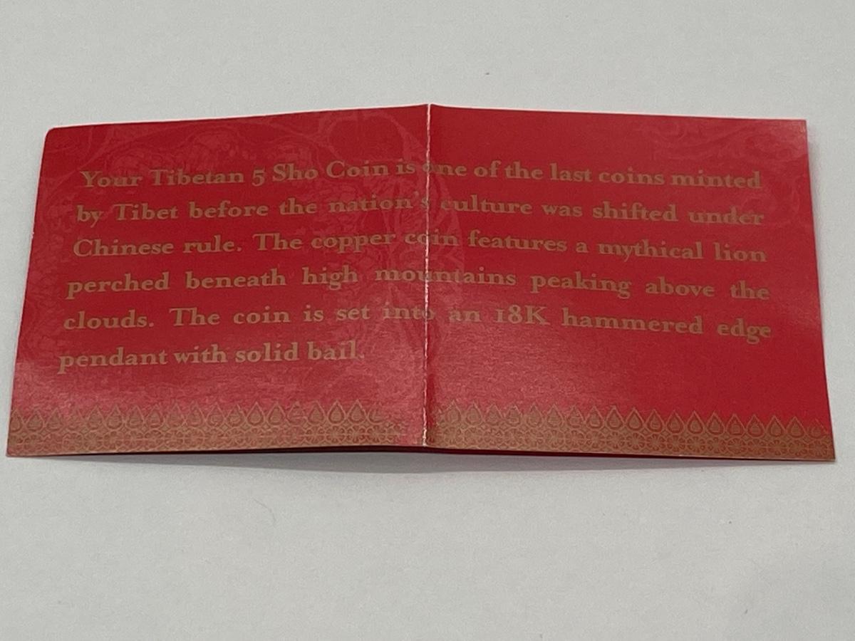 Tibetan 5 Sho coin set in 18k yellow gold pendant. 11.7 grams. The pictures show condition, measurements if taken, and what is included in the lot. Due to the large amount that we photograph and the time frame, we are not always able to take measurements. All items unless noted, are pre-owned and have been used, and are untested. Thank you