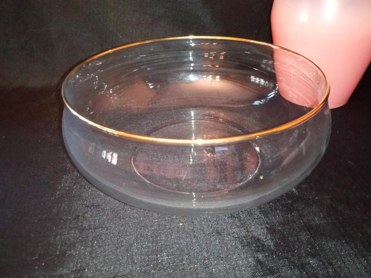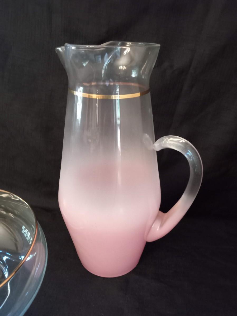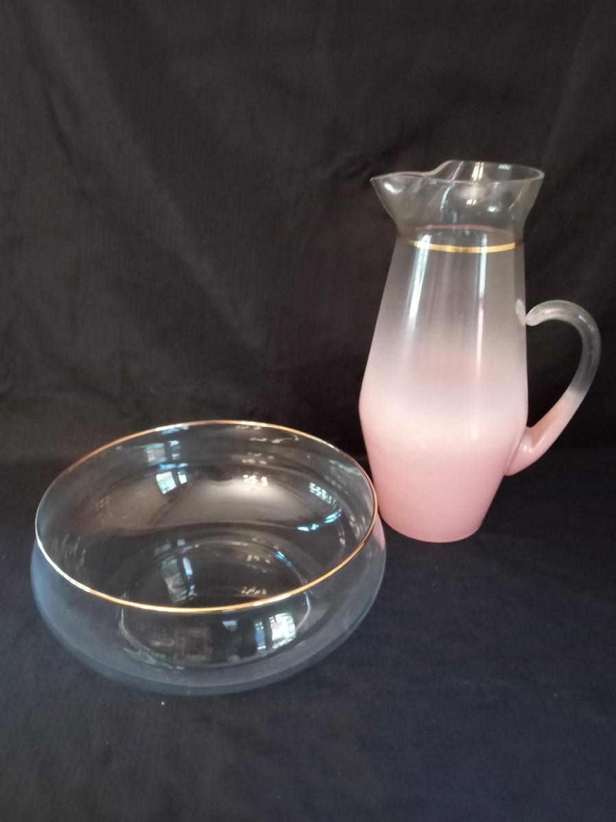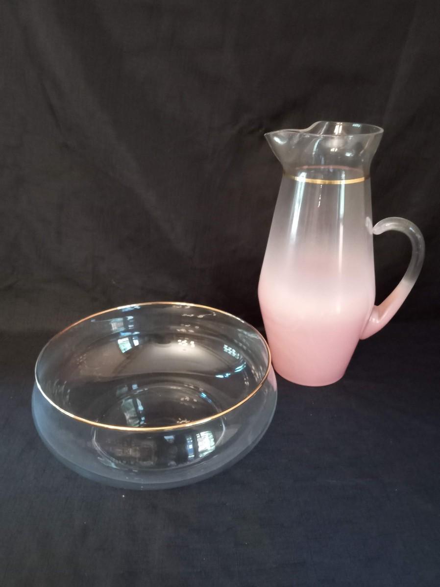 LOT 23 VINTAGE PINK BLENDO PITCHER AND A GLASS SERVING BOWL WITH A GOLD RIM