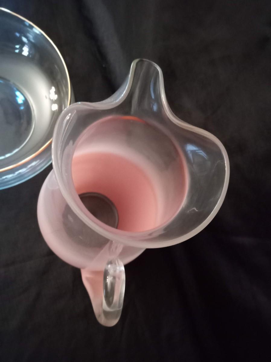 LOT 23  VINTAGE PINK BLENDO PITCHER AND A GLASS SERVING BOWL WITH A GOLD RIM