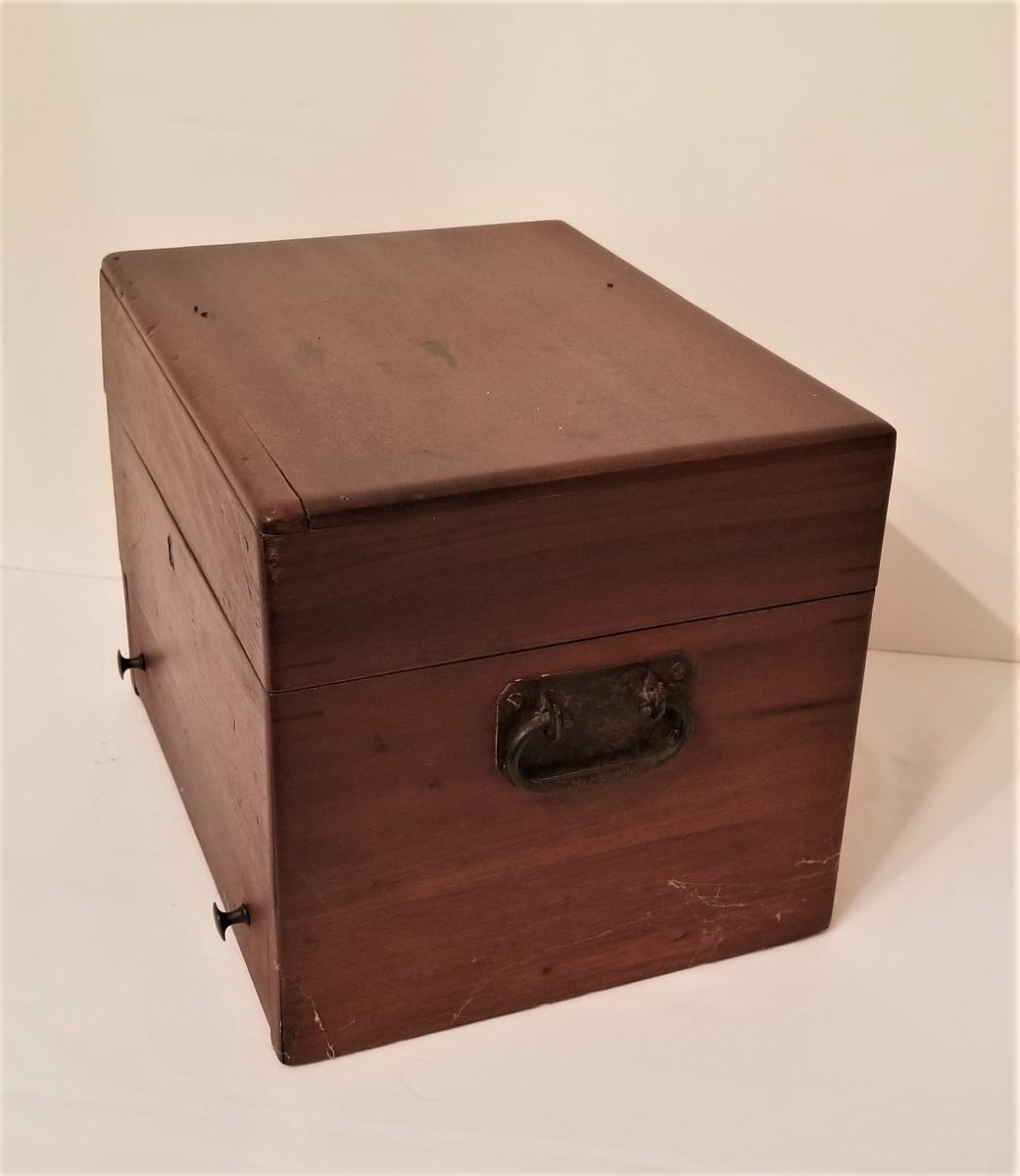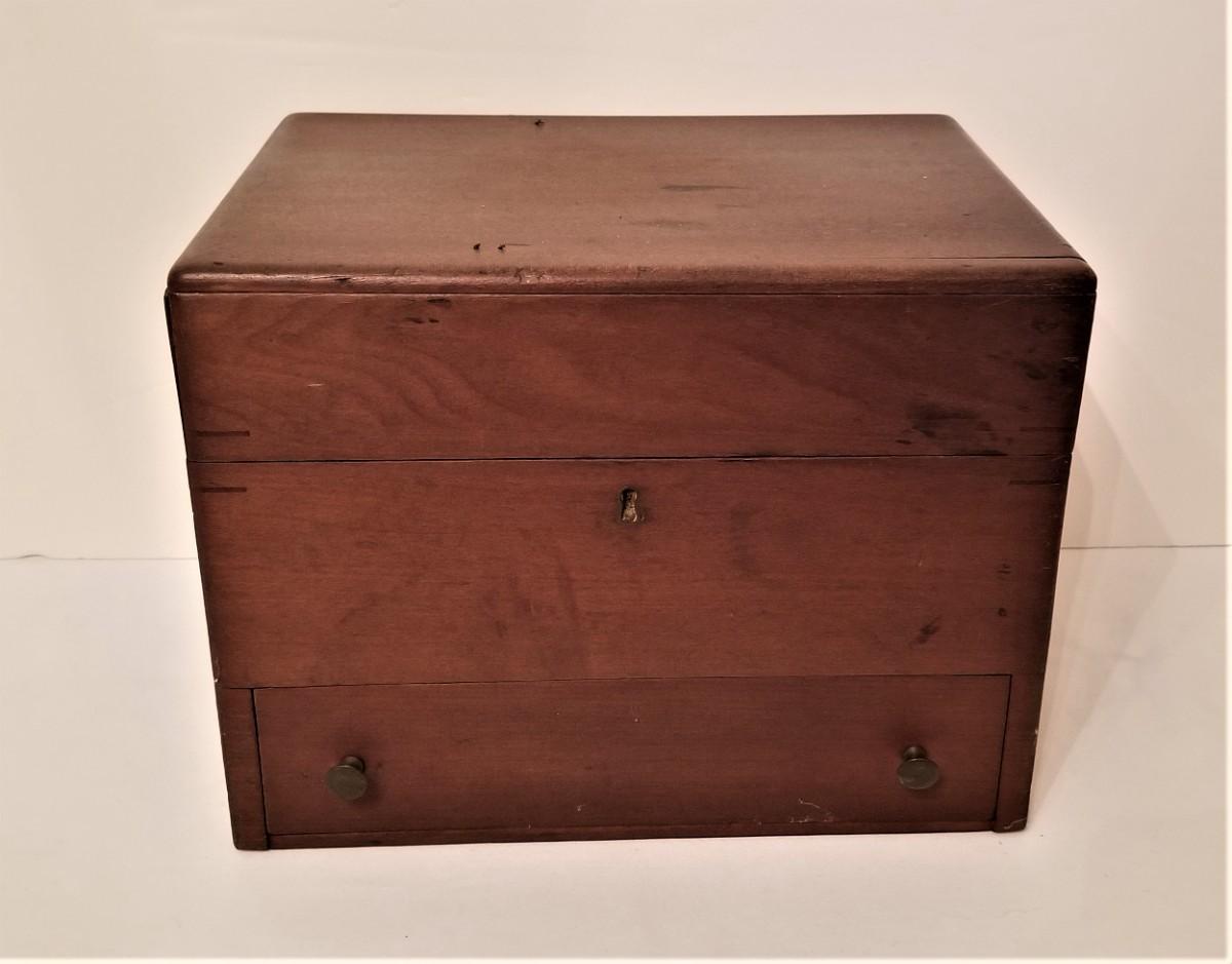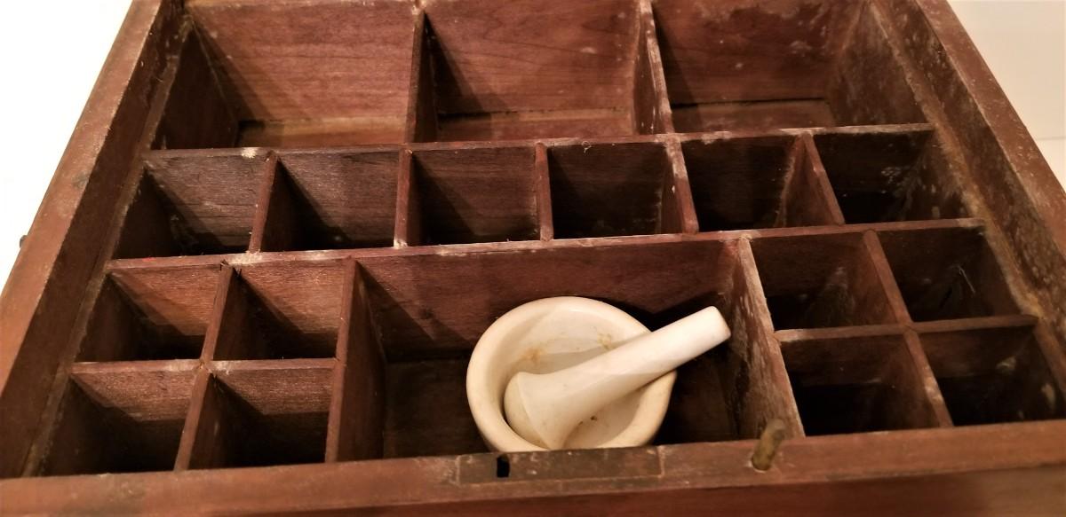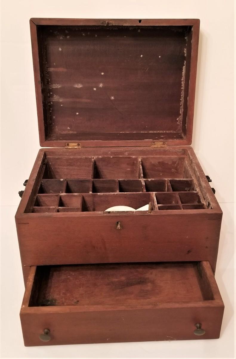 What a handsome piece! Antique Apothecary chest - 19th century Metal handles on side, no key. 9.5" tall, 9.5" deep, 12.5" across. Bottom drawer, includes mortar & pestle.