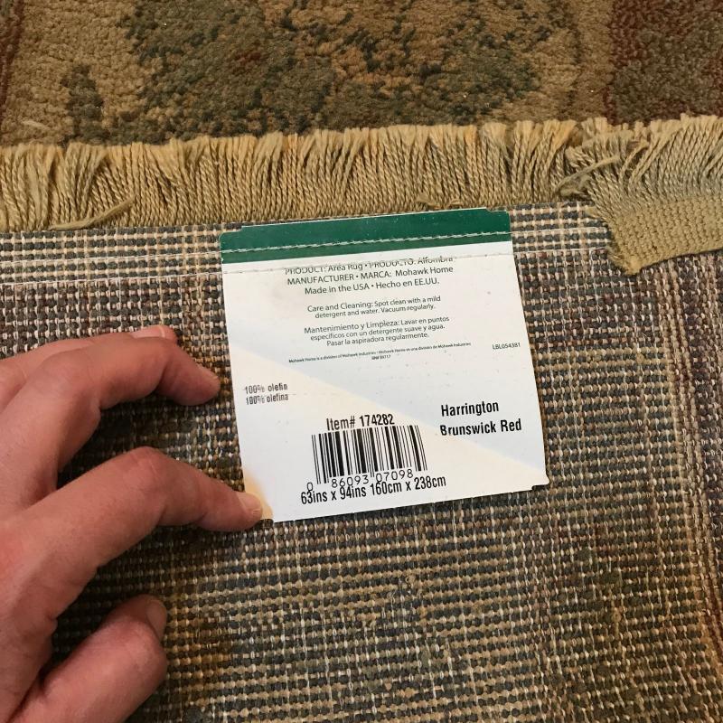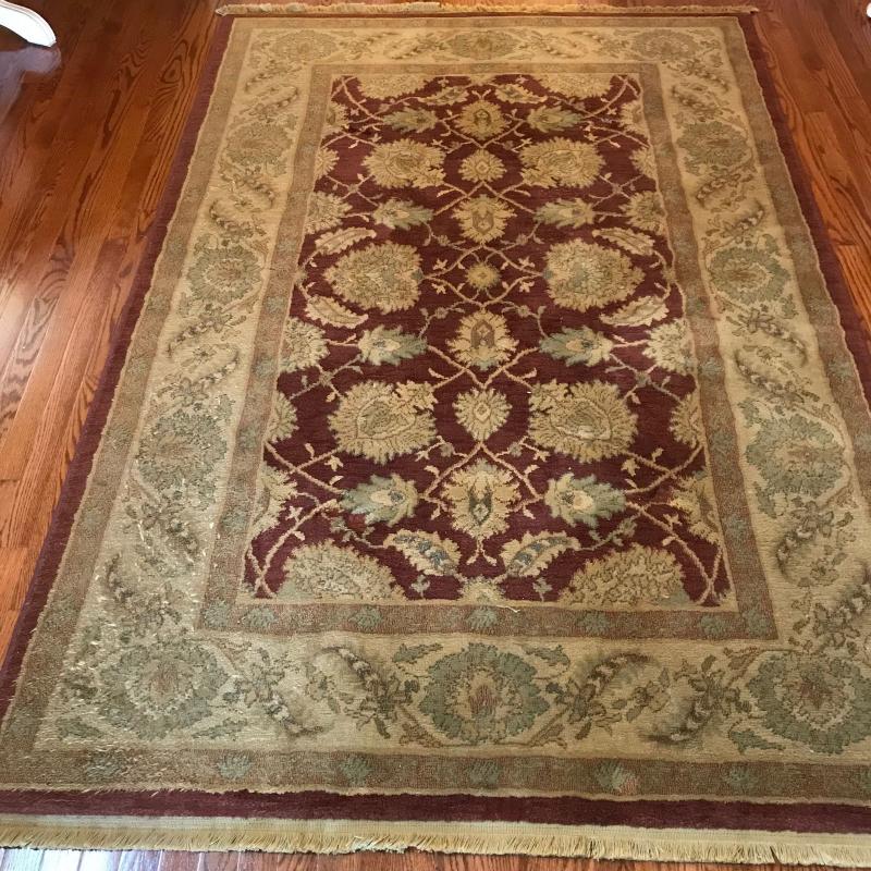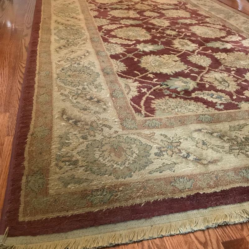 Beige and wine colored area rug measures 63” x 94”. Some pilling fibers are noticeable. No pets in this home. Label states “Harrington Brunswick Red.” No shipping.