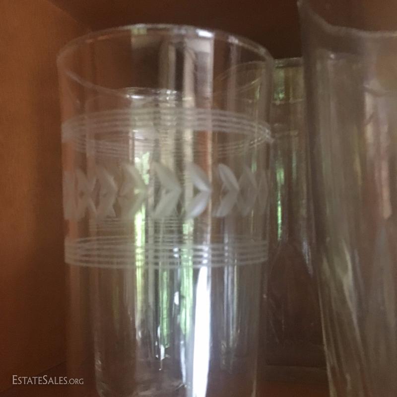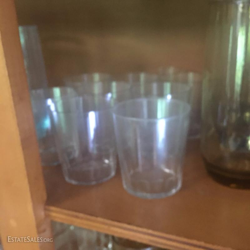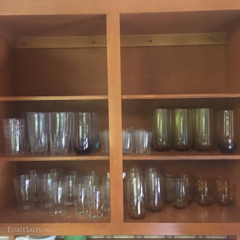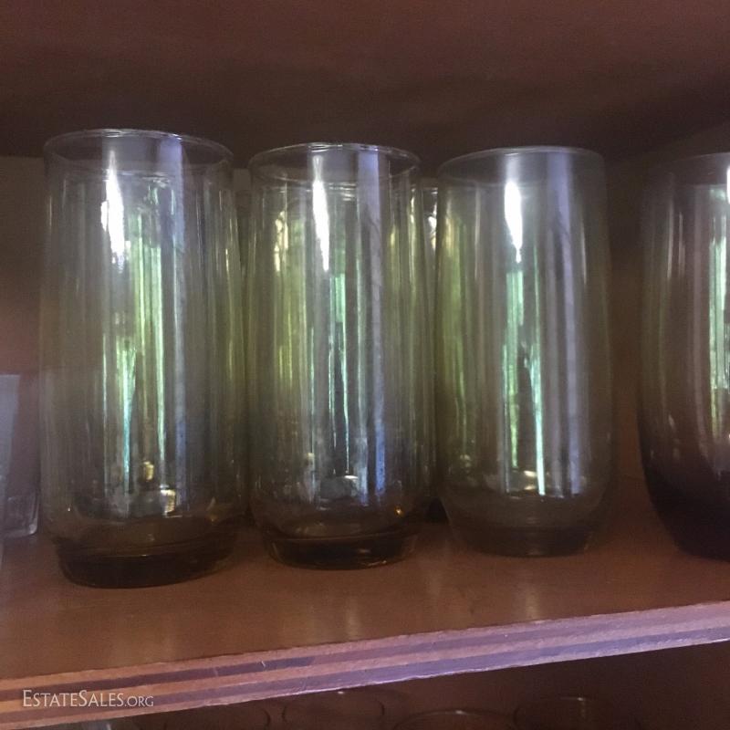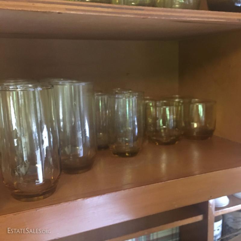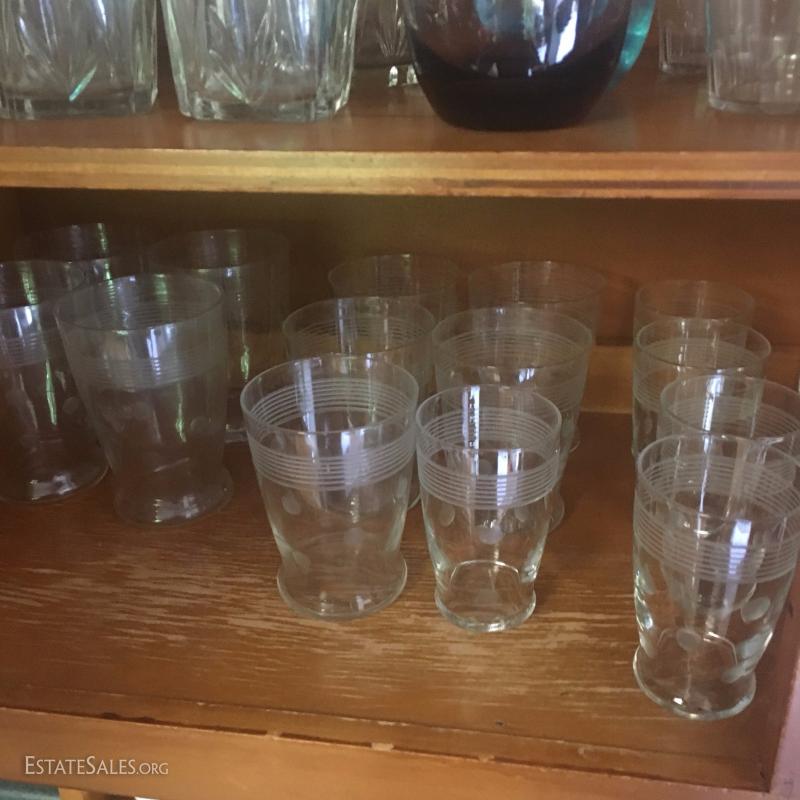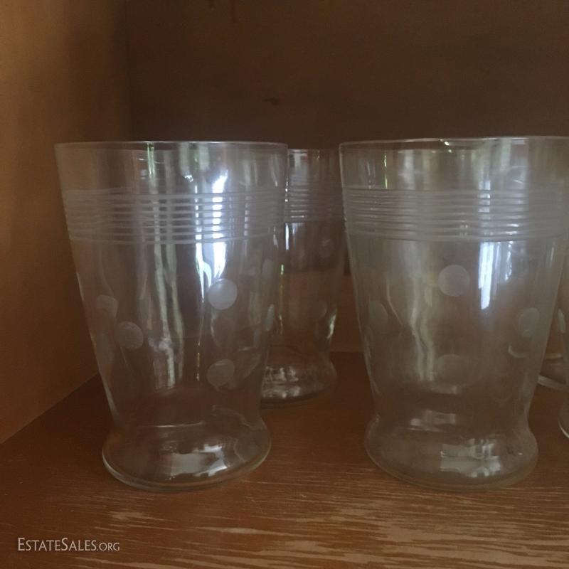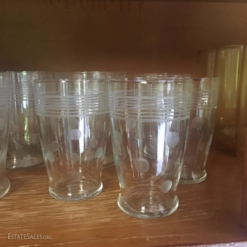 Assorted drinking glasses. One set with amber tint. One polka dot and stripe design. And more. See photos.