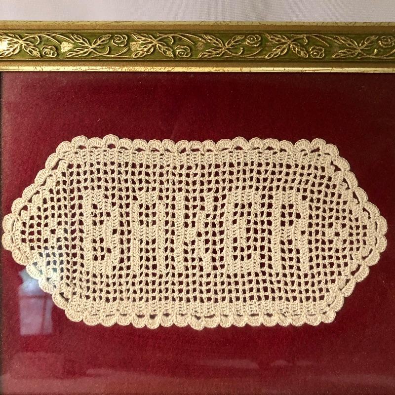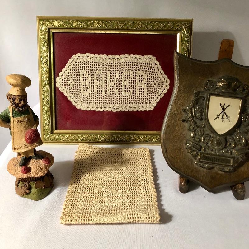 Calling all Bakers! A handsome coat of arms could be yours to celebrate your genealogy that is accompanied by a Heraldry report. Also included is a baker man figurine standing atop a muffin with the word Baker inscribed on his apron and two doilies with Baker stitched in them one of which is framed and measures 10” x 12”.