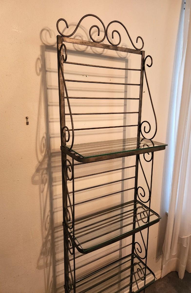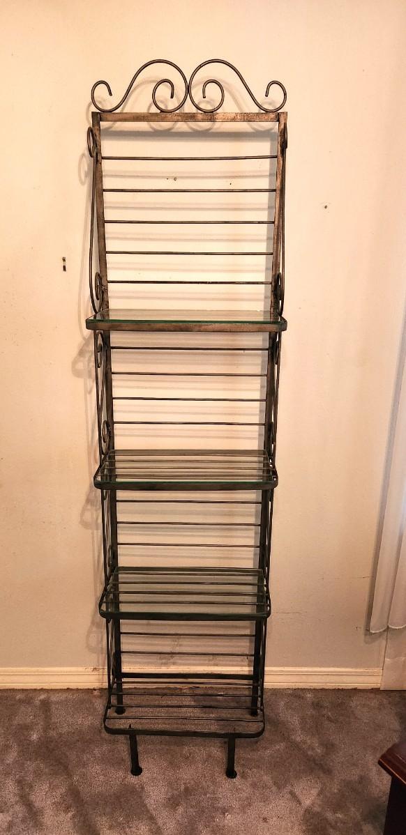 This metal Baker's rack/plant stand has 4 shelves - 3 have glass cut to fit. 6 feet tall. A versatile piece that can be used inside or outside.