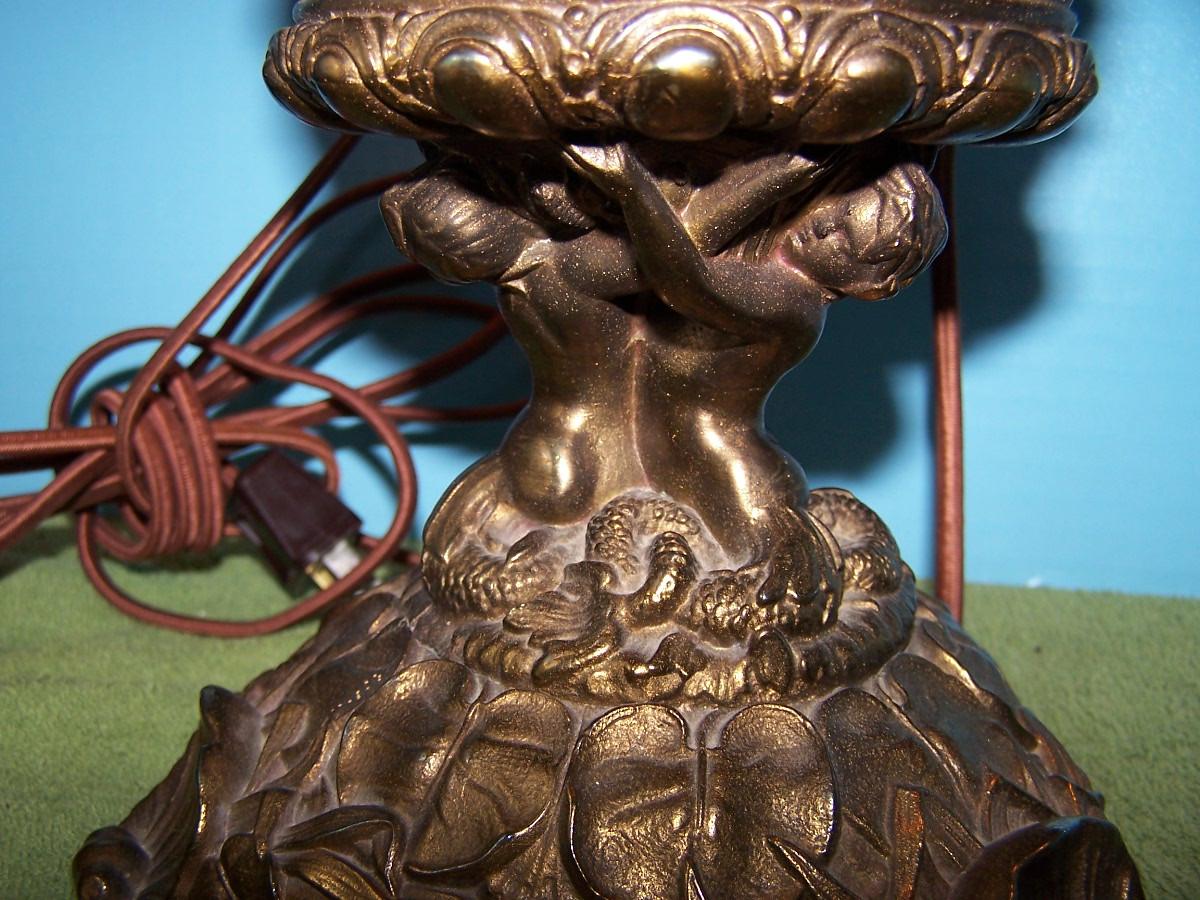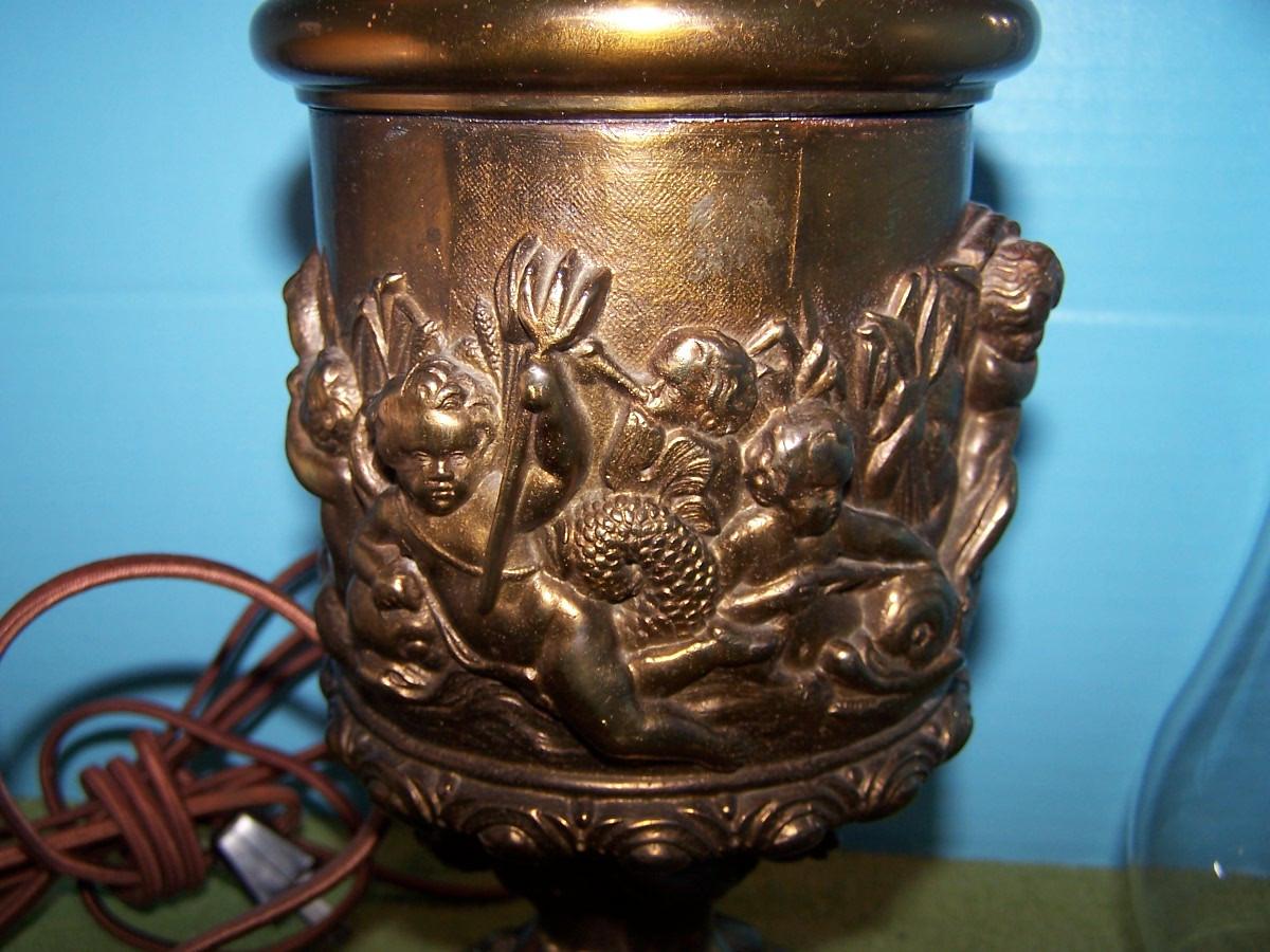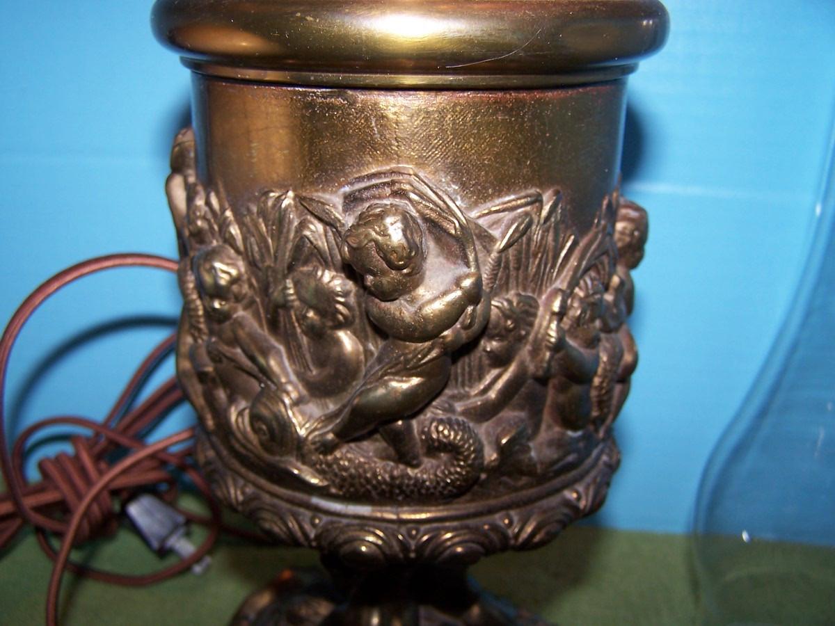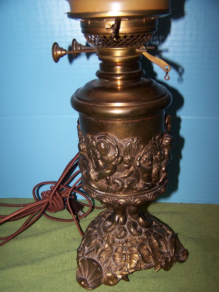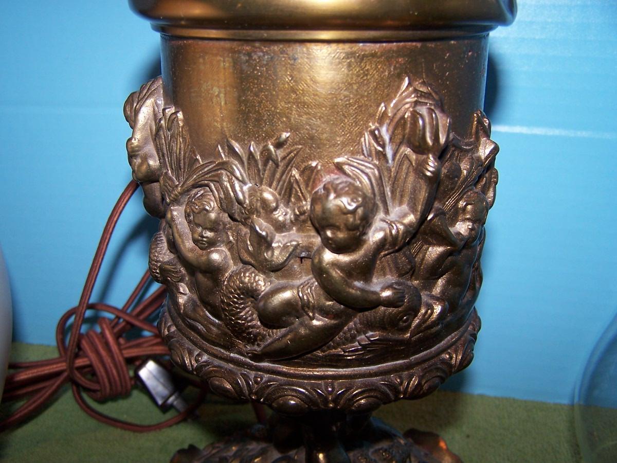 THIS IS A BEAUTIFUL VINTAGE E MILLER BRASS HURRICANE LAMP!!! IT IS MARKED. IT IS 24 1/4'' TOTAL TALL.. THE HAND PAINTED MILK GLASS GLOBE HAS SEVERAL TINY FLAKES AROUND THE HOLES. THE BASE IS BRASS, AND MERMAIDS. IT HAS BEEN CONVERTED TO ELECTRIC. LIGHT WEAR...