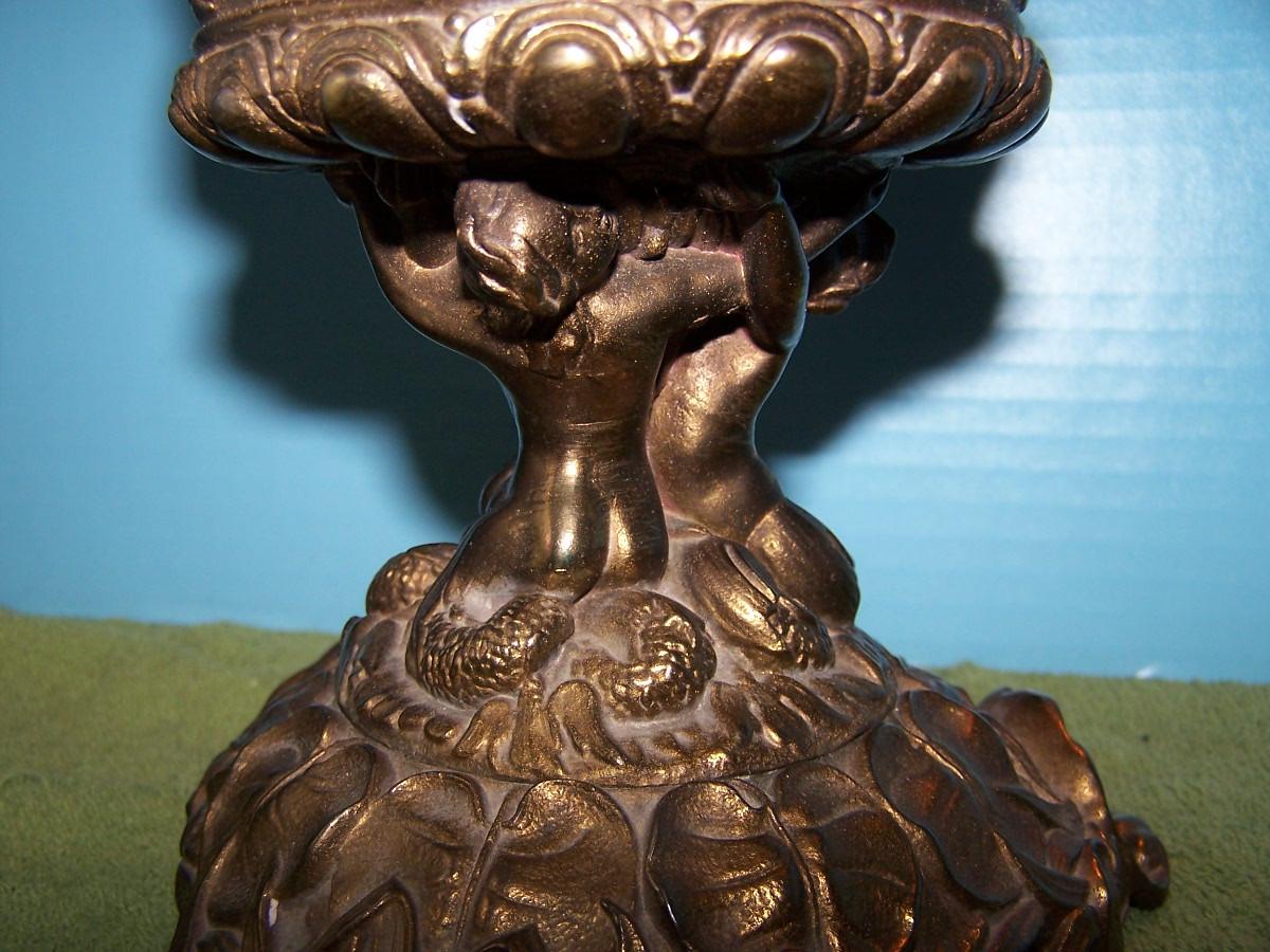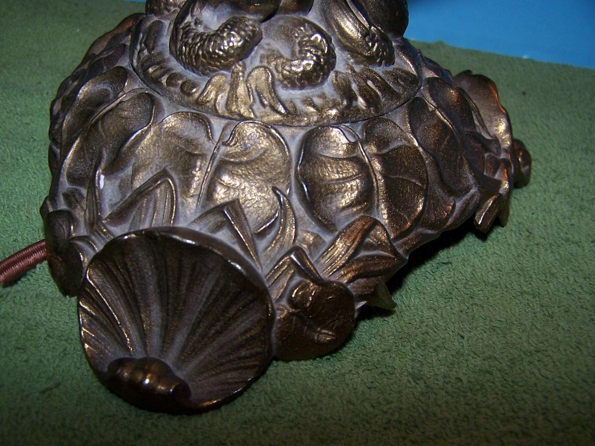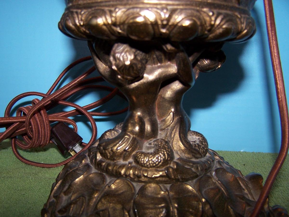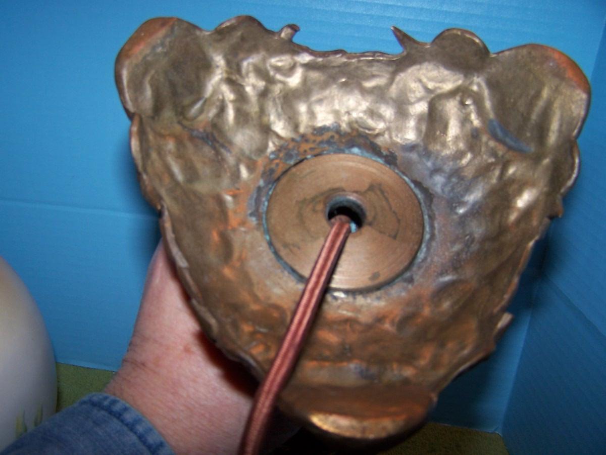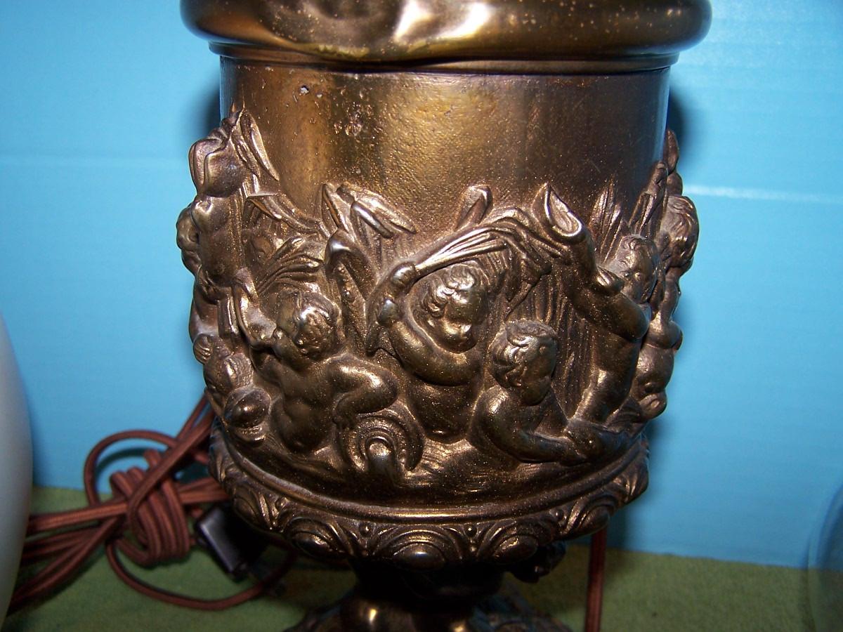 THIS IS A BEAUTIFUL VINTAGE E MILLER BRASS HURRICANE LAMP!!! IT IS MARKED. IT IS 24 1/4'' TOTAL TALL.. THE HAND PAINTED MILK GLASS GLOBE HAS SEVERAL TINY FLAKES AROUND THE HOLES. THE BASE IS BRASS, AND MERMAIDS. IT HAS BEEN CONVERTED TO ELECTRIC. LIGHT WEAR...