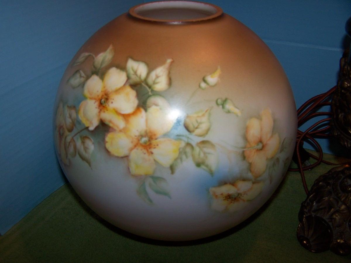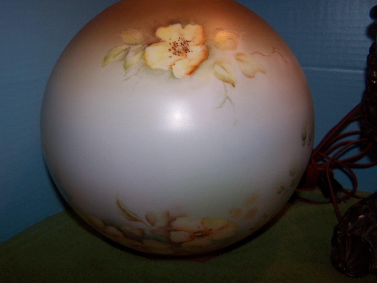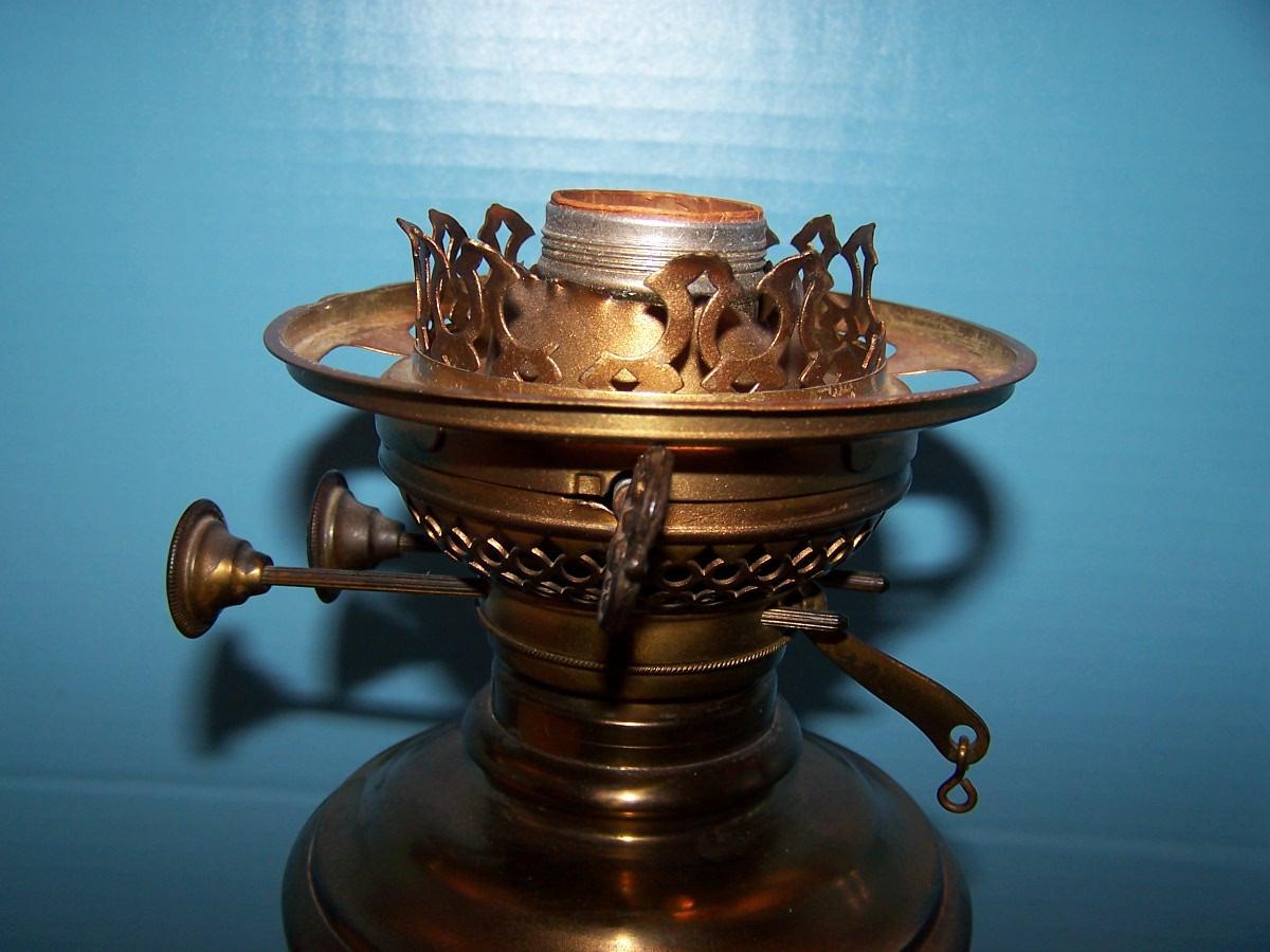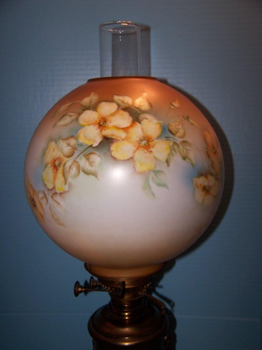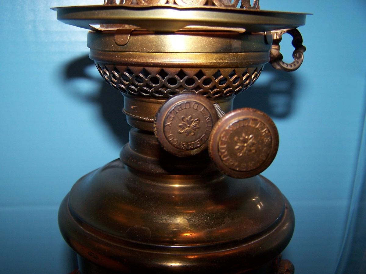 LOT 23 BEAUTIFUL VINTAGE E MILLER DUPLEX BRASS HURRICANE LAMP with PAINTED GLOBE