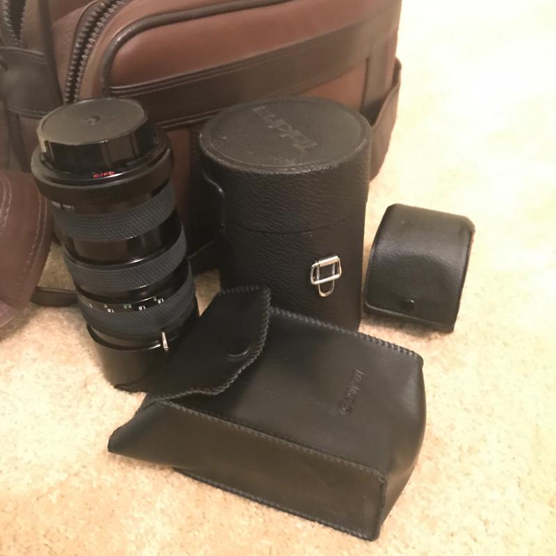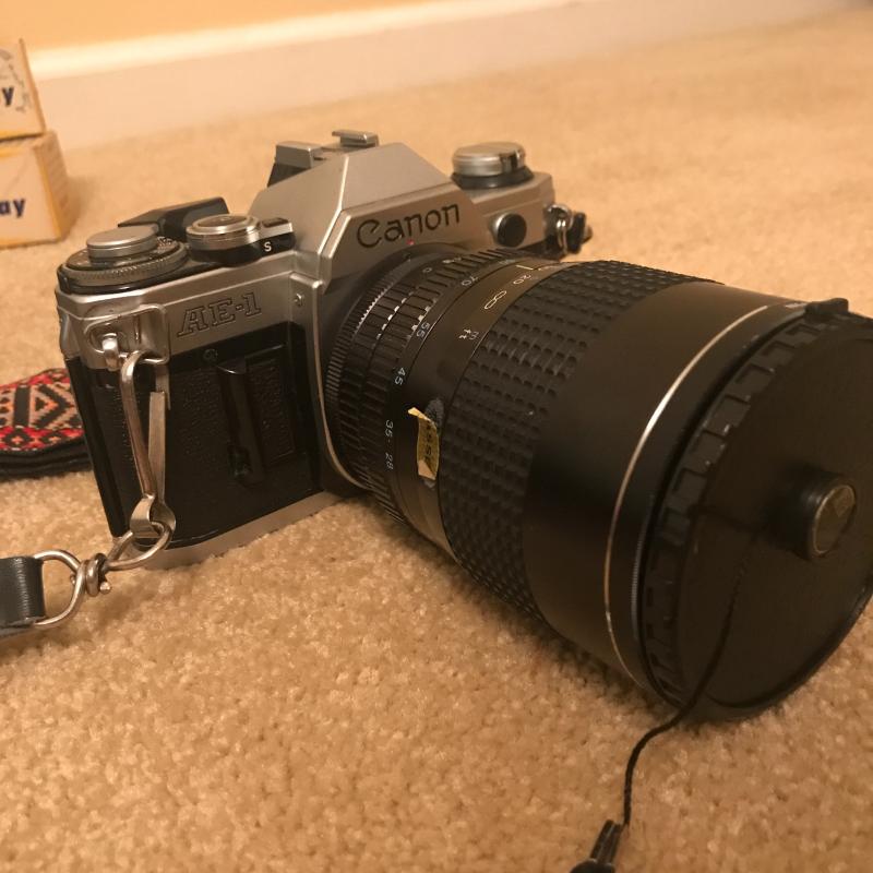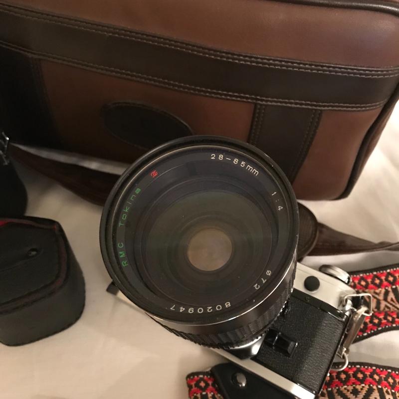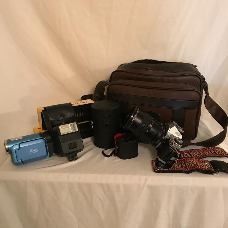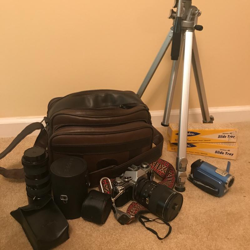 Canon AE-1 with strap, lenses ,Tripod and flash and a nice padded Diamond case to pack it all in. Lenses include a 70-150mm Soligor, a 50 mm Canon, and a 28-85mm Tokina. Lot also includes a Digital Concepts recorder and a plethora of empty slide cases.