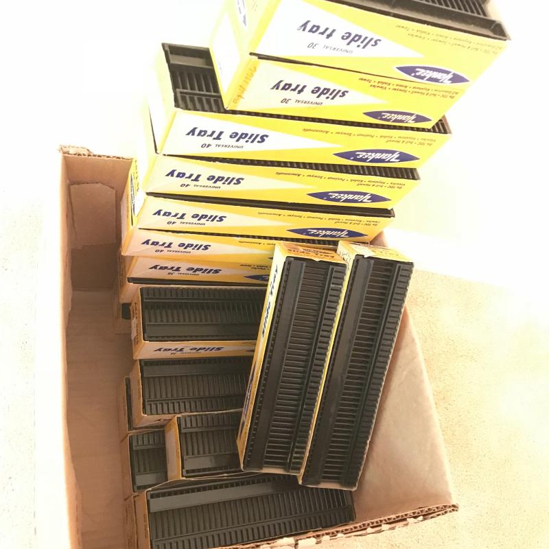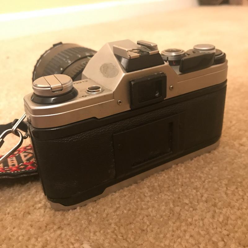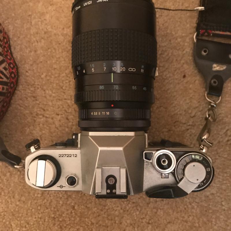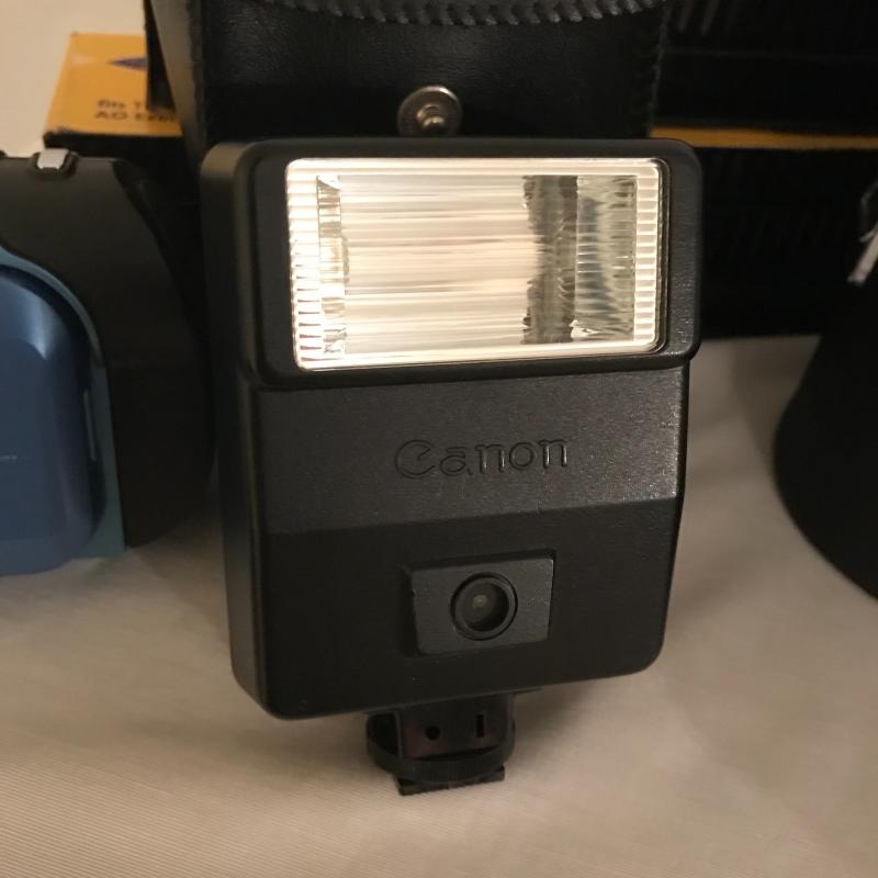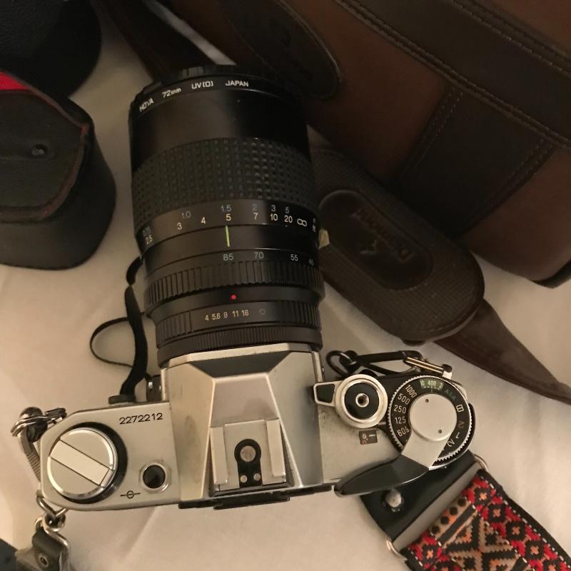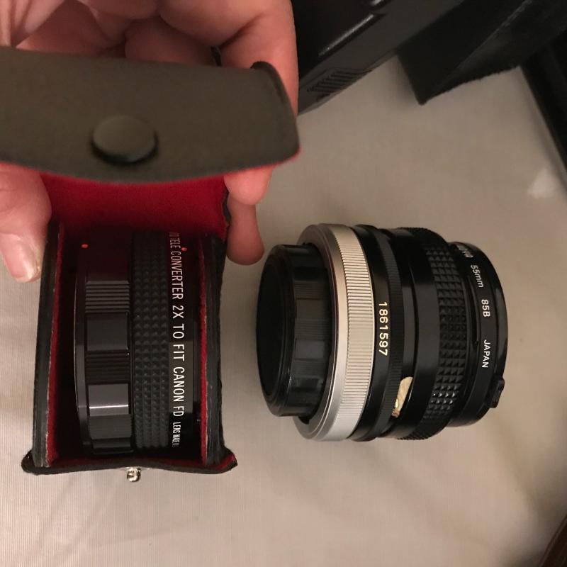 Canon AE-1 with strap, lenses ,Tripod and flash and a nice padded Diamond case to pack it all in. Lenses include a 70-150mm Soligor, a 50 mm Canon, and a 28-85mm Tokina. Lot also includes a Digital Concepts recorder and a plethora of empty slide cases.