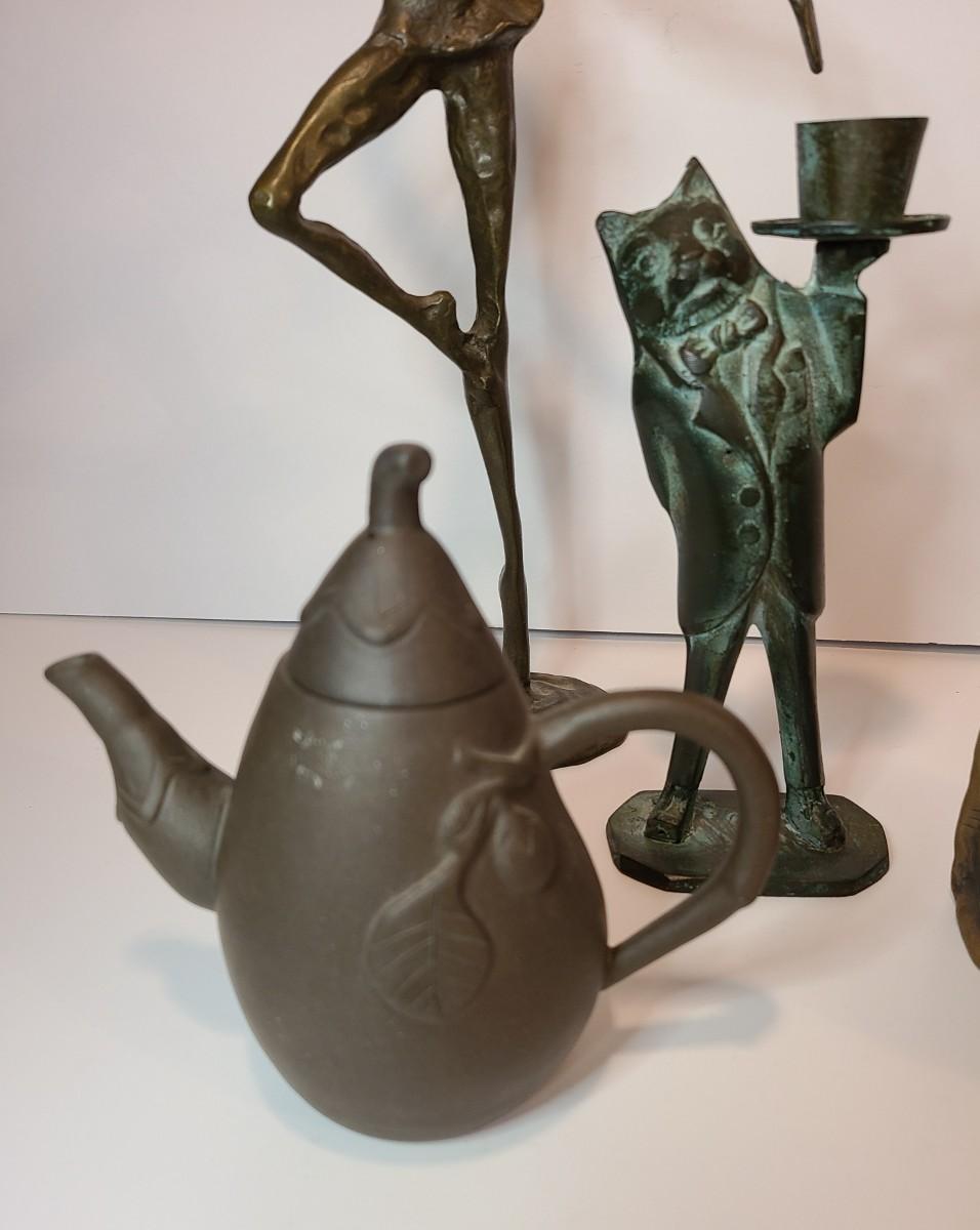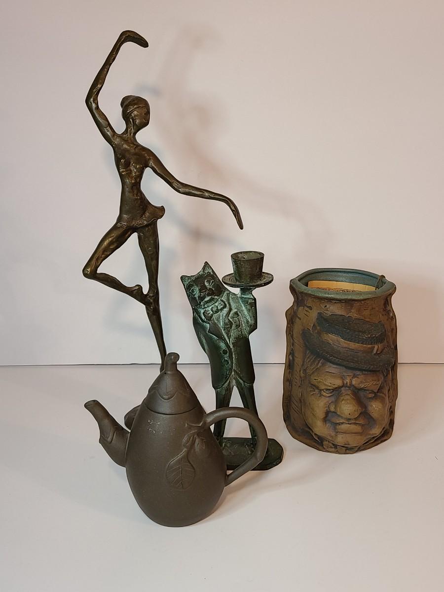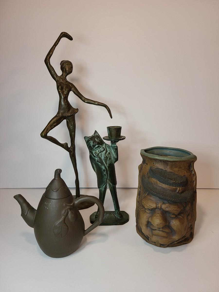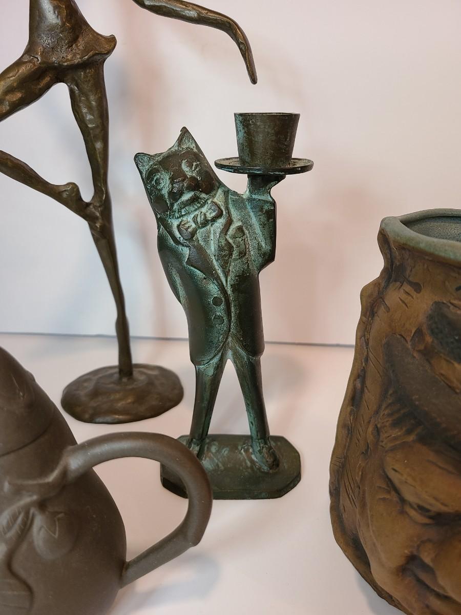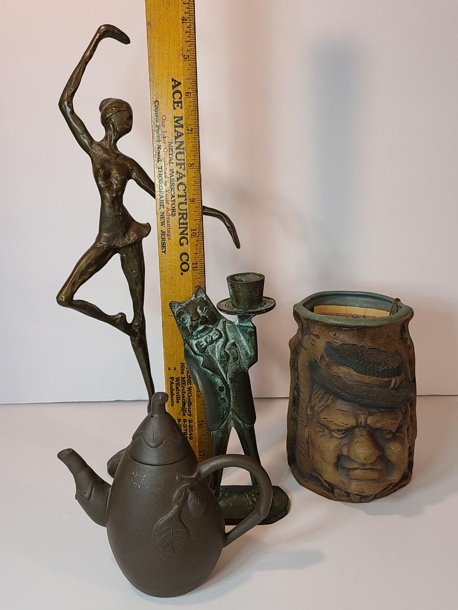 Nice lot of collectibles including a metal bronze color ballerina sculpture, a patina butler cat candlestick, Rumph pottery, and More!! Please see all pictures as they are the best representation of the items. The pictures show condition, measurements if taken, and what is included in the lot. Due to the large amount that we photograph and the time frame, we are not always able to take measurements. All items unless noted, are pre-owned and have been used. If you purchased furniture, you must bring help. We do not allow one person to carry large furniture out on their own. Bring help, tools and a truck for the safety of our client’s homes, and your personal safety. Company policy. Thank you.