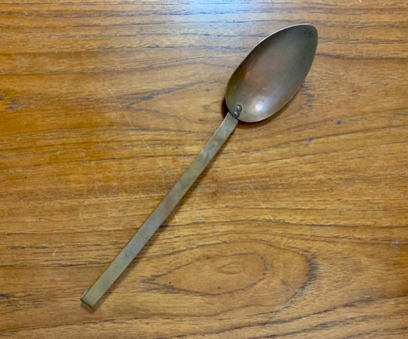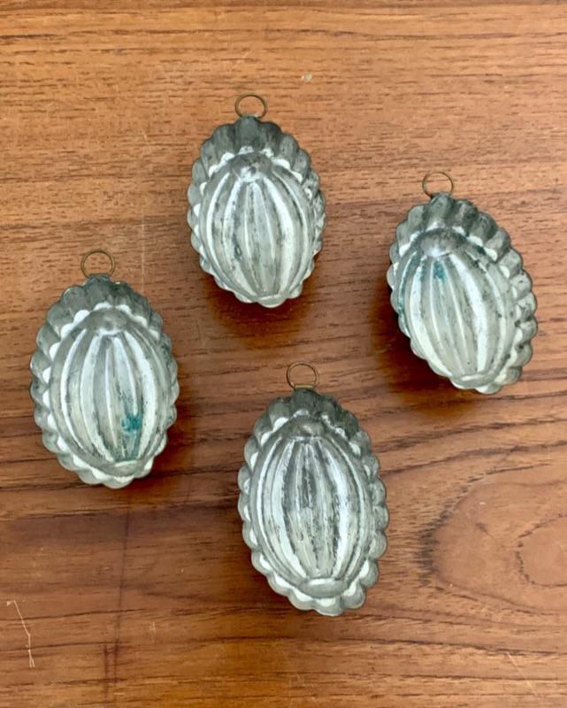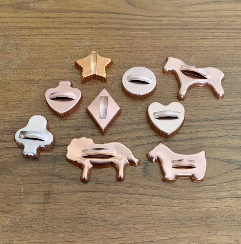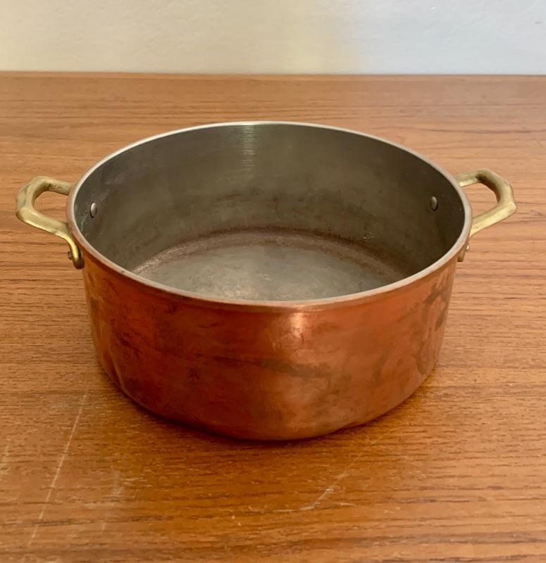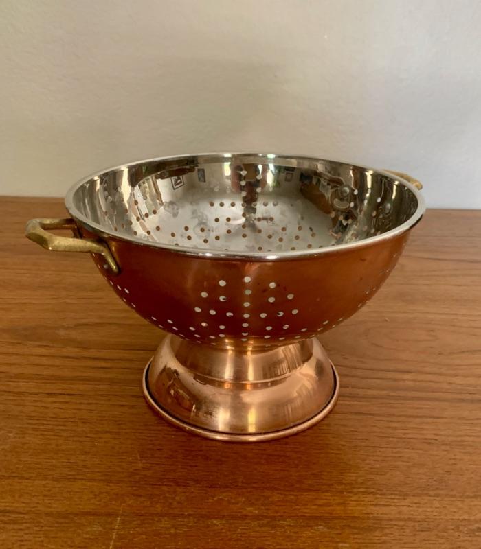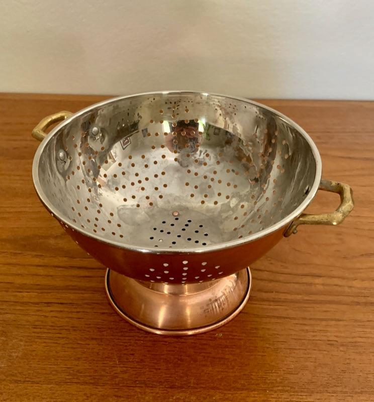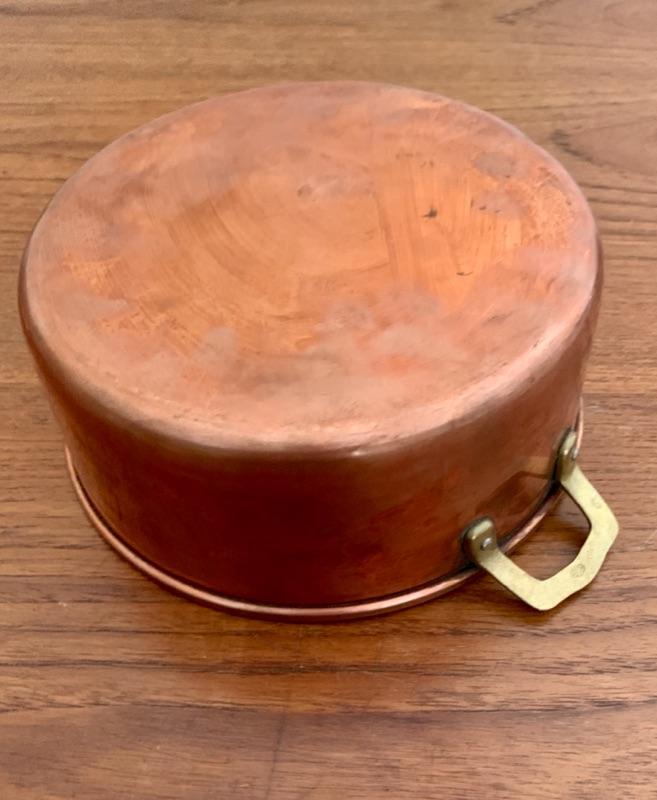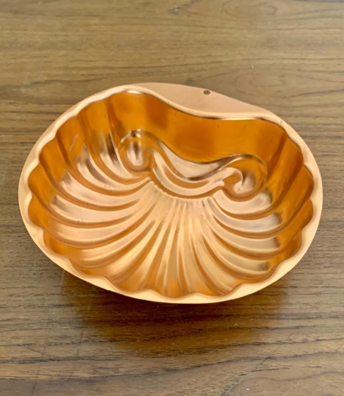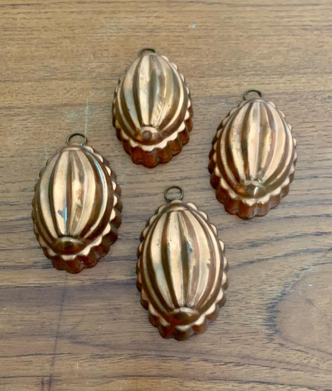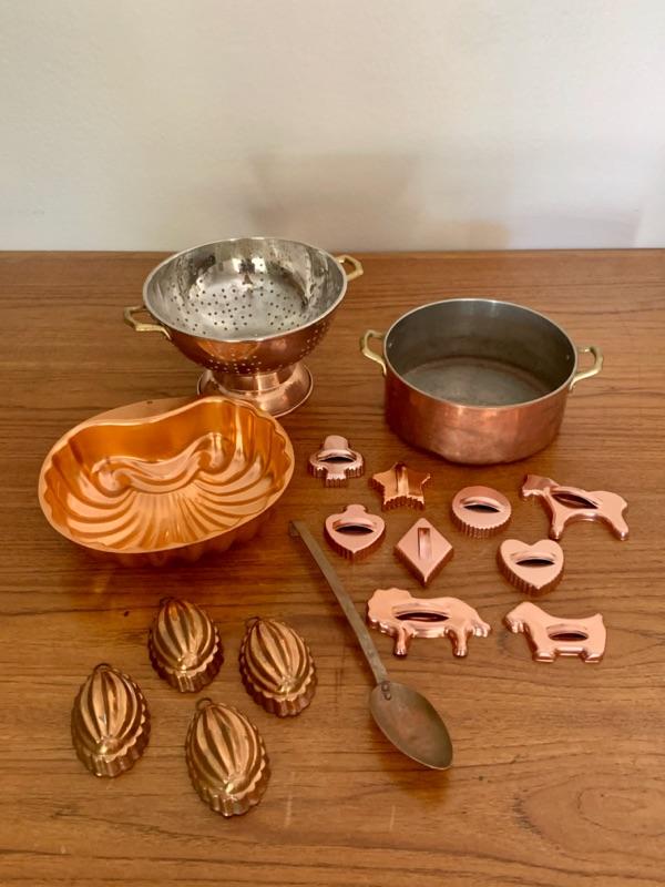 All in used condition with typical signs of wear for age. Includes: footed strainer (8 3/4" diameter x 5 5/8" h), copper spoon (11 1/2"), copper stock pot, stamped made in Portugal (8 1/4" diameter x 3 1/2"h)( 4 small melon shaped molds (3 1/2"), copper-tone cookie cutters and Wearever #2980, 6 cup mold.