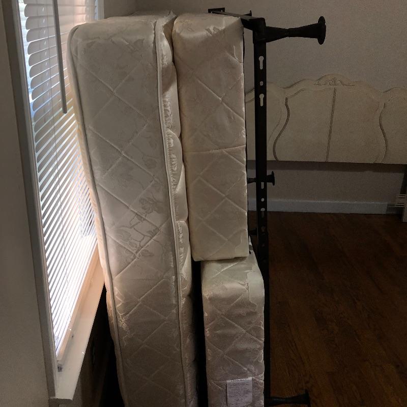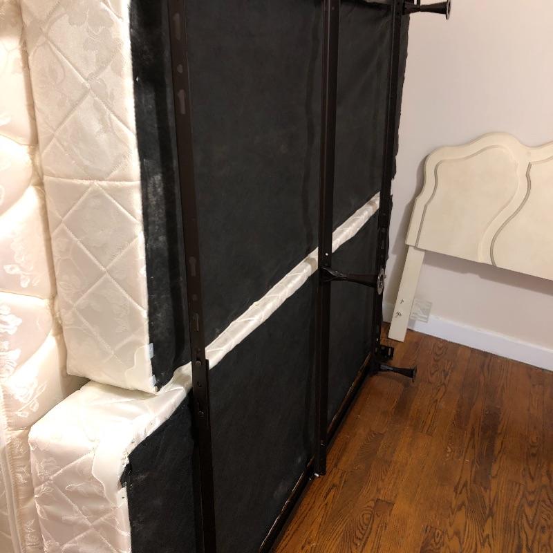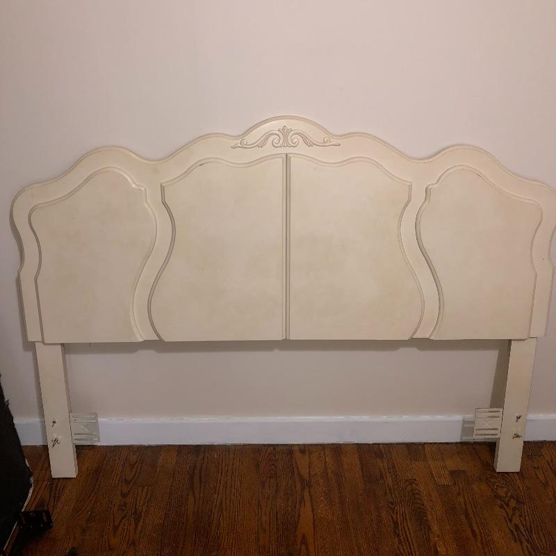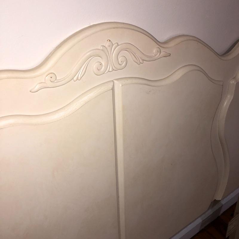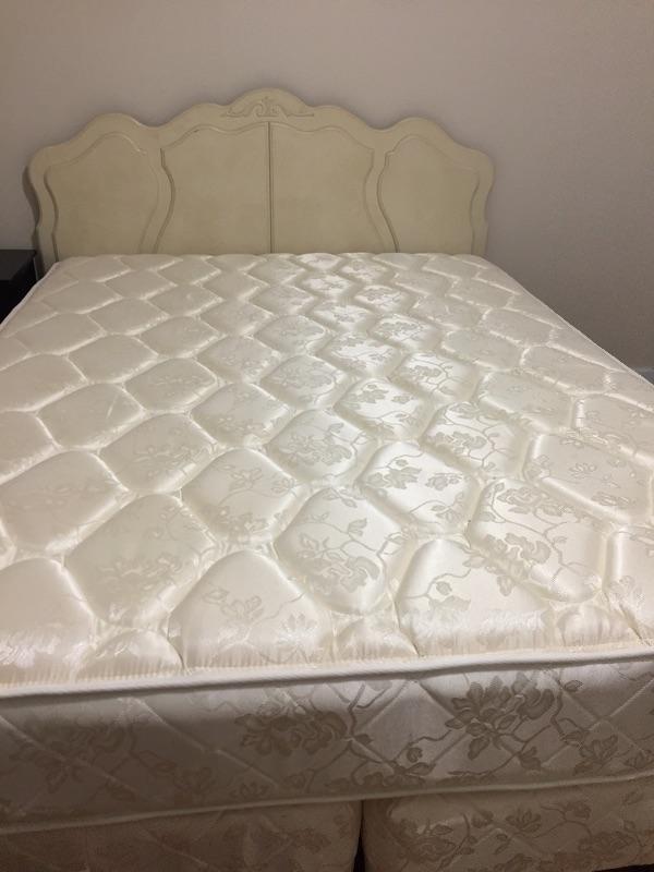 This queen bed frame measures 60” x 71”. It comes with a beautiful white Pressed wood headboard, measuring 62” x 46”. This headboard and bedframe make a beautiful match and will look lovely in any room. Local pickup only. Queen mattress and two single spring sets free to max bidder if interested.
