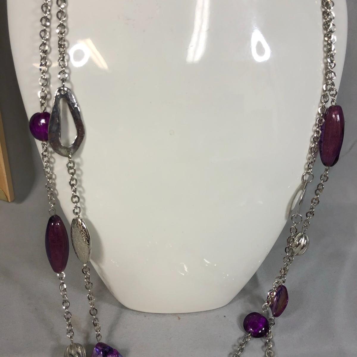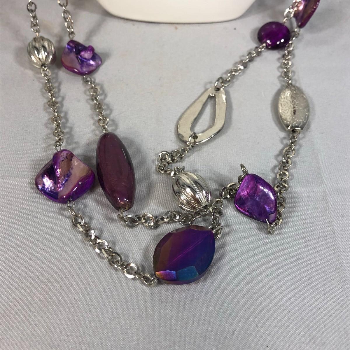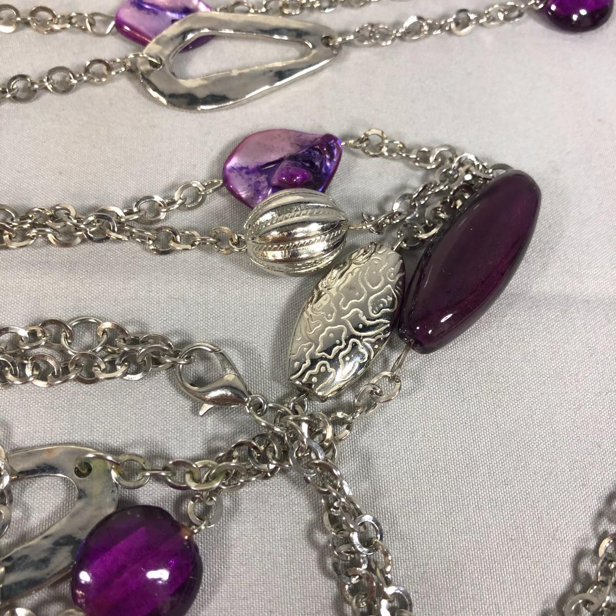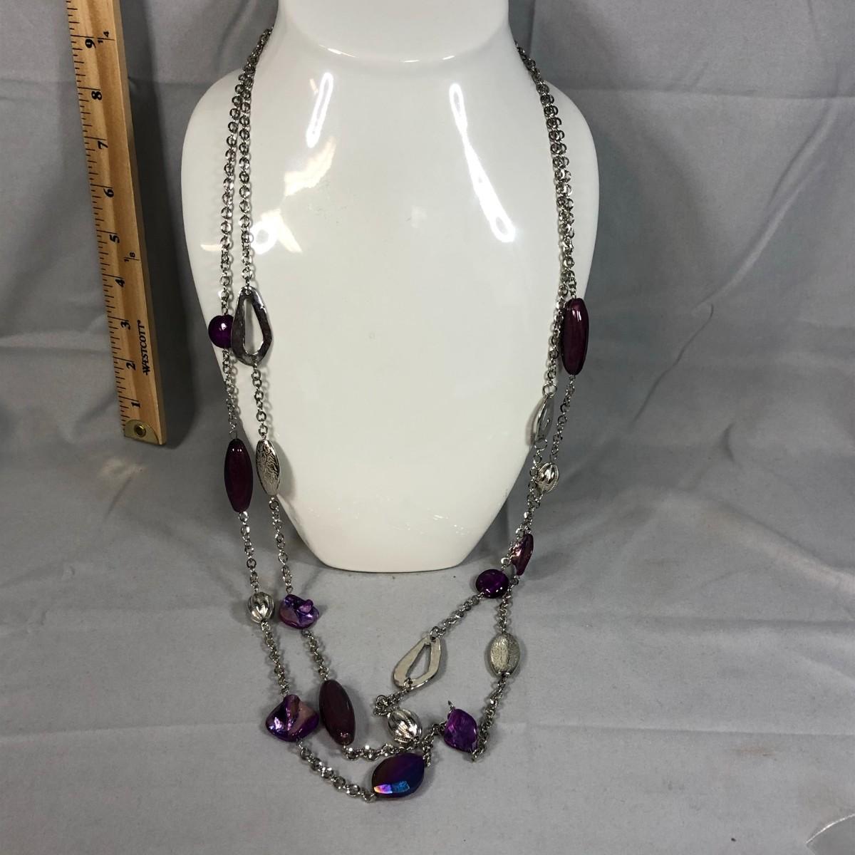 I love the shade of purple in this necklace (but then, purple is my favority color!). It hangs about 21" long and is in excellent condition. The purple beads appear to be glass.