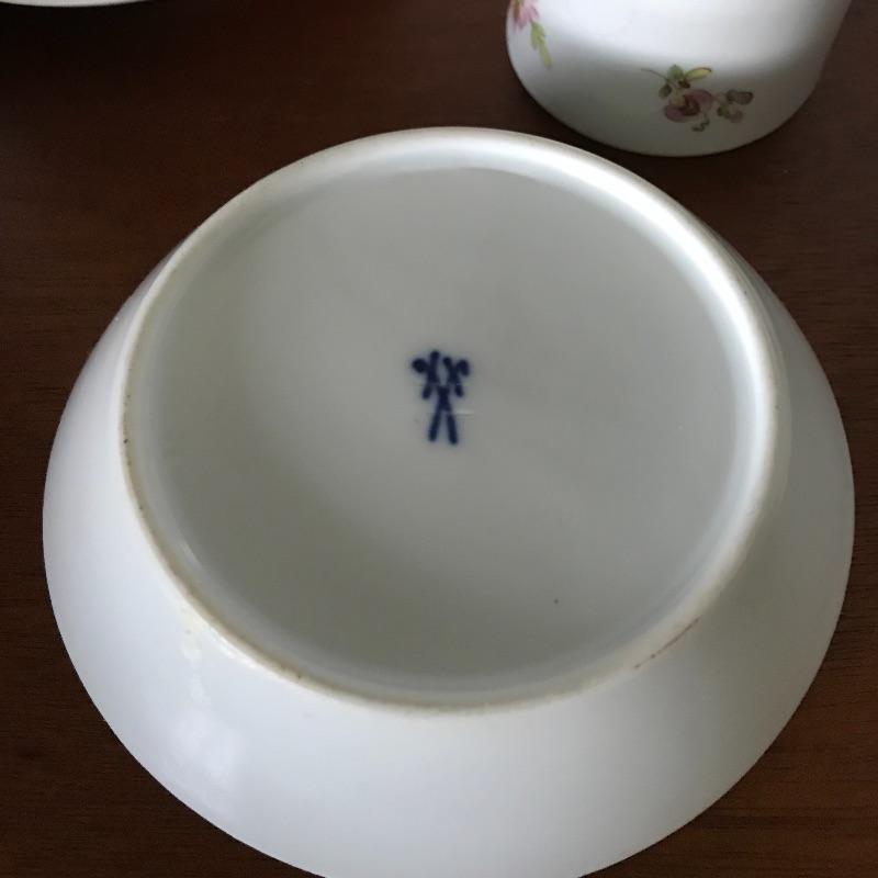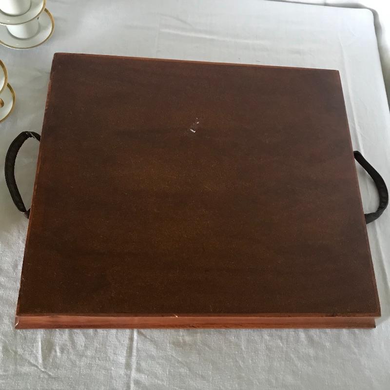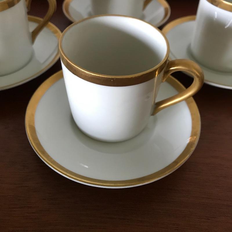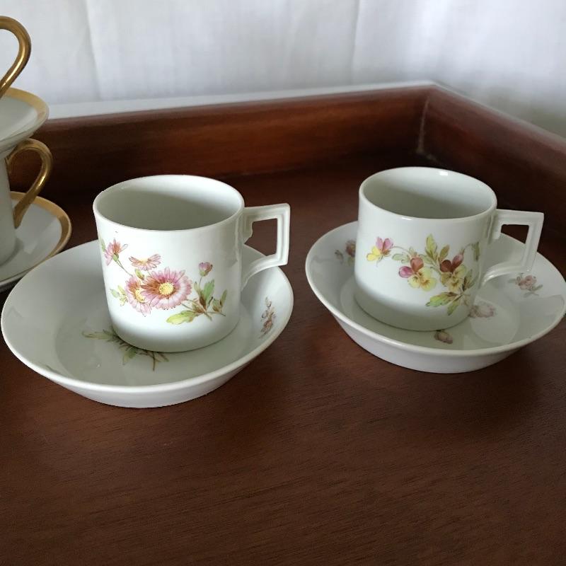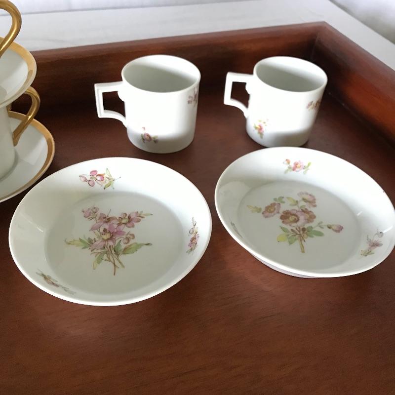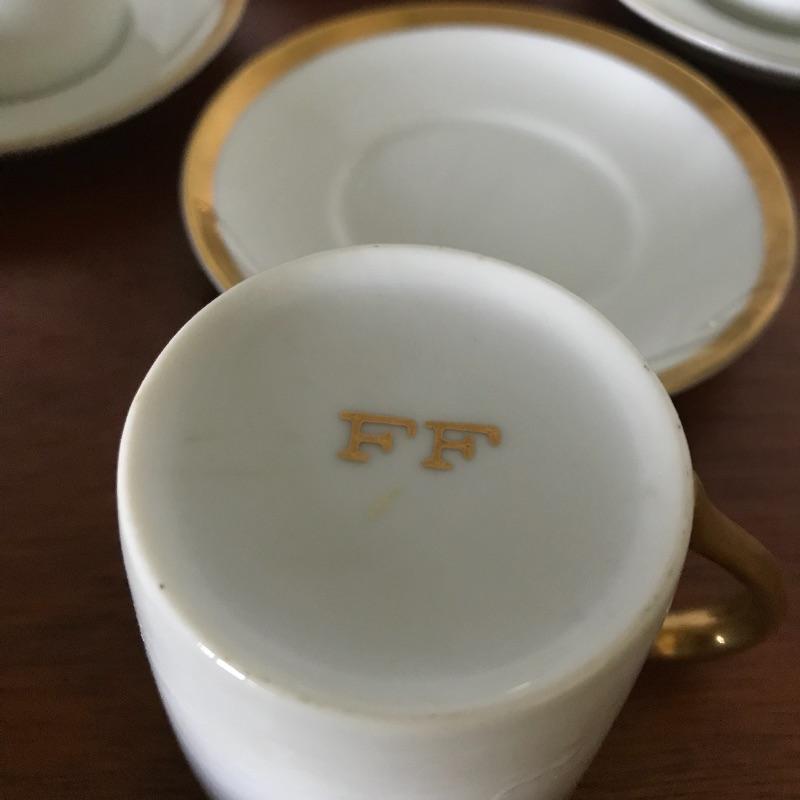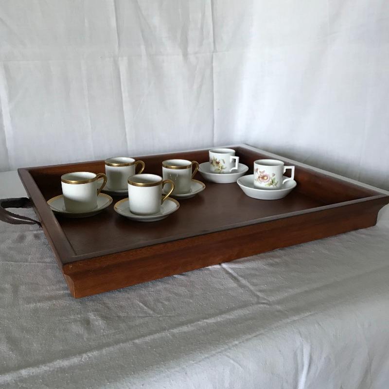 A set of four Fitz & Floyd FF demitasse gold rimmed espresso cups with saucers in fine shape. We’ve paired these with two floral cups and matching saucers. All this along with a wooden tray with leather like handles. The tray measures approximately 19” x 6.5”. See photos. Local Pickup Only.