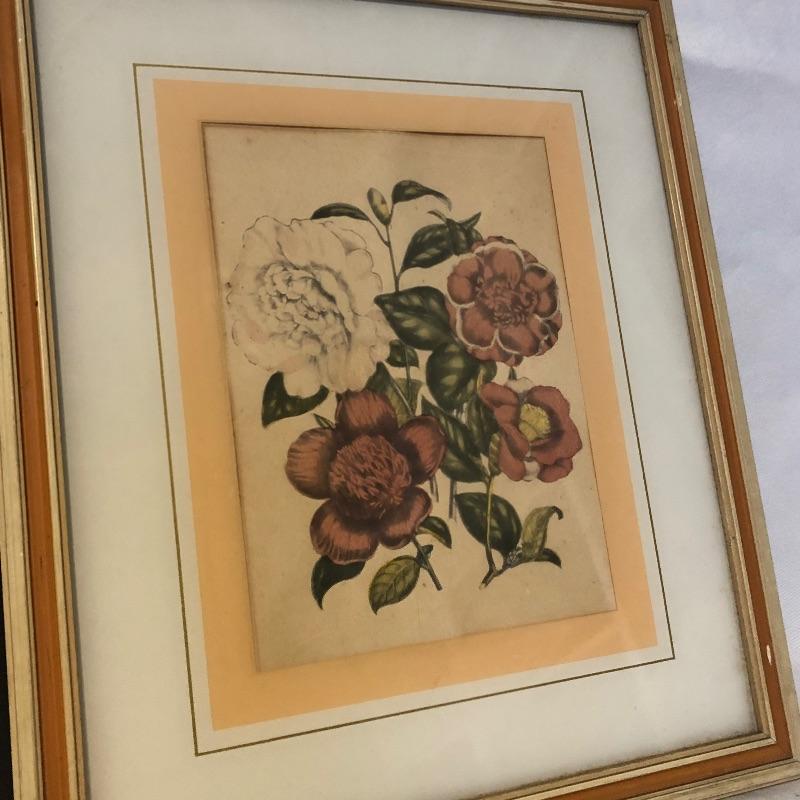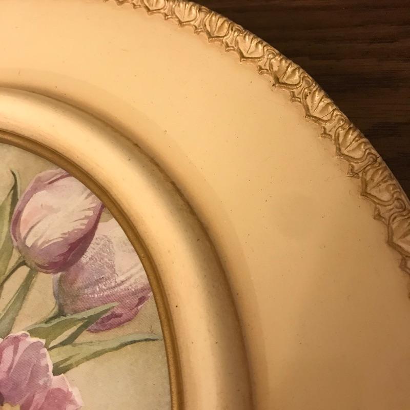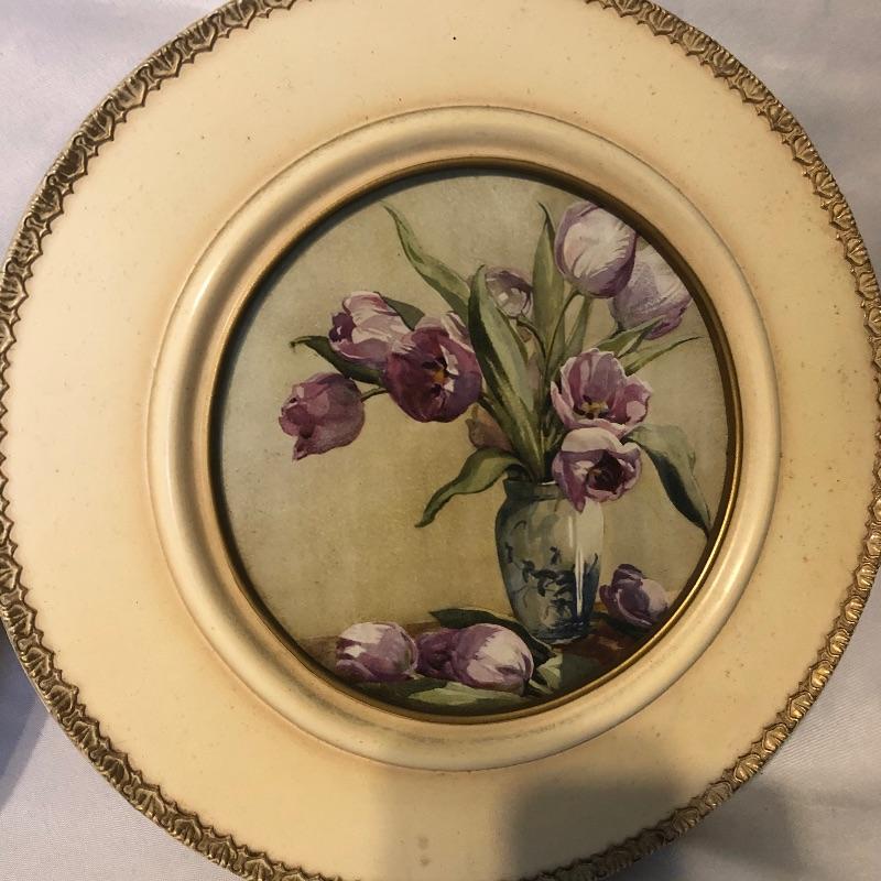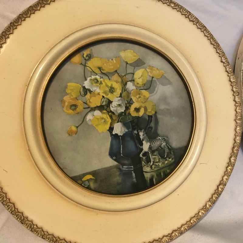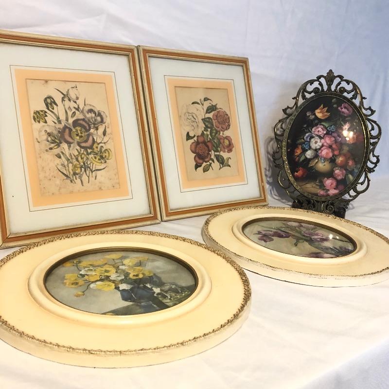 A total of five stunning floral scenes framed behind glass here. Two lovely matted color prints measuring 11” x 13”. Frames are tan and light orange; there are small blemishes on each frame and one picture seems to be discolored. There are two round framed pictures of flowers in vases, these wooden circular frames are off white with gold patterned trim. Each round picture is approximately 13”d. The final picture is an ornate metal framed picture of roses. The frame is approximately 9” x 12”. This picture is backed with patterned felt. This is a great lot for any flower lover. Shipping Available.