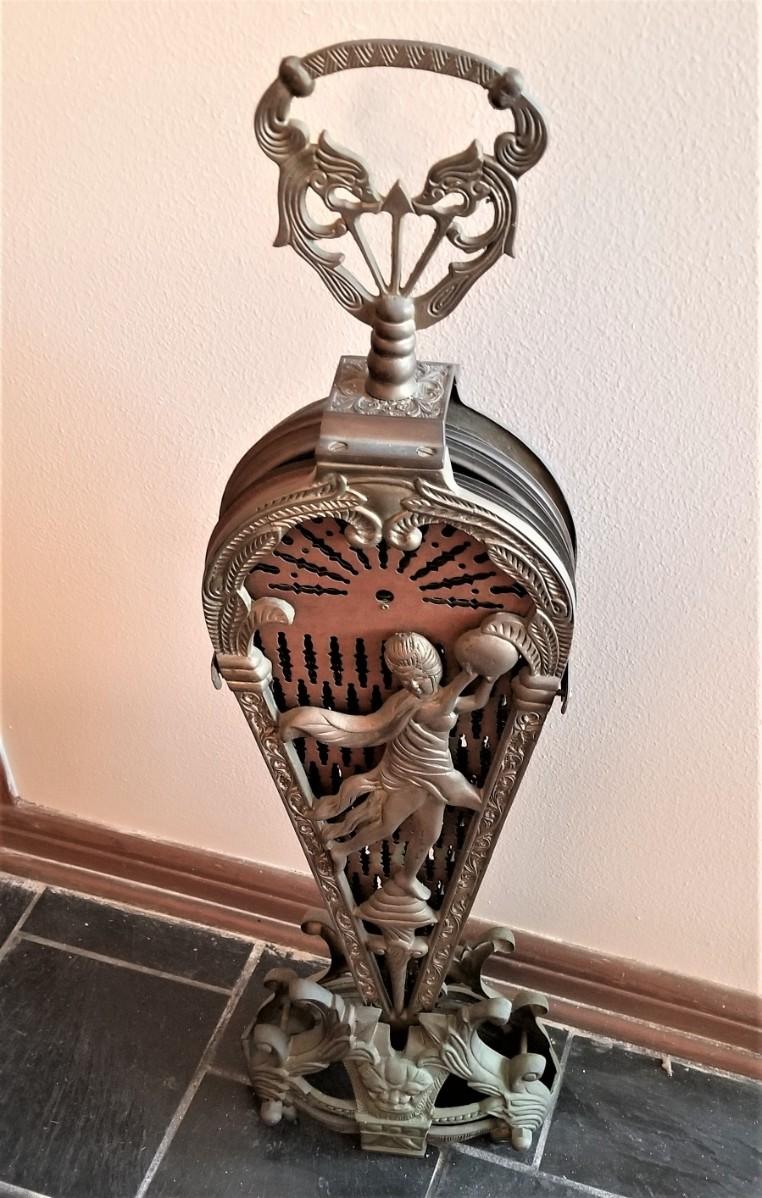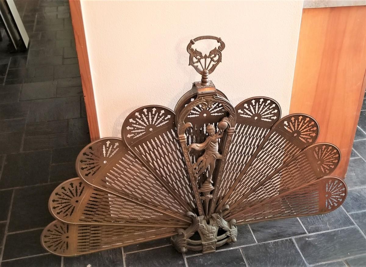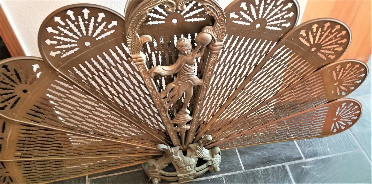 Interesting folding all-brass firescreen with Asian motif. Complete and in working condition. 34" tall, measures 47" across when fully extended. Heavy. I have not seen this particular design before.