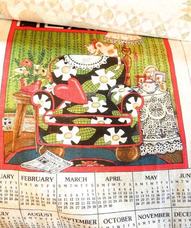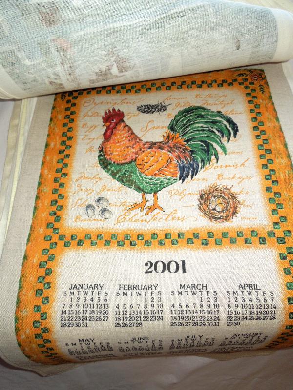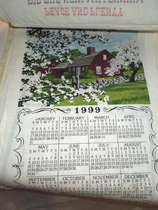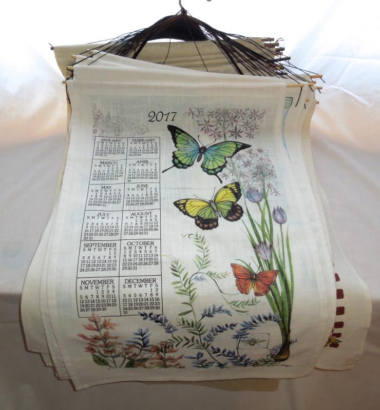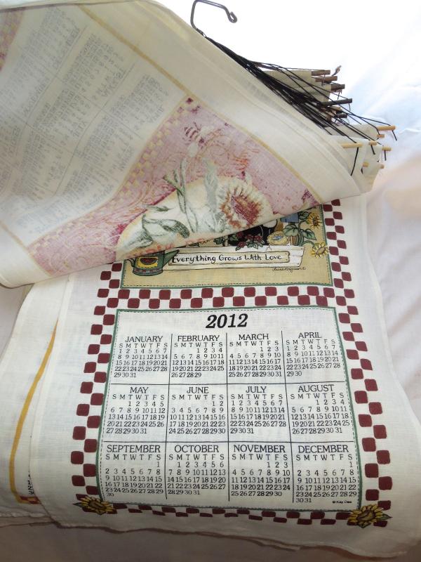 A very unique set of linen muslin wall calendars, each with a different printed ink design. Includes designs by Mary Englebreit, nature, country, farm and others. Would make a nice arts and crafts project if made into stuffed pillows or aprons. Each is on a wooden rod with heavy string for hanging.