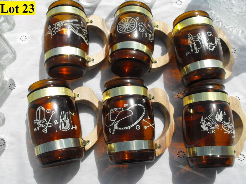 6 Brown Glass Mugs with Banded Wooden Handles. Decorated with Western Theme