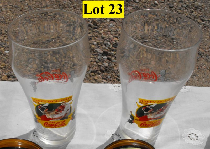 2 Glass Flintstones Mugs and 1 Batman Mug. 2 Coca Cola Christmas Glasses