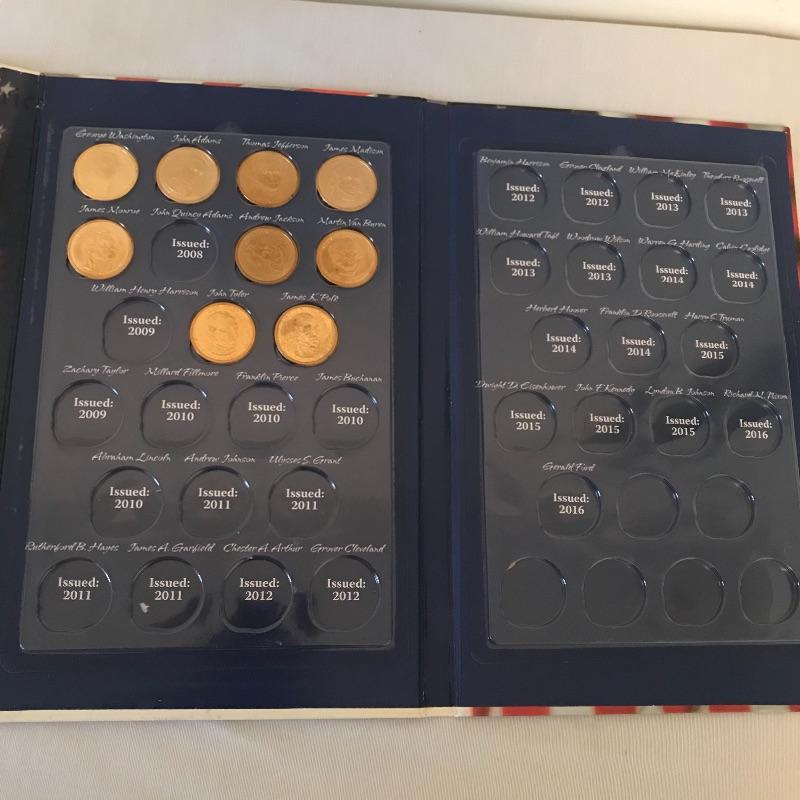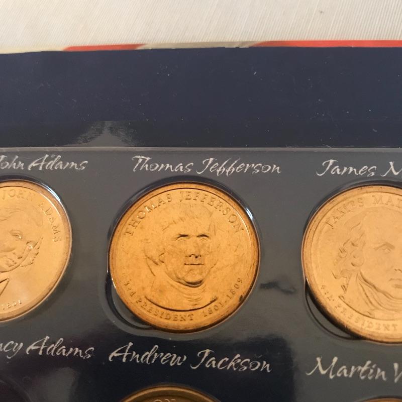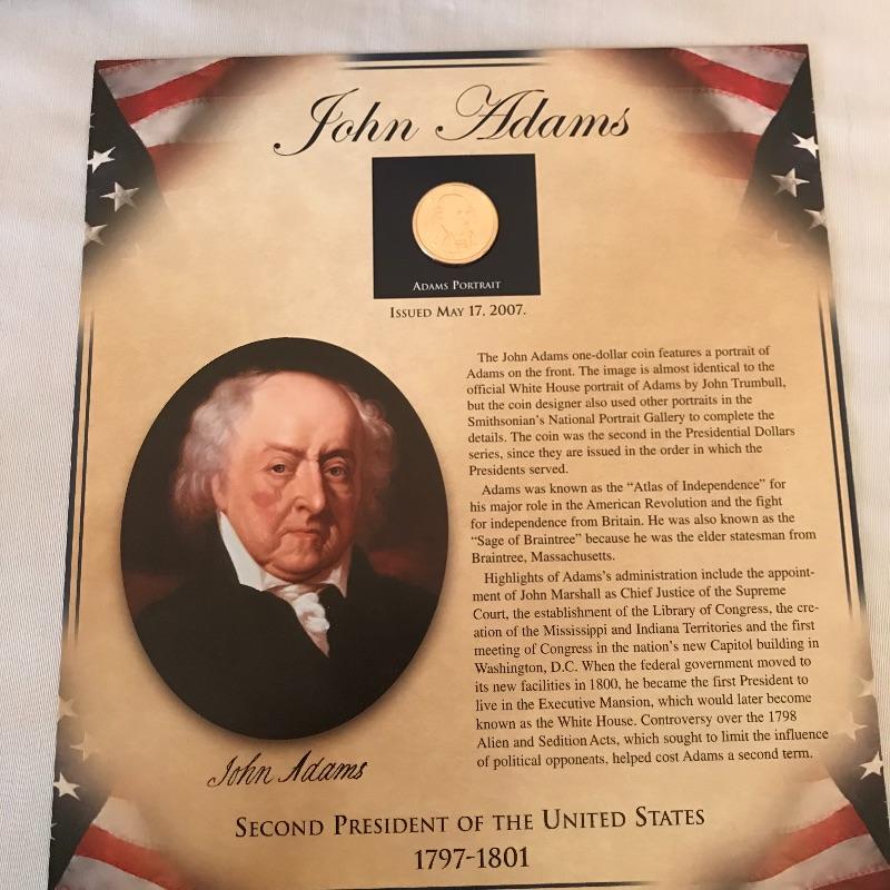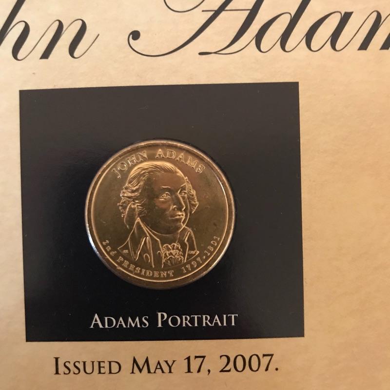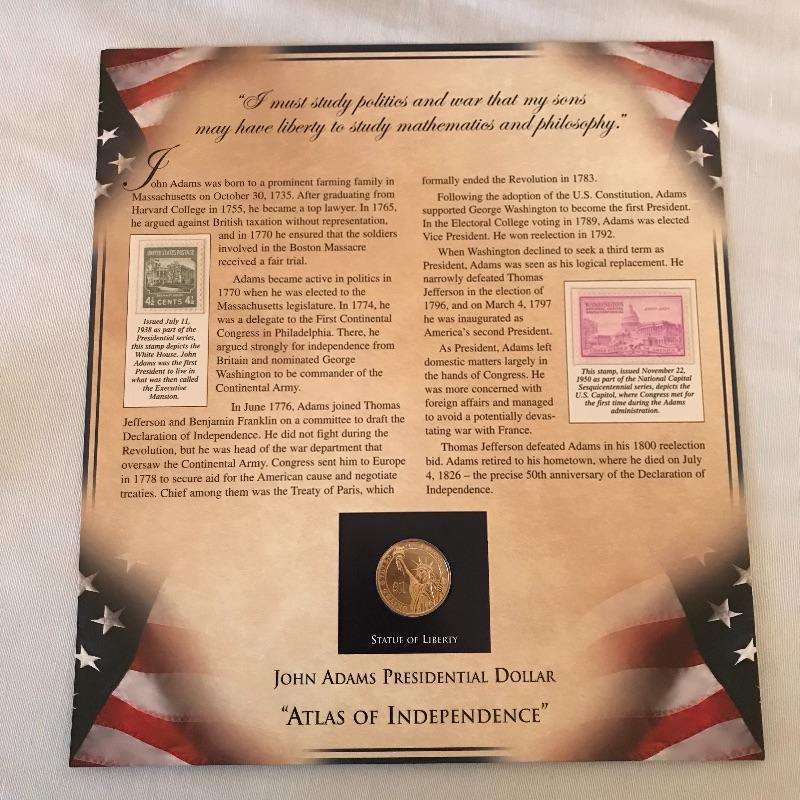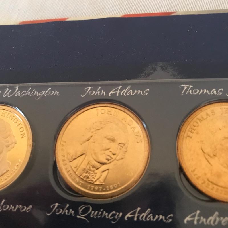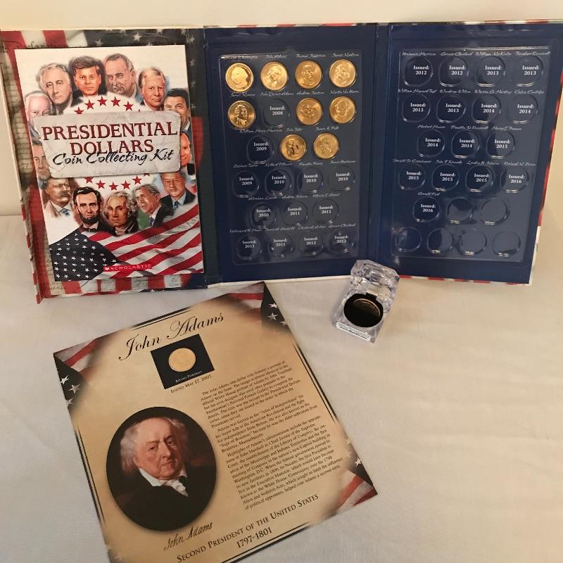 2000 JFK half dollar with a case that states 18k gold plated. John Adams 2007 dollar coin with two stamps. A Presidential Dollars Coin Collecting Kit with Book with nine coins. Collection also contains Silver Kennedy medallion See photos.