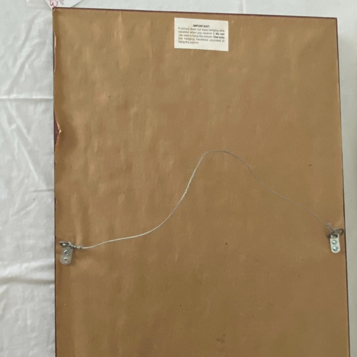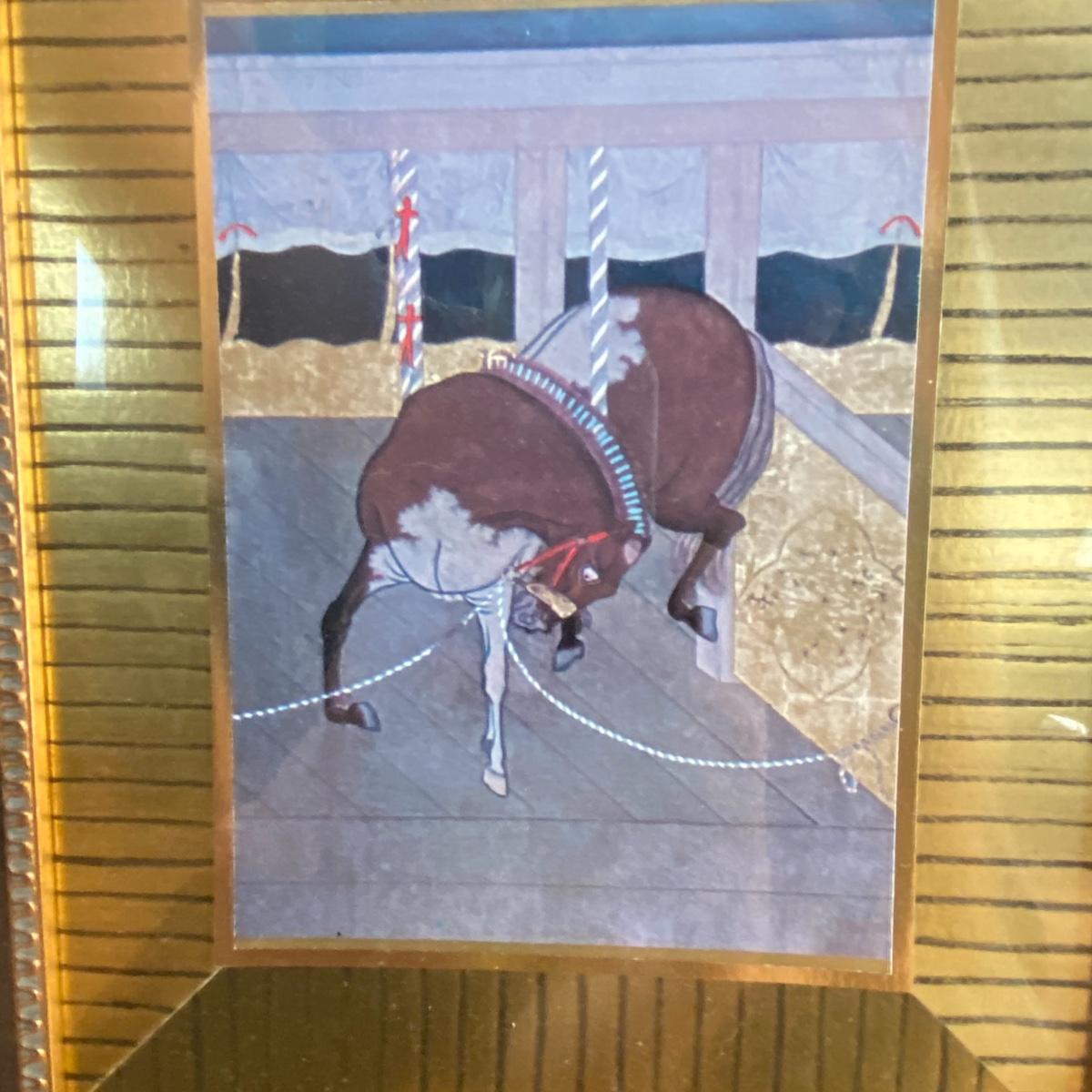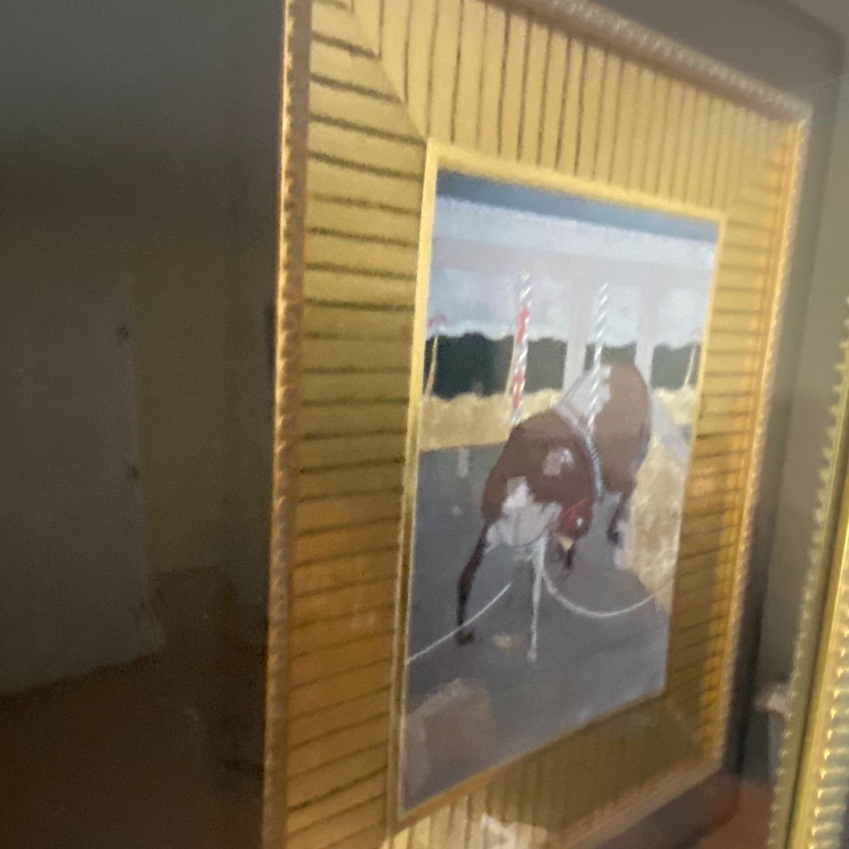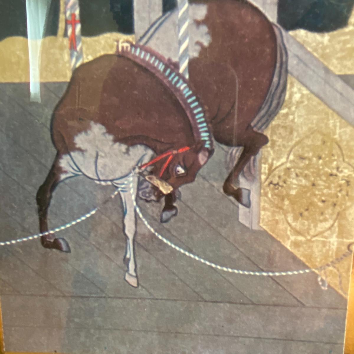 Large framed art piece with black and gold matting measures 18.5”x44”. The art depicts a bucking bull and is titled “derby” as per sticker on the back. No seen signature. See photos. Local pickup only.