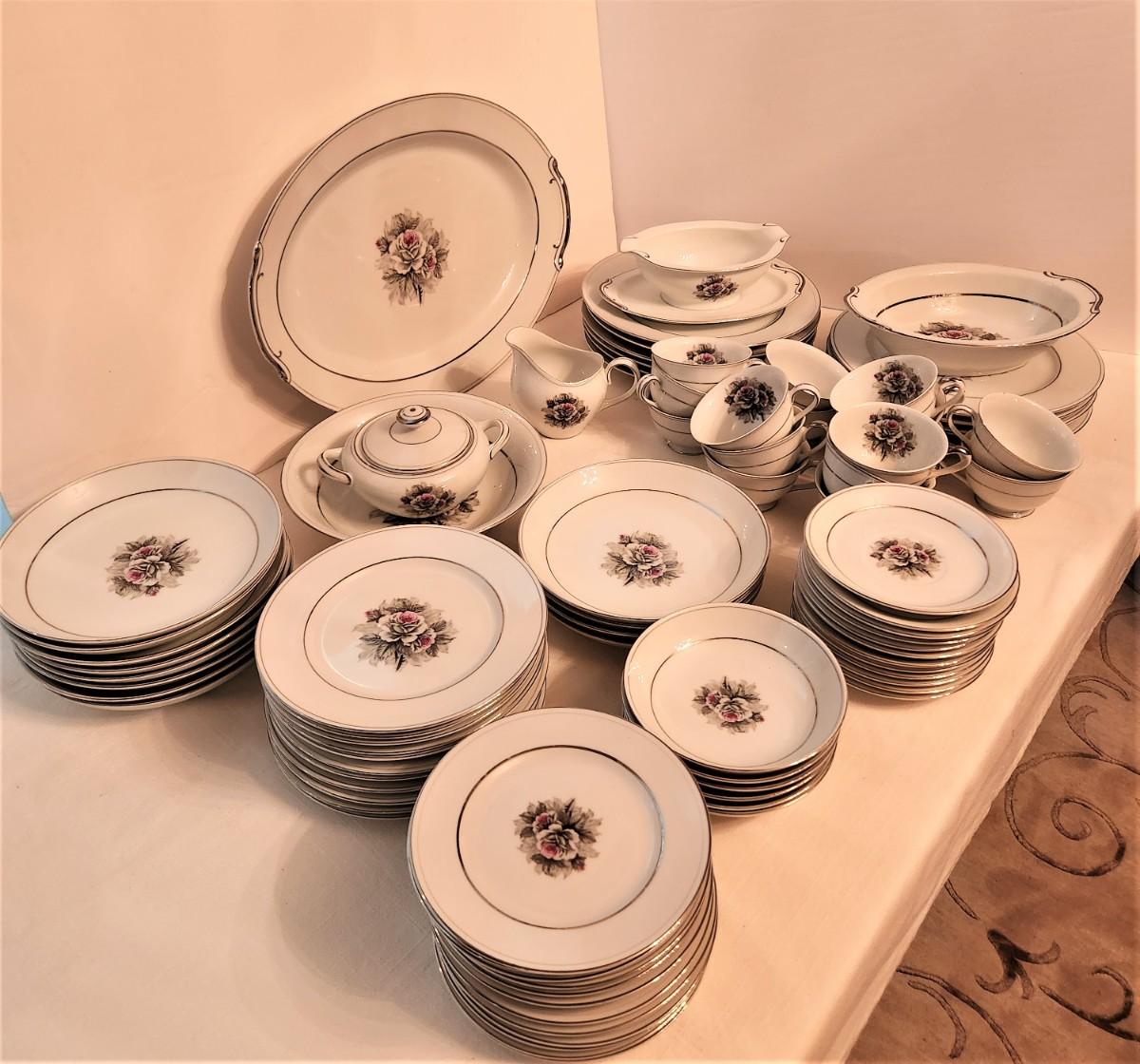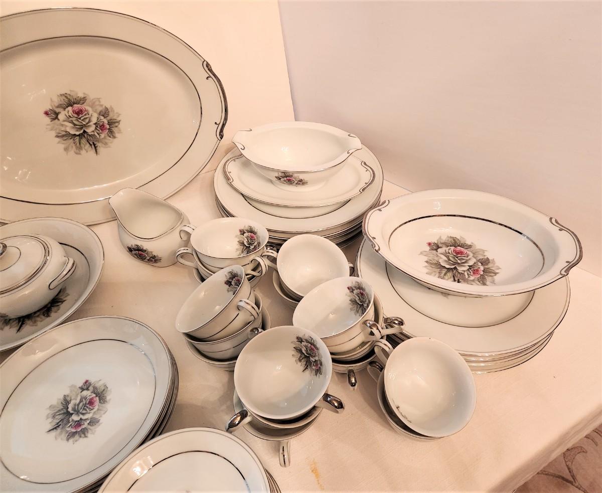 Vintage dinnerware set by Empress China in the "White Rose Pattern. 1950's/60"s. You get all you see here: 10 plates with platinum rim, 2 vegetable bowls, 12 bread/butter plates, 11 salad plates, 6 small bowls, 16 cups/12 saucers, 12 soup bowls, Large platter, cream/sugar, gravy boat w/attached underplate - all in good condition.