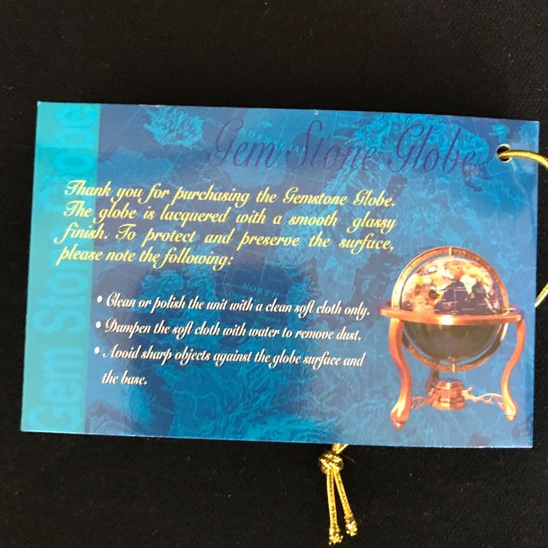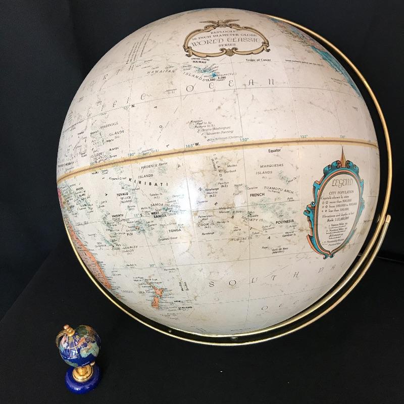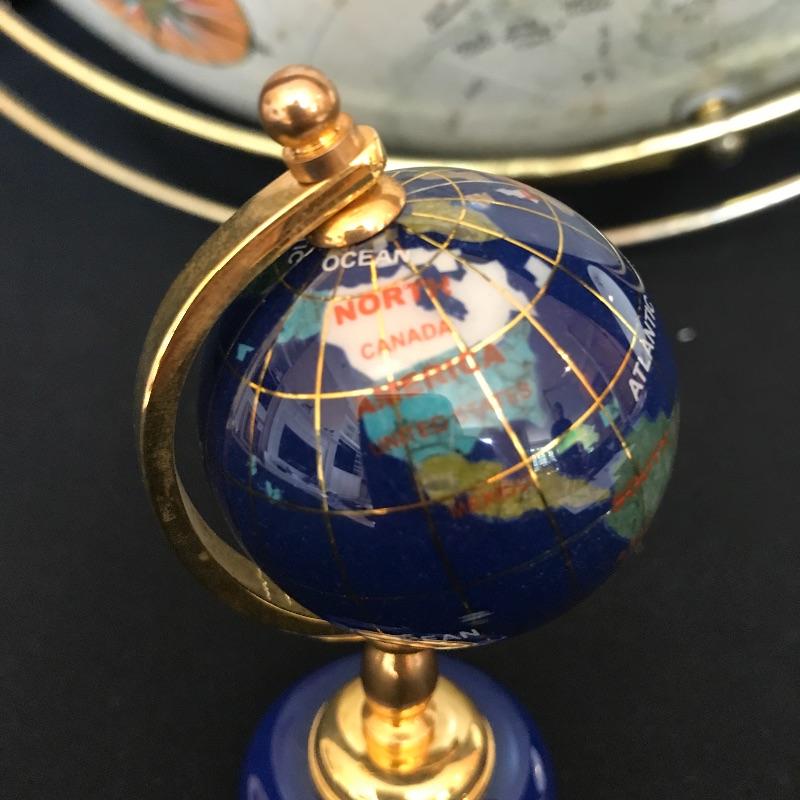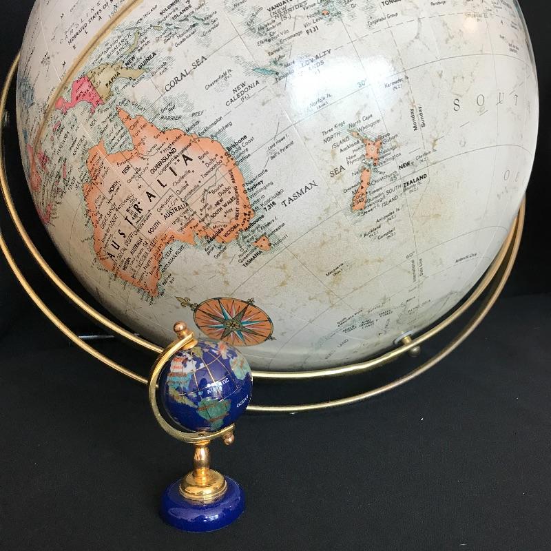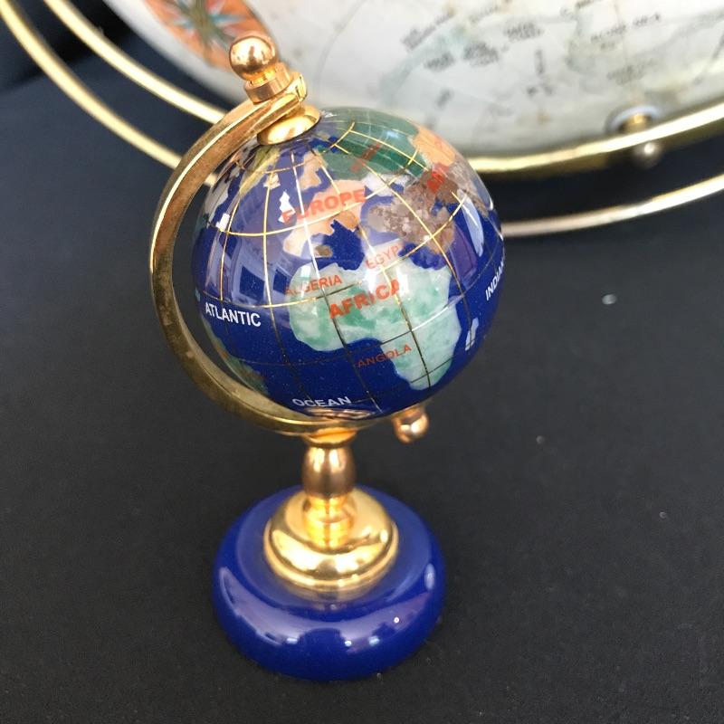 Two globes for the travel addict. One is a small Gem Stone globe that is wonderfully crafted and would look lovely on a table top. This piece of art is made of nearly thirty kinds of natural semi-precious stones on an elegant stand. Measures 4” tall. The other large globe is a 16” d Replogle globe. While it has the metal hardware, it does not include a stand. It is a World Classic series globe. Shipping available