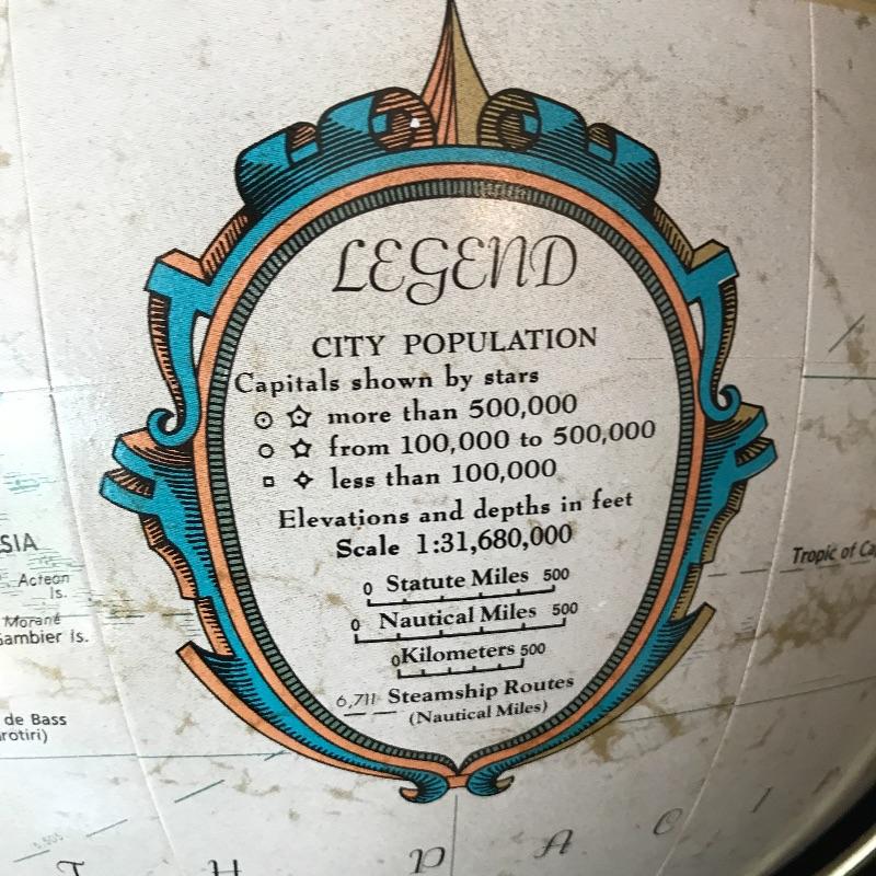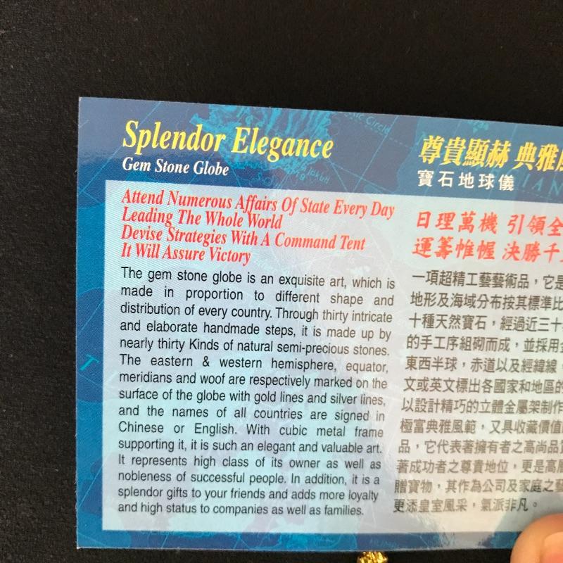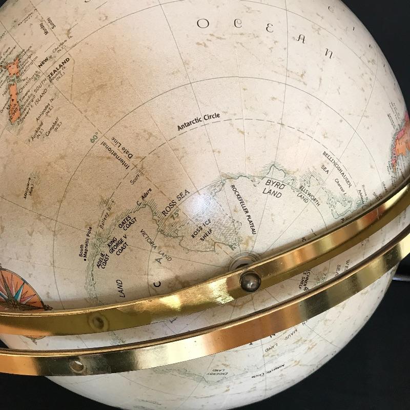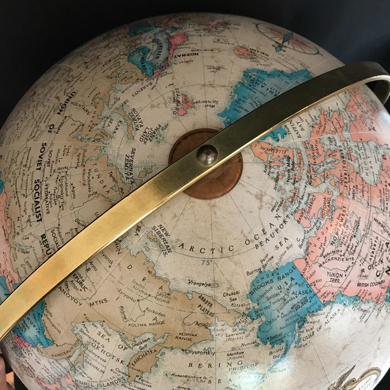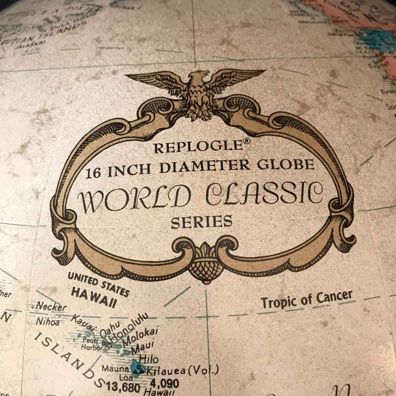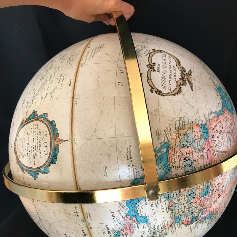 Two globes for the travel addict. One is a small Gem Stone globe that is wonderfully crafted and would look lovely on a table top. This piece of art is made of nearly thirty kinds of natural semi-precious stones on an elegant stand. Measures 4” tall. The other large globe is a 16” d Replogle globe. While it has the metal hardware, it does not include a stand. It is a World Classic series globe. Shipping available