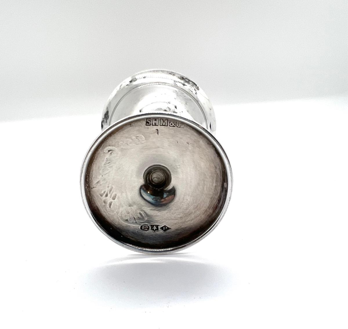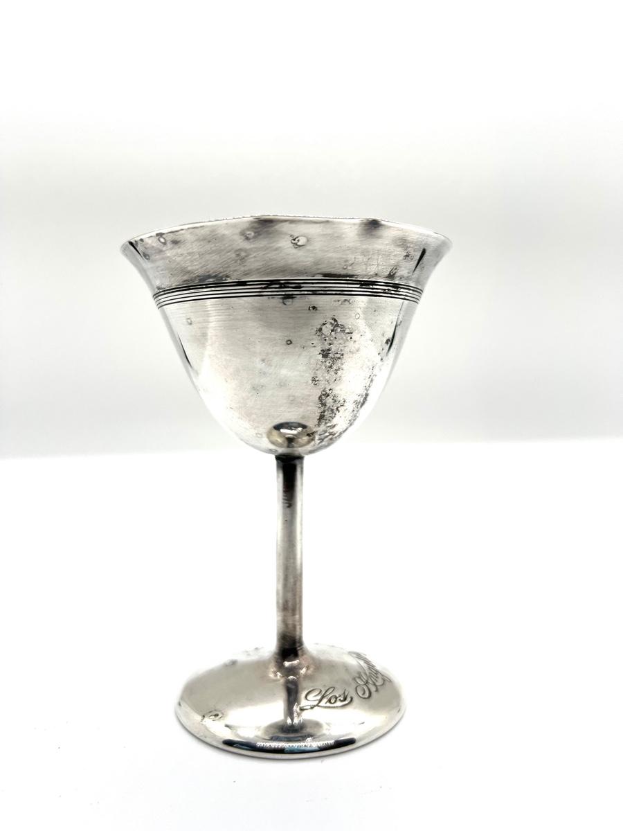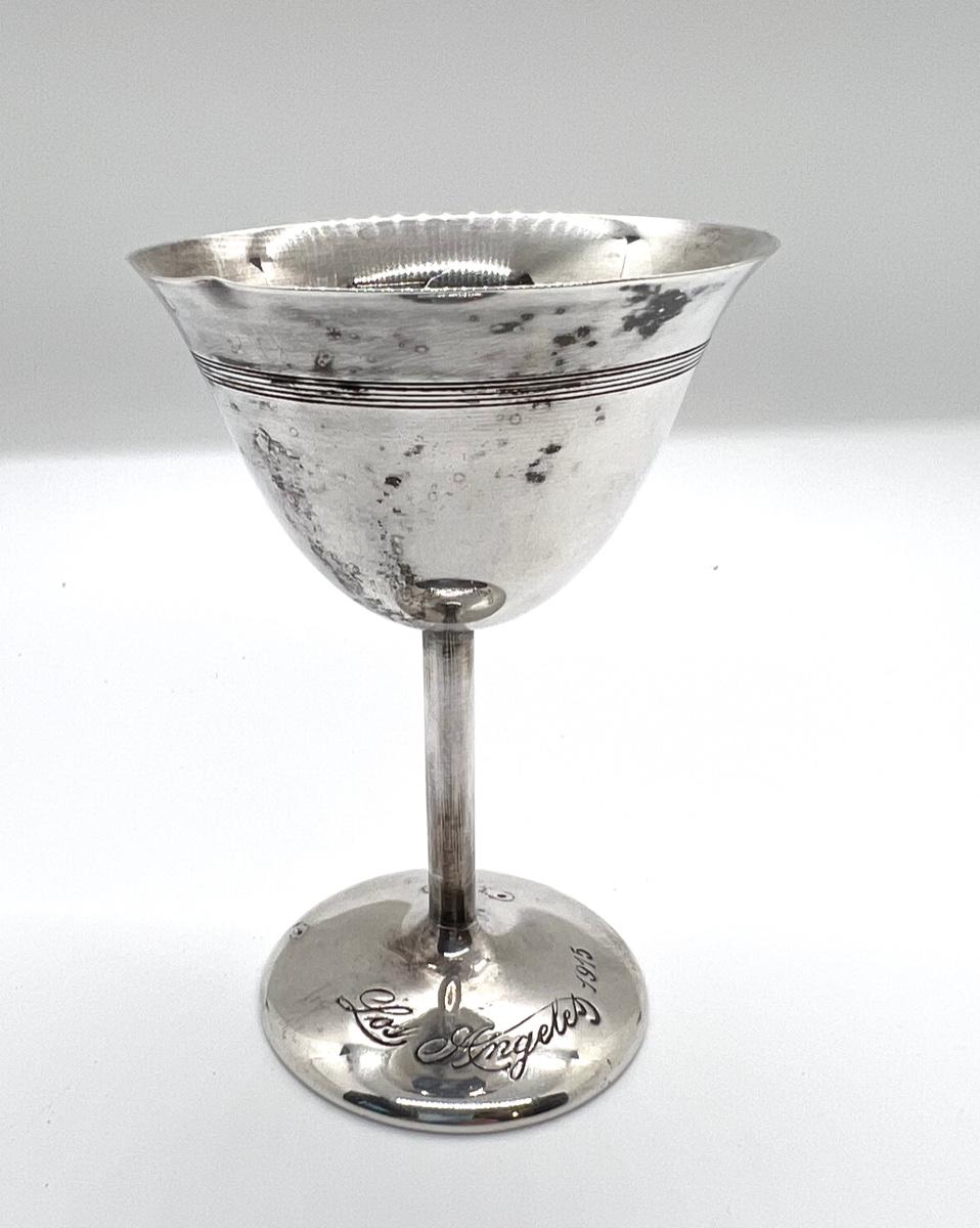 LOT 23 - Los Angeles 1915 Western Fruit Jobbers Association Silverplate Cup. Antique Simpson Hall Miller silver plate EP small cordial goblet. Across the foot is engraved Los Angeles 1915. Inside the bowl is the union logo for Western Fruit Jobbers Assn. It is 4 inches tall. There are some dings on the rim as you can see in the photos. This is part of the Nancy Ince Estate. Nancy is granddaughter of Thomas H Ince, a Hollywood film actor, producer and director from the 1920’s and Elinor Ince, an actress. She also was wife to Dick Probert, founder of Avalon Air of Catalina Island. This item can be viewed at our Green + Cate Showroom in Sebastopol on December 2nd -December 5th between the hours of 9am-5pm.