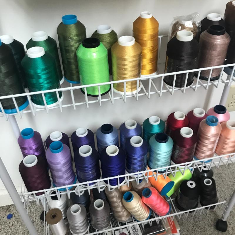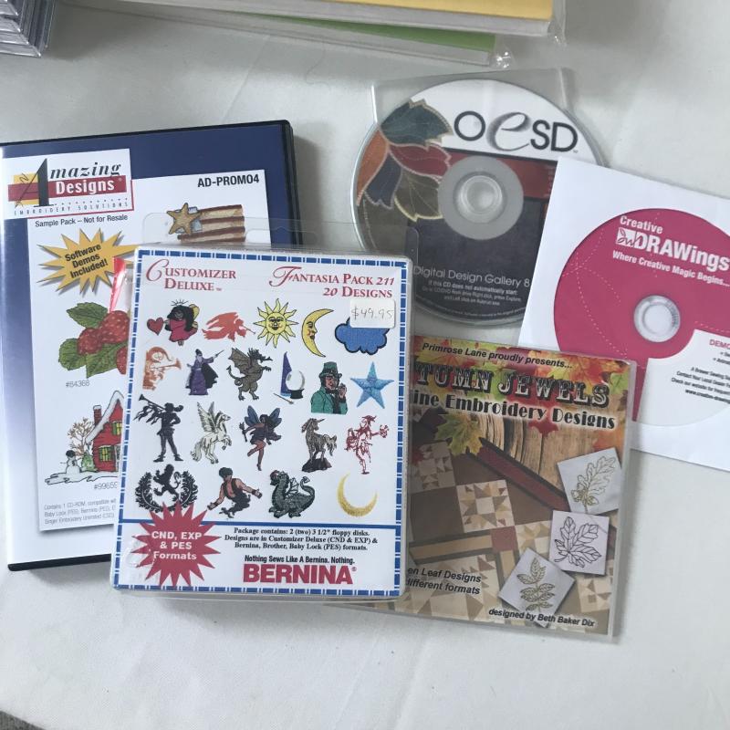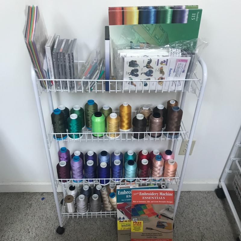 This lot has so many great accessories for your embroidery craft. There are three shelves of embroidery thread in a variety of colors. You’ll also find embroidery design cards and DVDs. Some are new in packaging with price tags of over $100. Also includes two how to books with CDs for embroidery machines. Thus lot comes with a handy rolling cart to hold the supplies. Shipping available if you don’t include cart. Cart measures 23” x 8” x 36”h