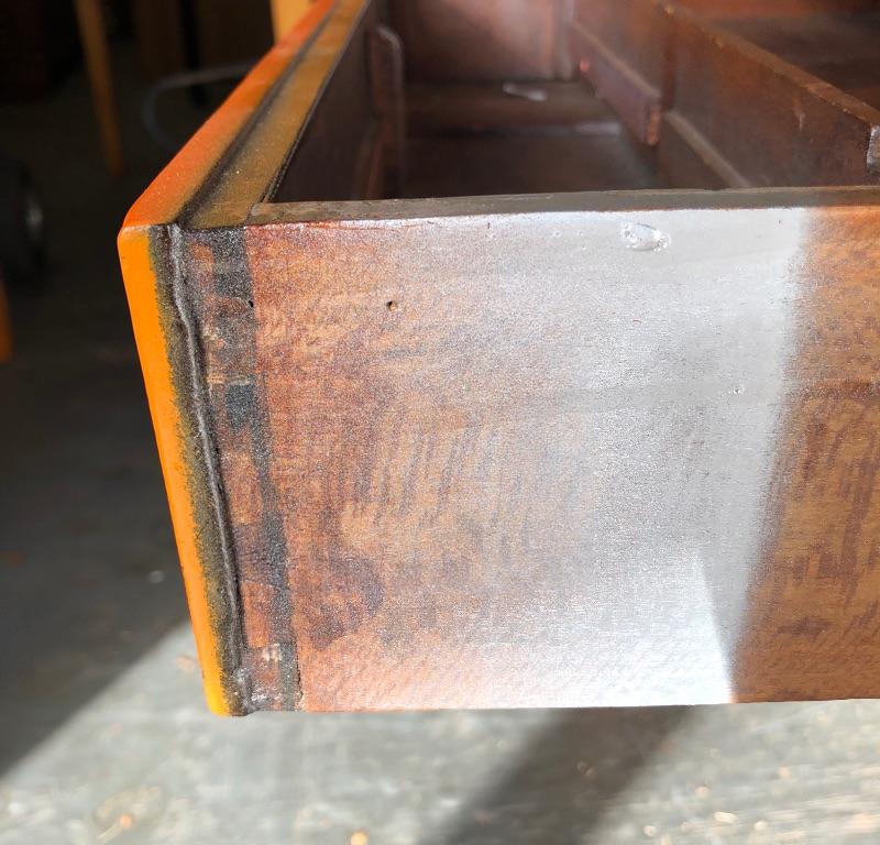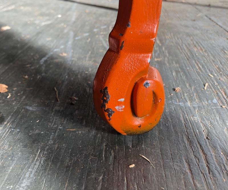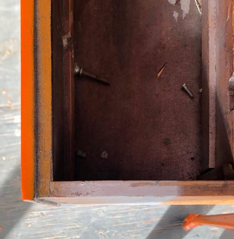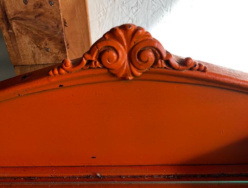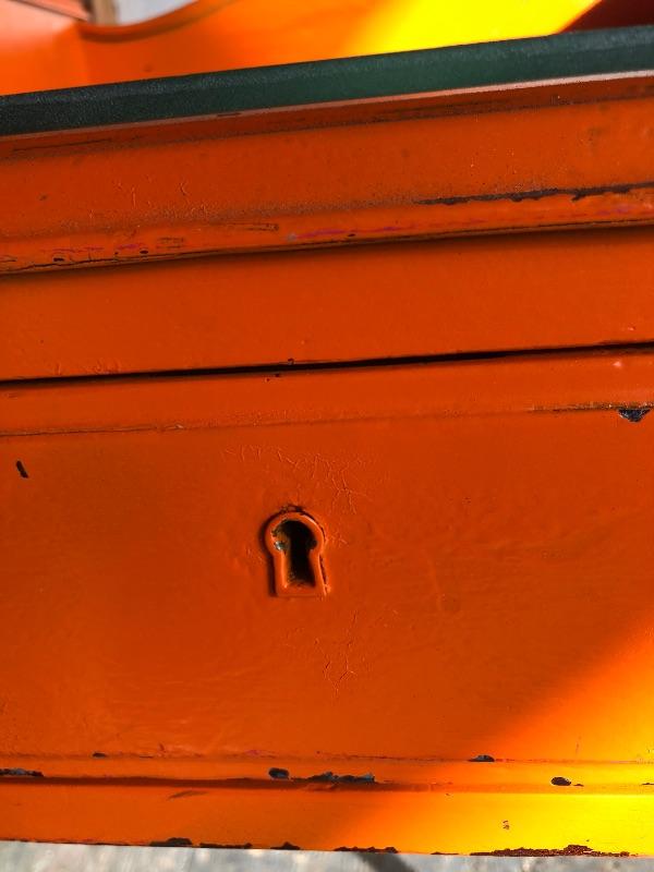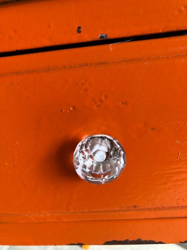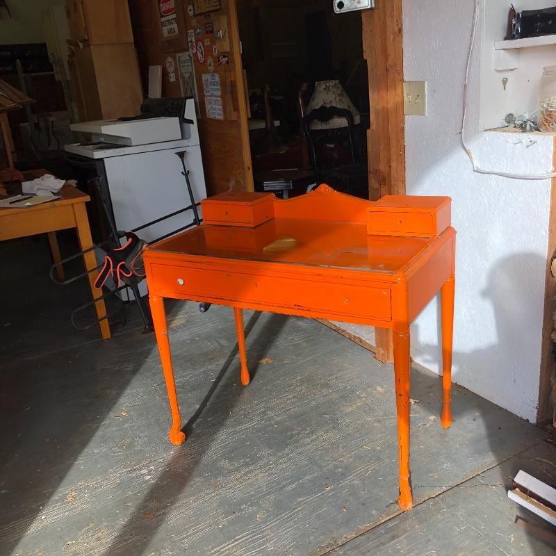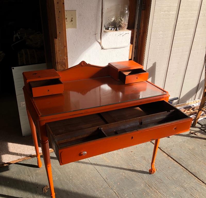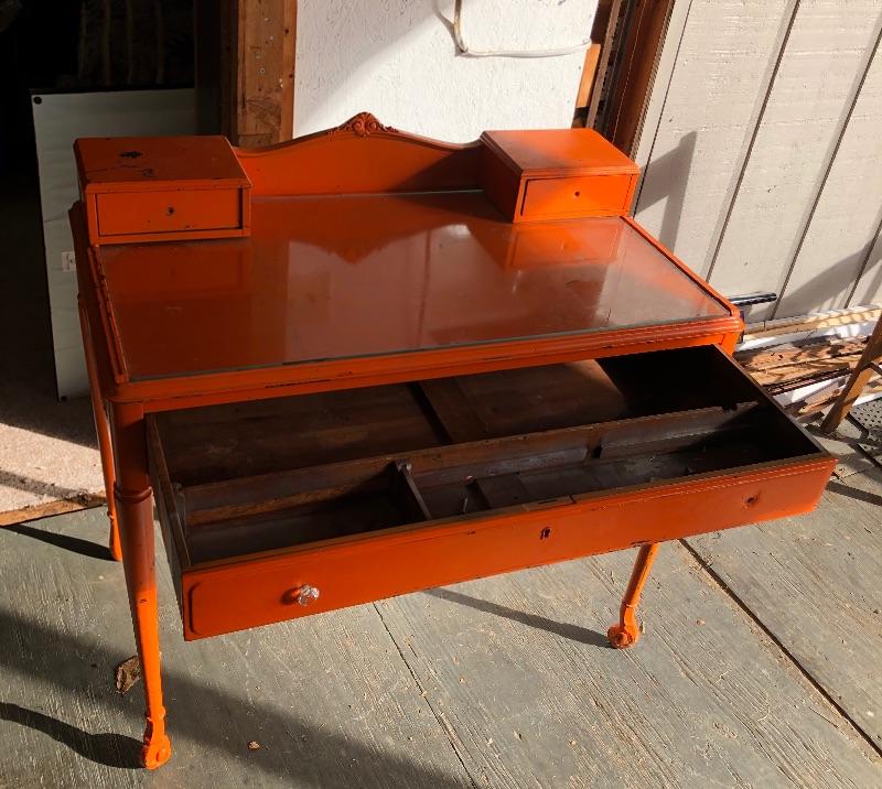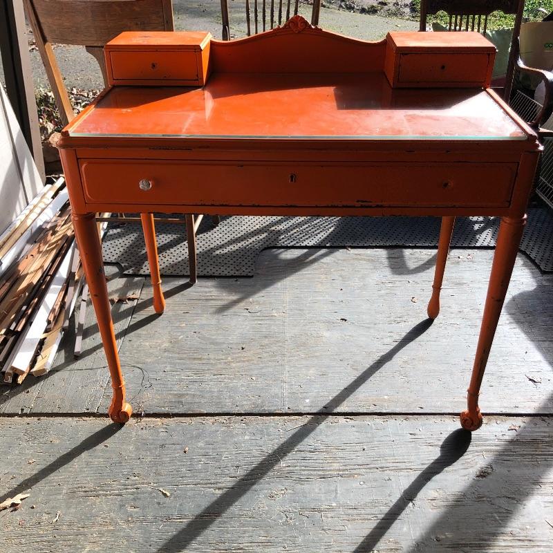This shabby chic retro desk is tangerine orange. It has a glass top, one main dovetailed drawer and two smaller drawers. It does have a lock in the main drawer, but no key and it is missing one of its glass knob pulls. Both of the two small drawers are missing their pulls. Leave it as for that vintage vibe or a fresh coat of paint and new pulls for that polished look.