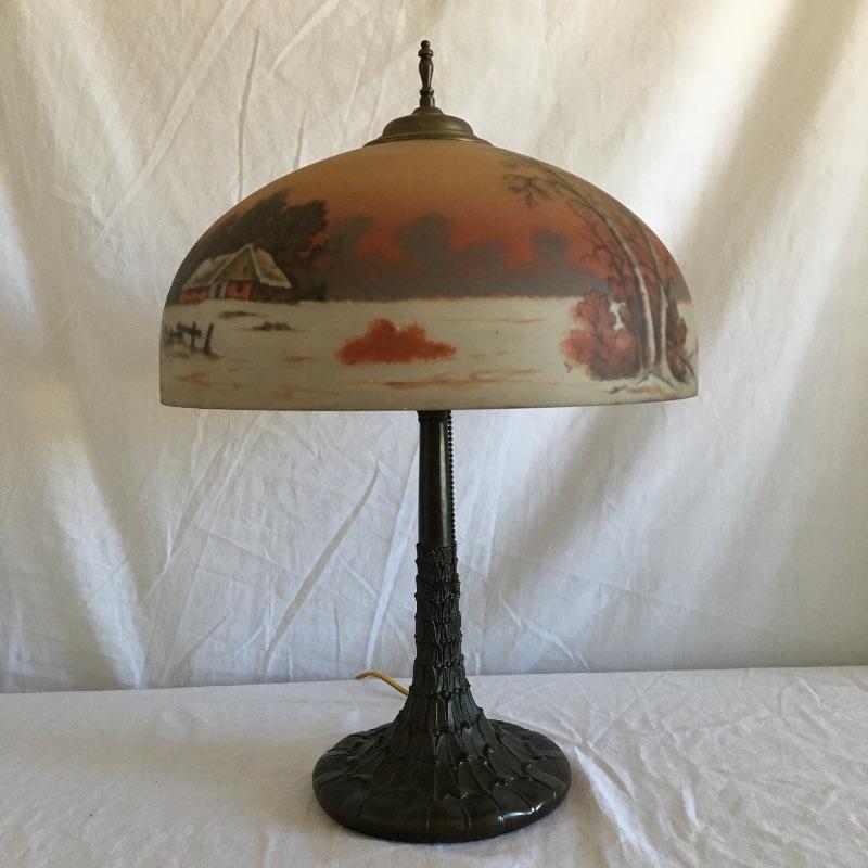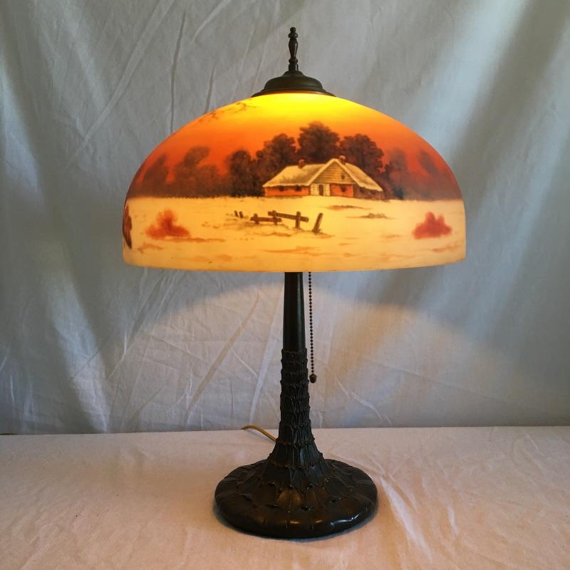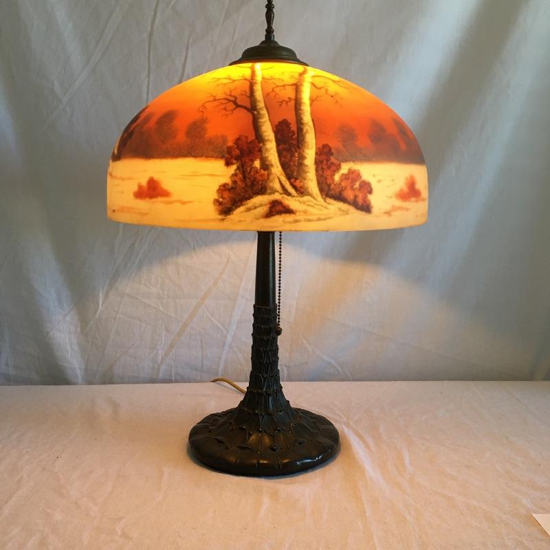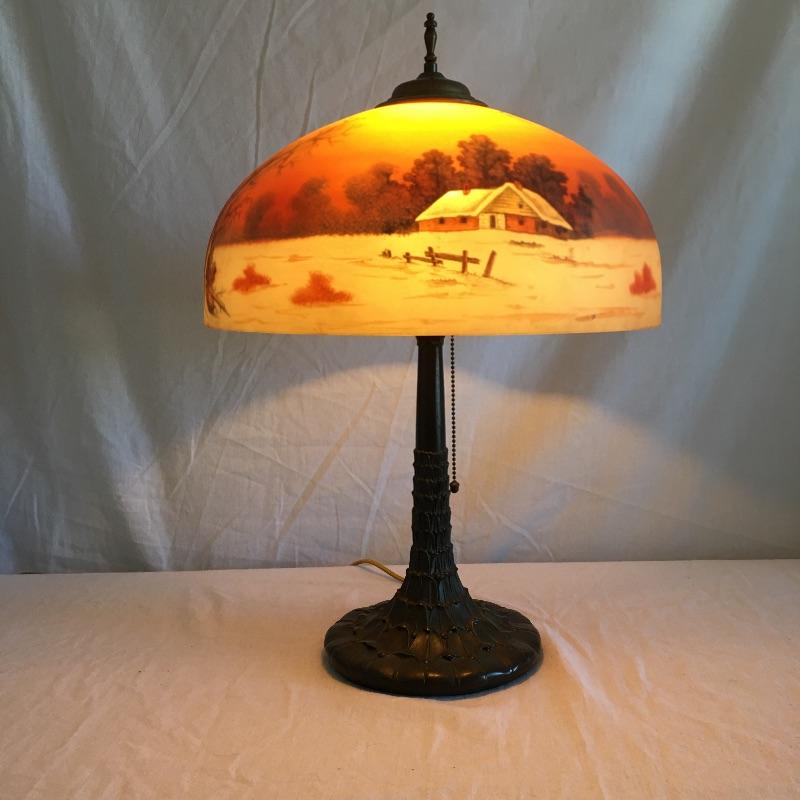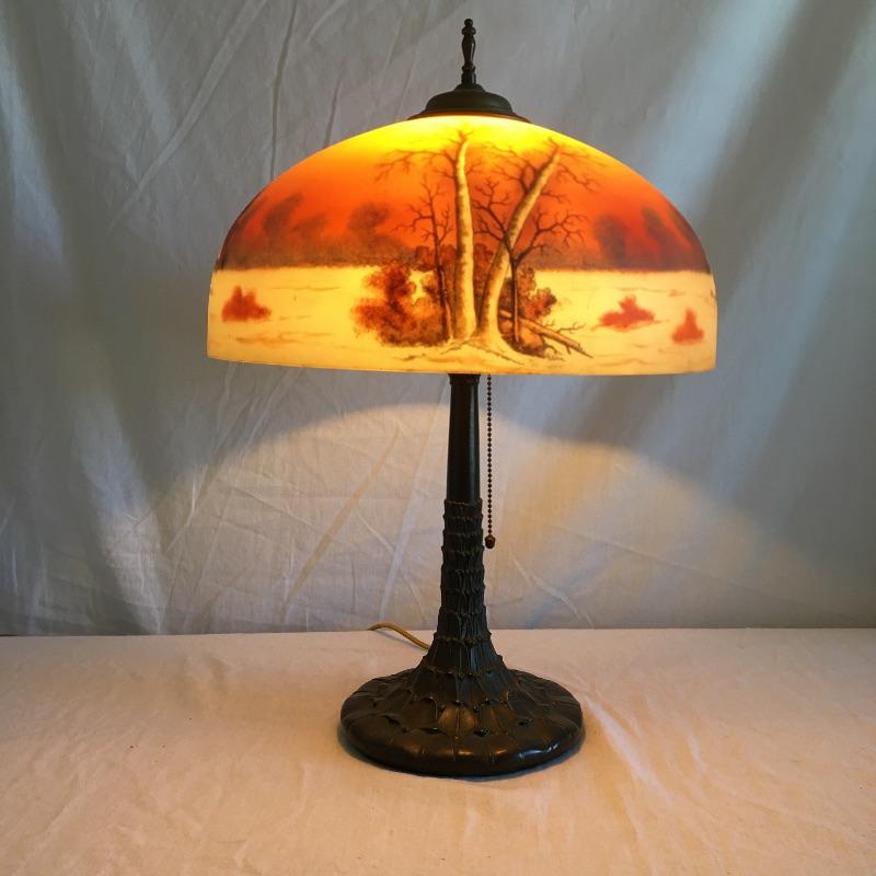 Reverse painted glass table lamp; made by the Pittsburgh Lamp, Brass & Glass Co., Gorgeous vibrant colors when on or off. Glass shade is 16" diameter. Has a metal base. No signatures found but the manufacturer was confirmed by the executor of this estate. Lamp measures 20.25” tall.