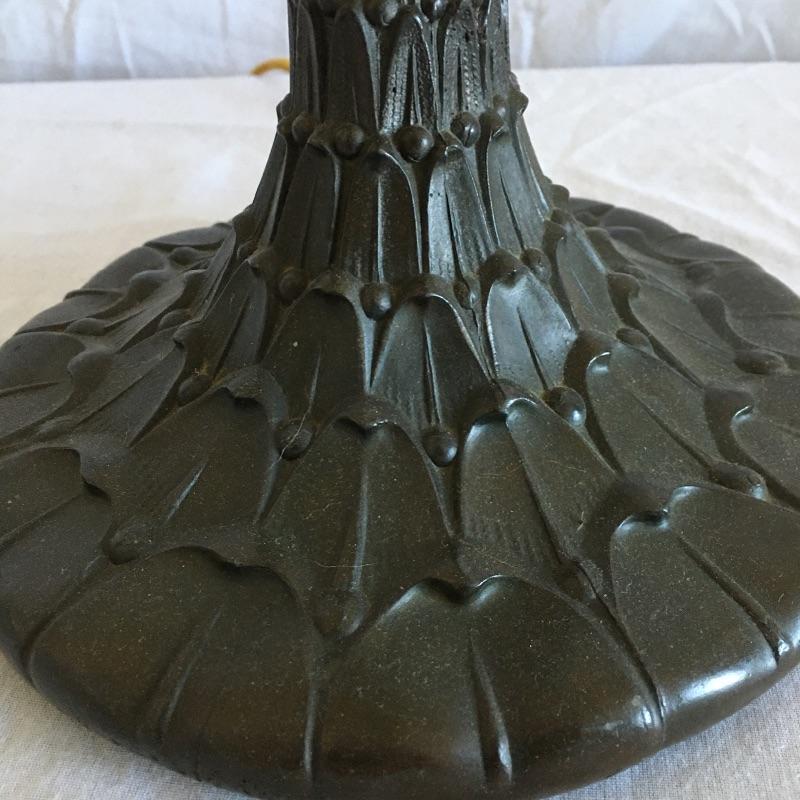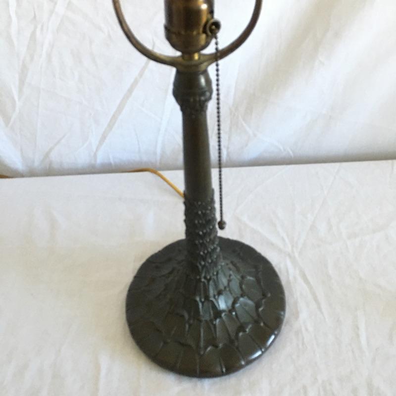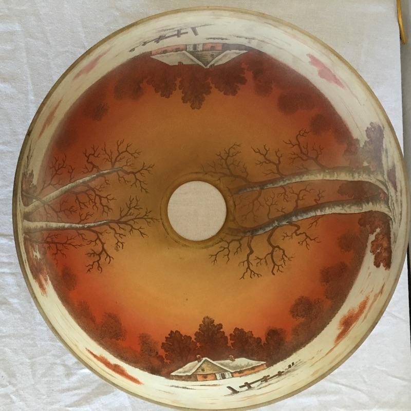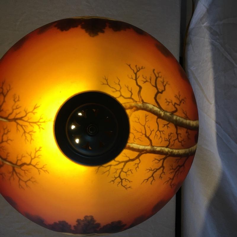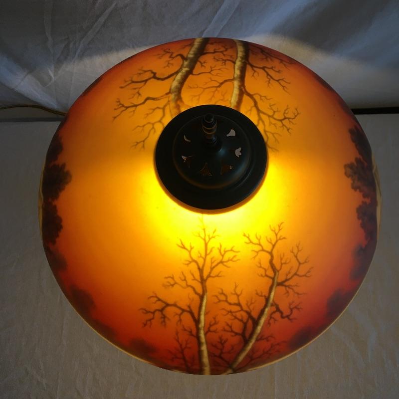 Reverse painted glass table lamp; made by the Pittsburgh Lamp, Brass & Glass Co., Gorgeous vibrant colors when on or off. Glass shade is 16" diameter. Has a metal base. No signatures found but the manufacturer was confirmed by the executor of this estate. Lamp measures 20.25” tall.