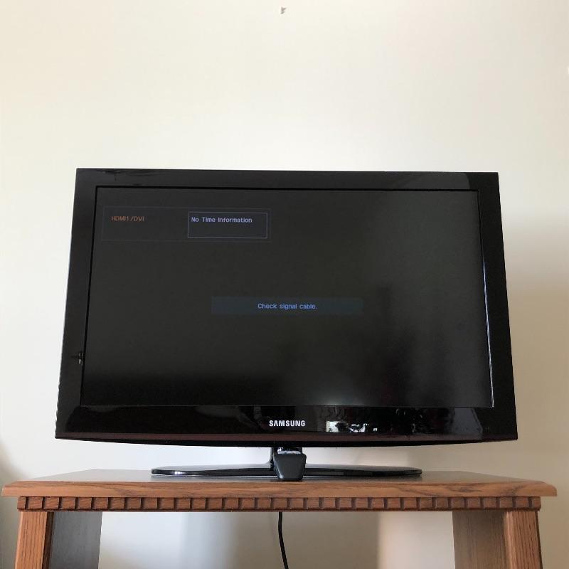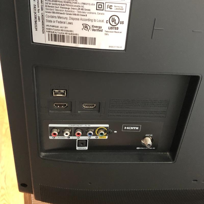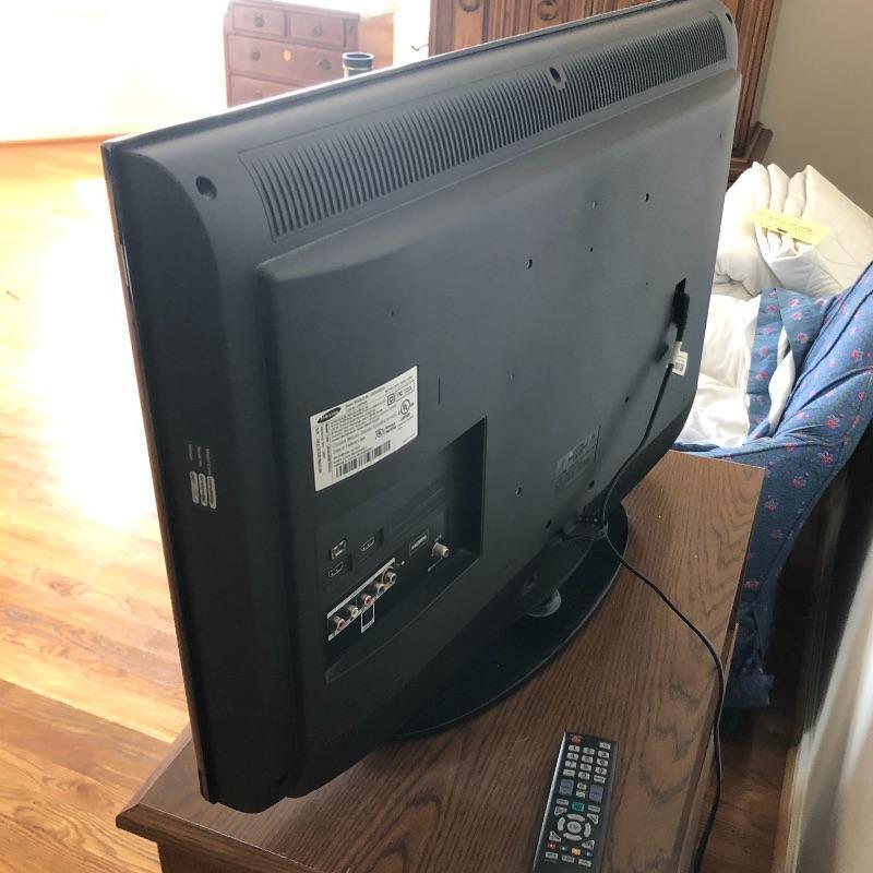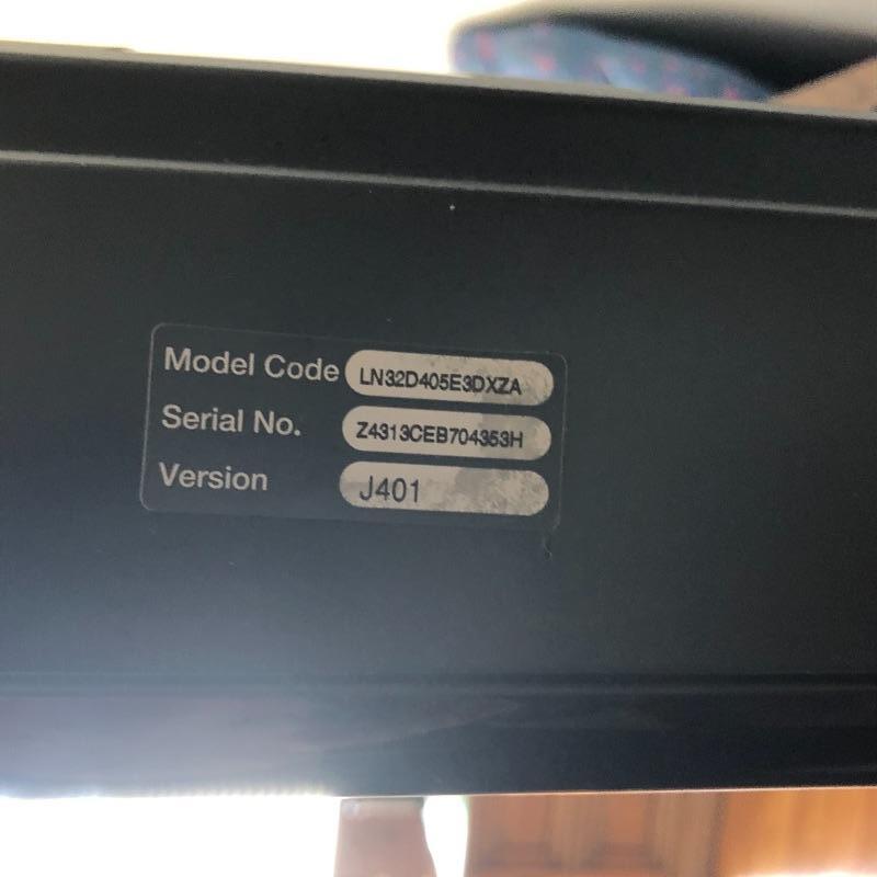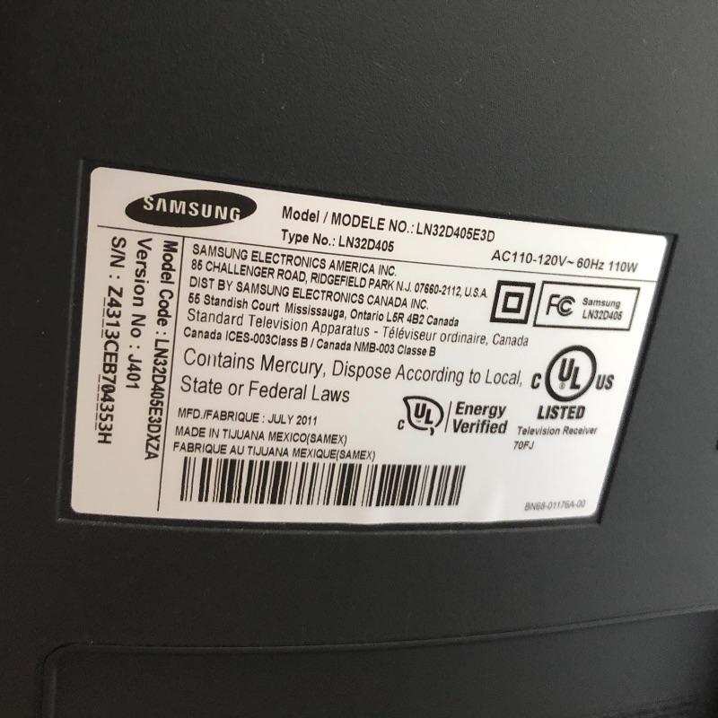 This Samsung 32” flatscreen TV comes with stand, remote and manual. See images for model information, etc. Powered on when tested.