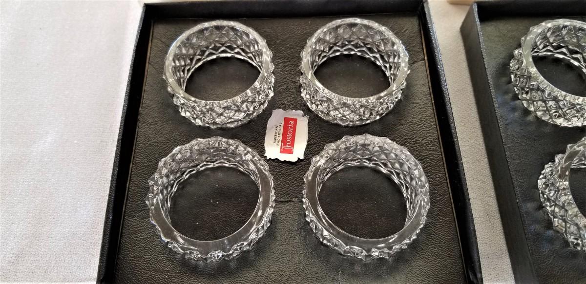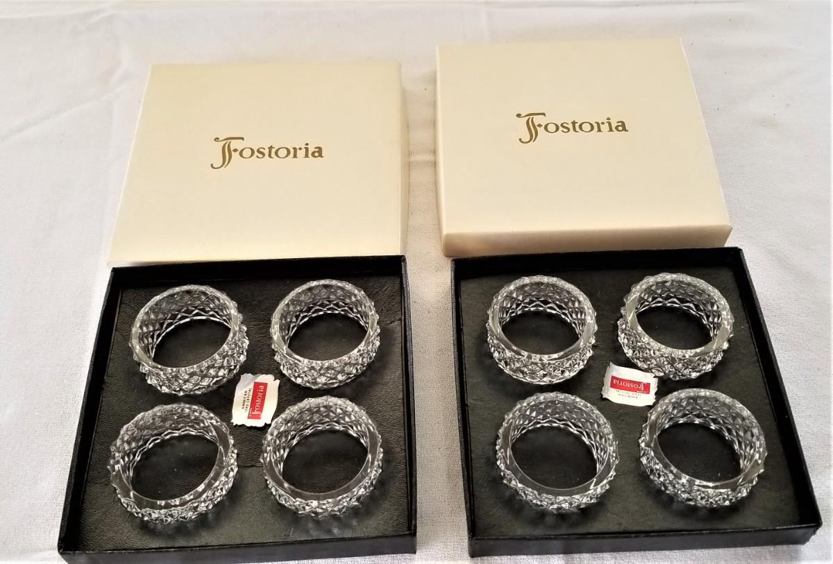 Never used - two sets of four crystal Fostoria napkin rings in original boxes. Like new.