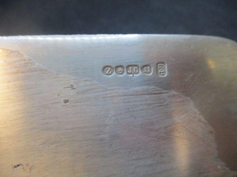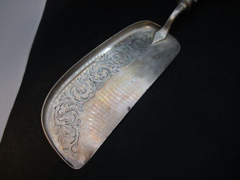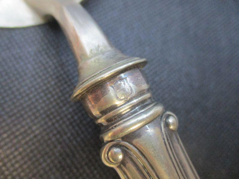 I think that this is silver as opposed to silverplate, but I don't deal much with either, so please use your own best judgement. It is weighty like silver, but there is some wear on the back side. There are hallmarks clearly visible. It is 13.75" long and has elegant engraving on the blade.