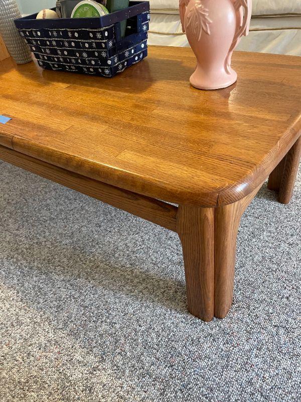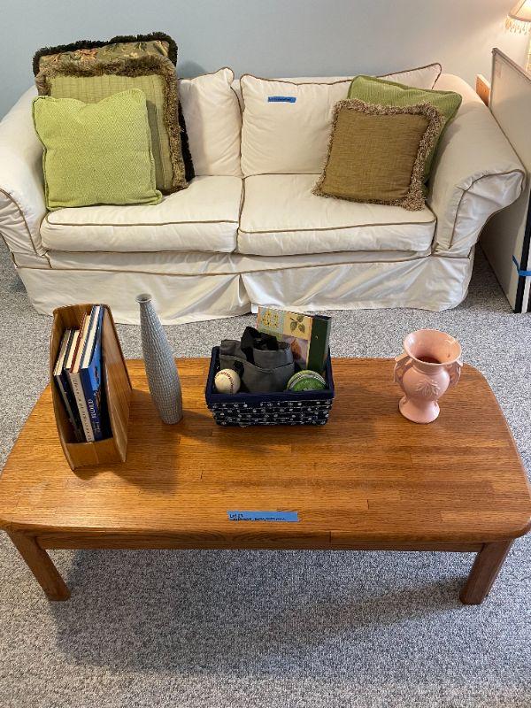 Solid wood coffee table ( 51'' l x 16'' tall x 23'' W), (2) vases, basket with photo album, balls and toy, bag, wooden basket with books.