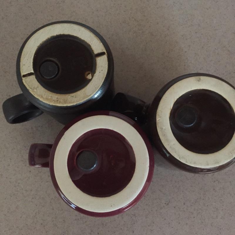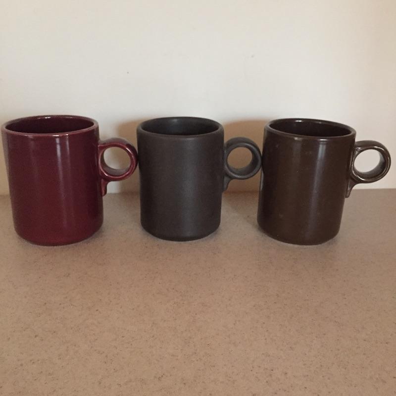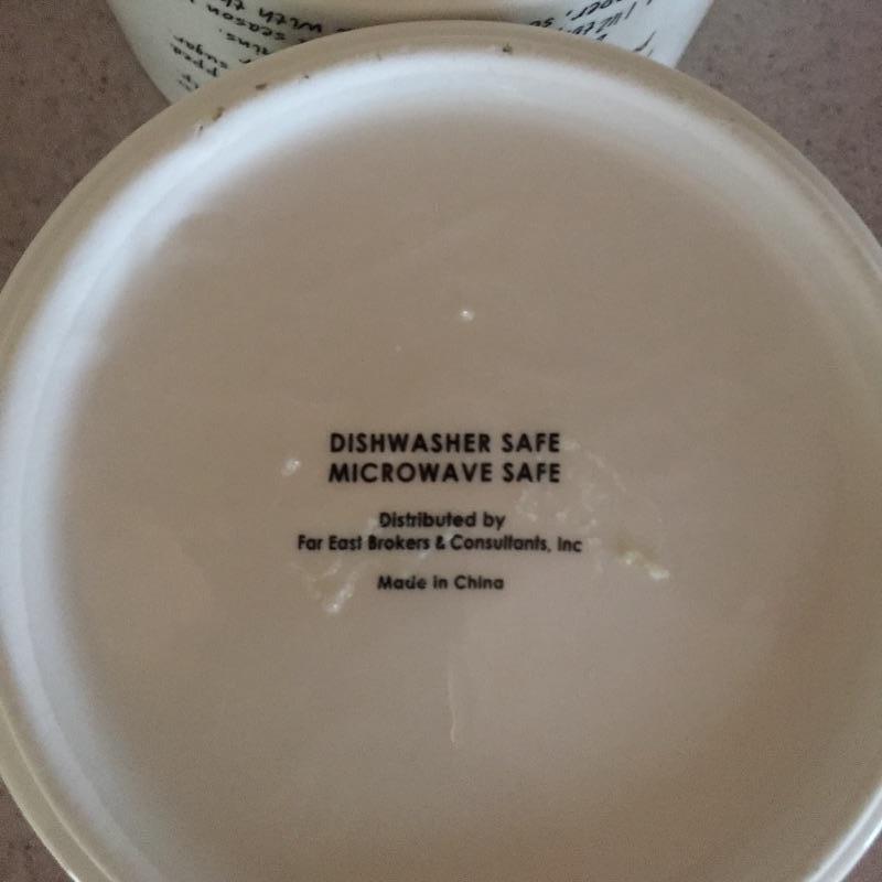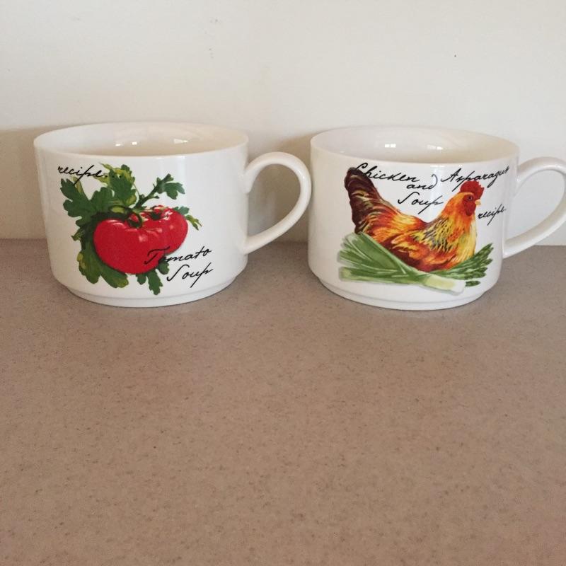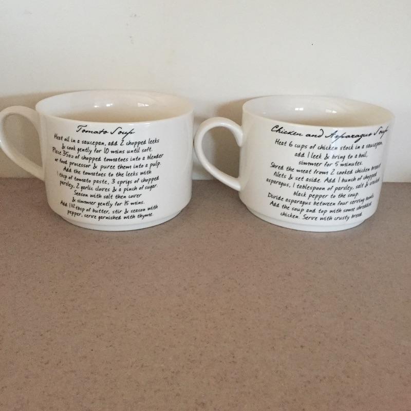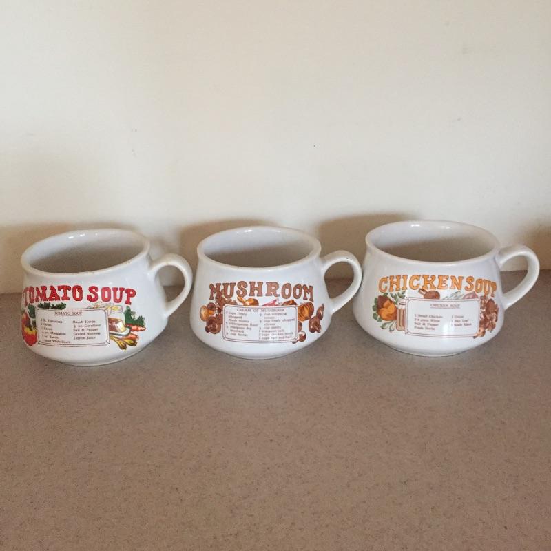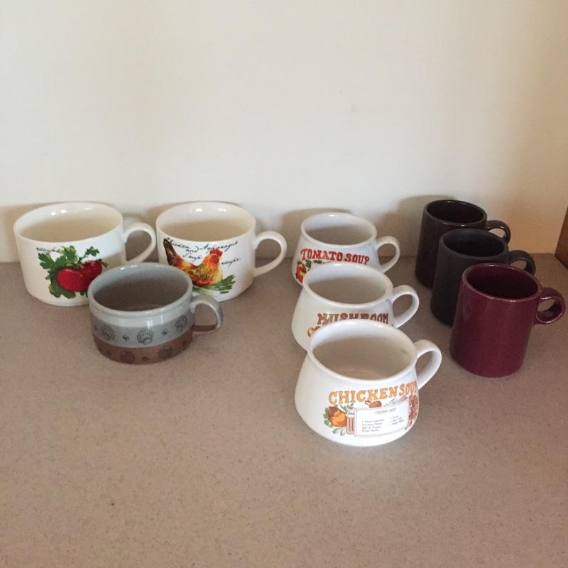 Six soup mugs. Five of these include recipes on the side. Lot also includes a trio of coffee cups with unique handles. Largest mug measures 4.75” D.