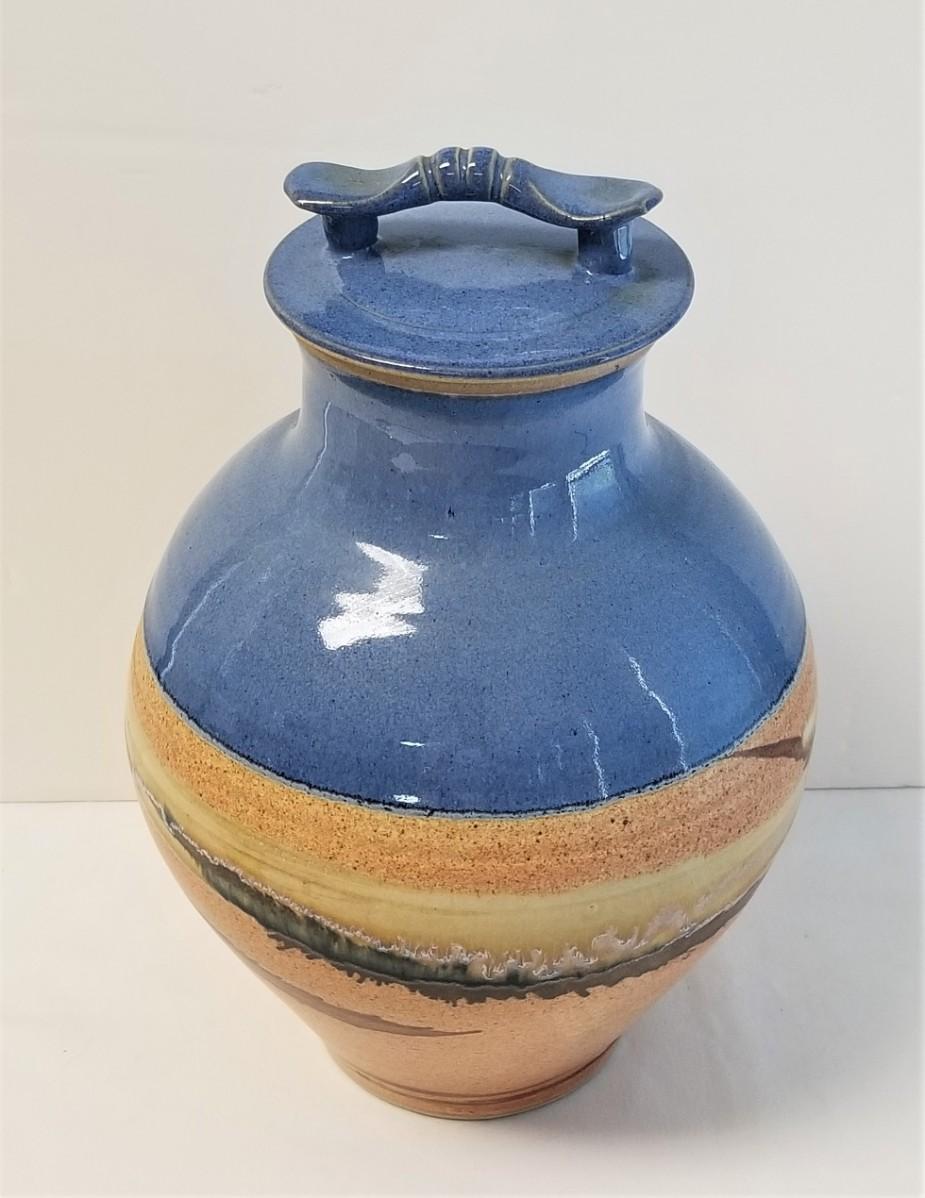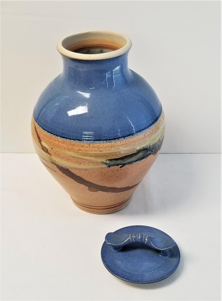 Very attractive Studio Pottery jar with lid - has a great Southwest look. 13" tall, beautiful blue coloring. Great condition.