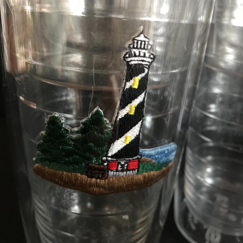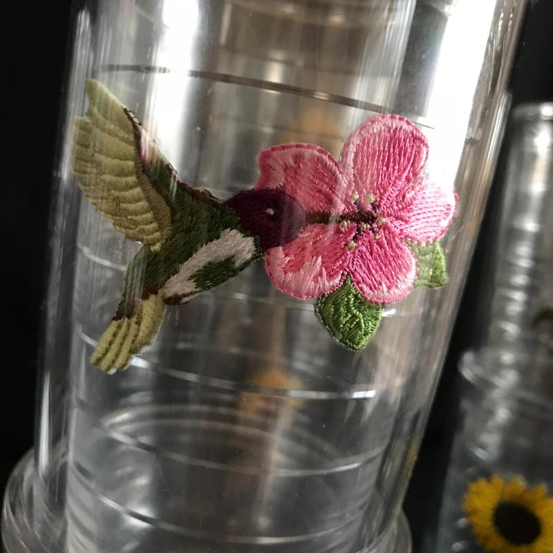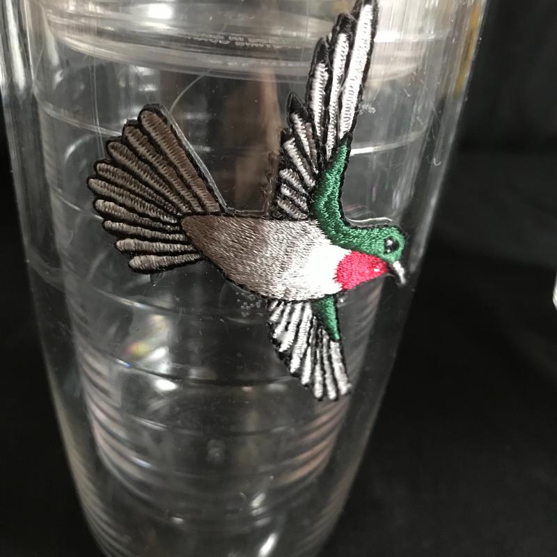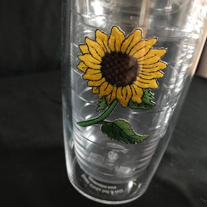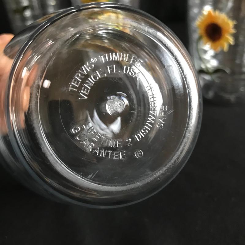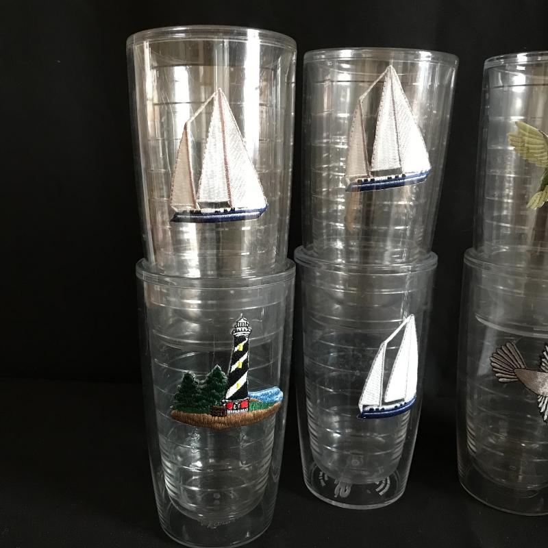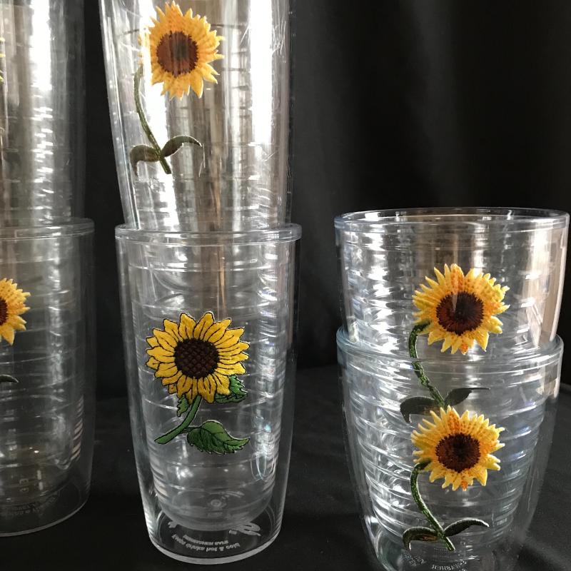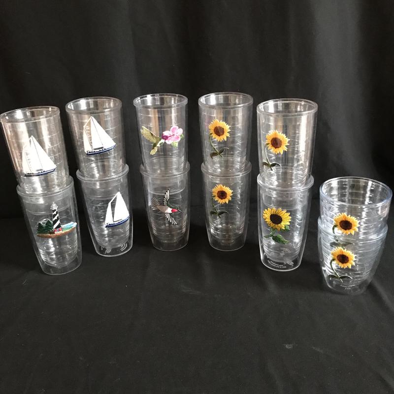 Twelve Tervis brand plastic tumblers with humming bird, sunflower, and nautical designs. Ten are 6” tall and approx. 3.5” diameter at top, two are 4.5” tall and 3.5 diameter at top.