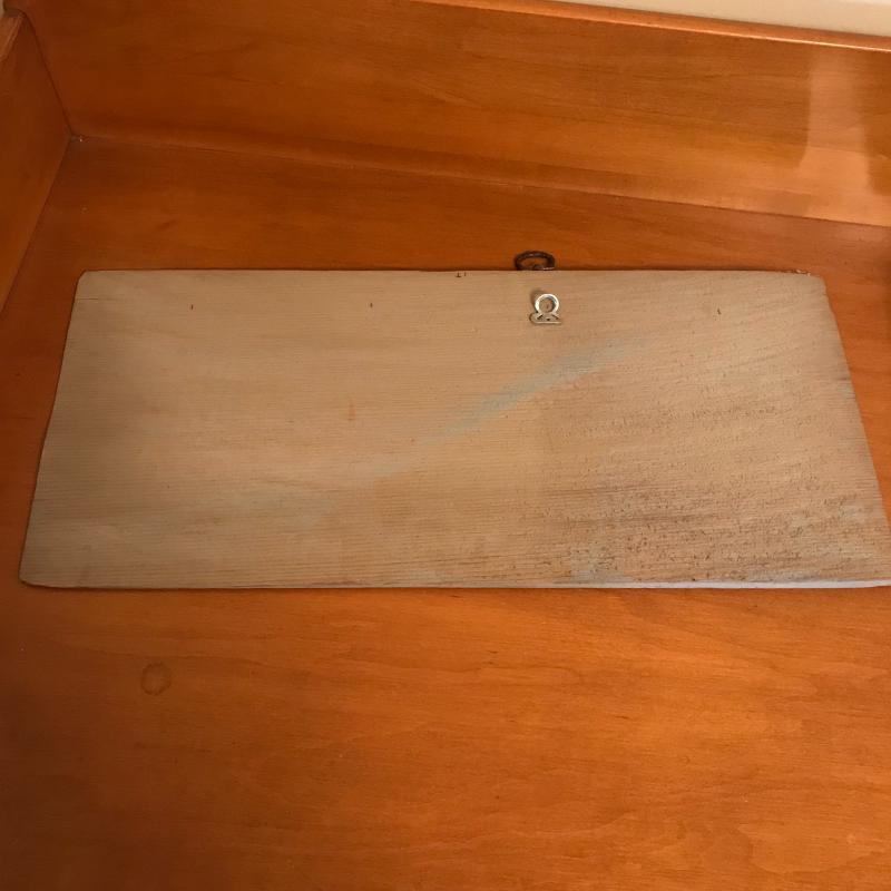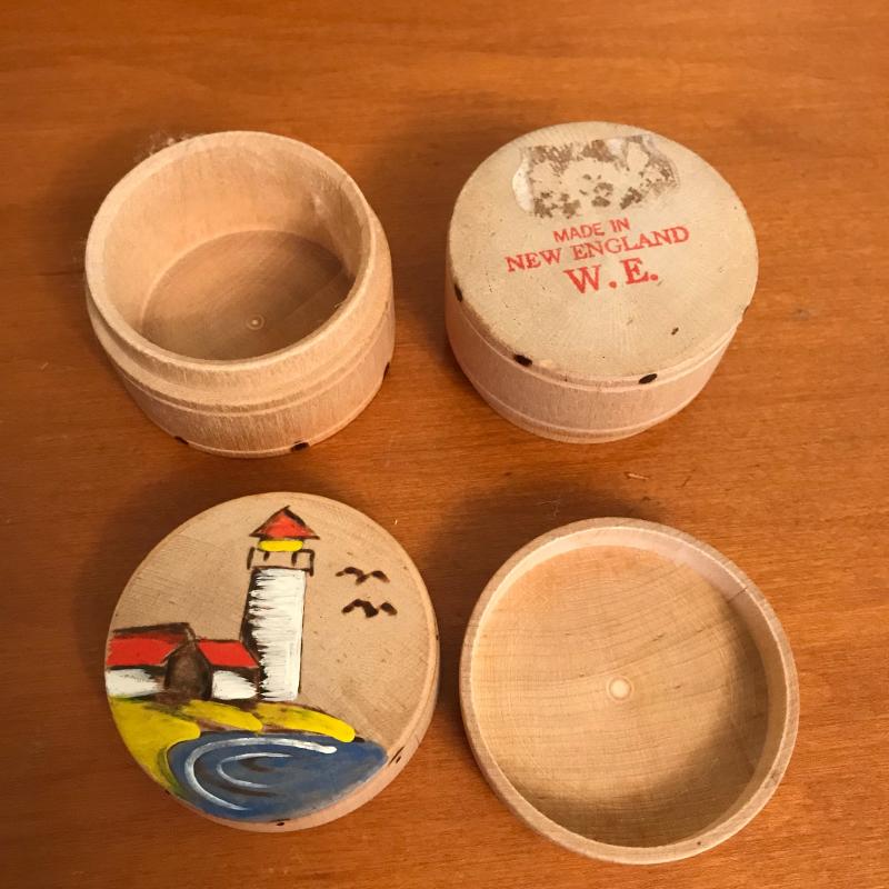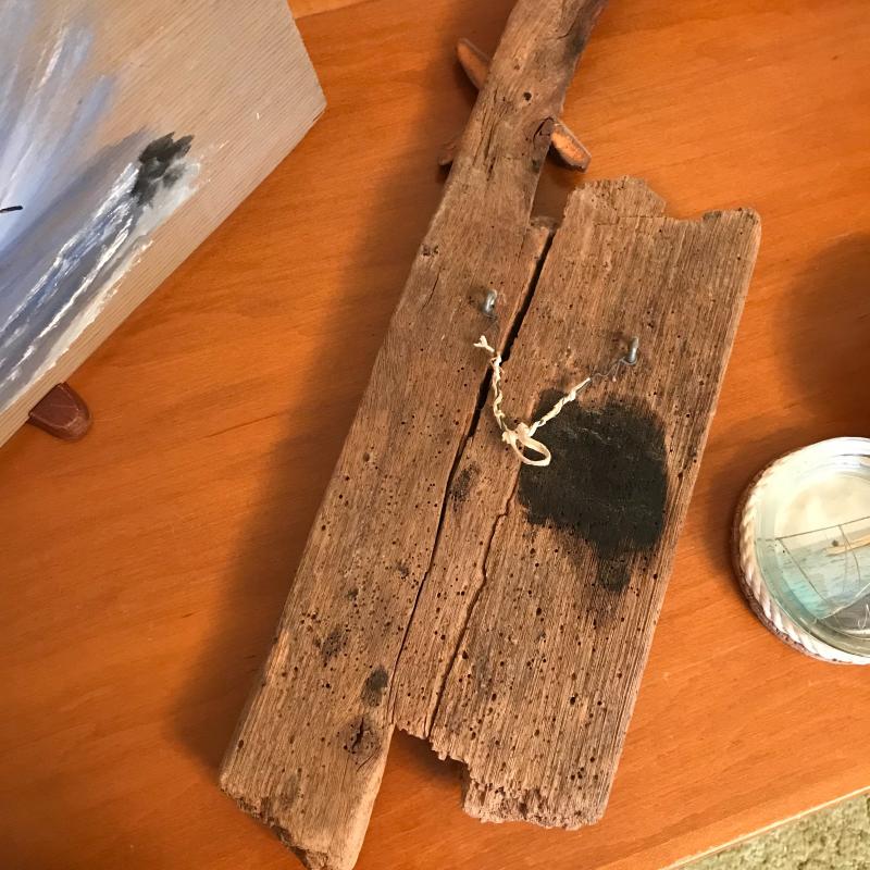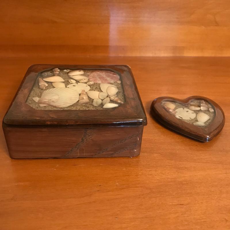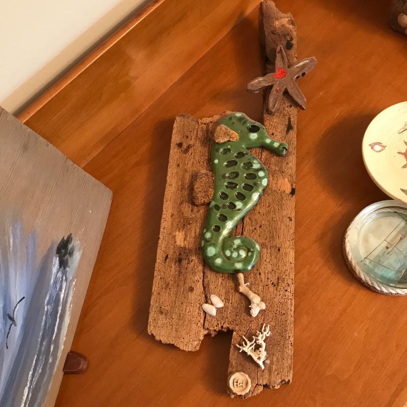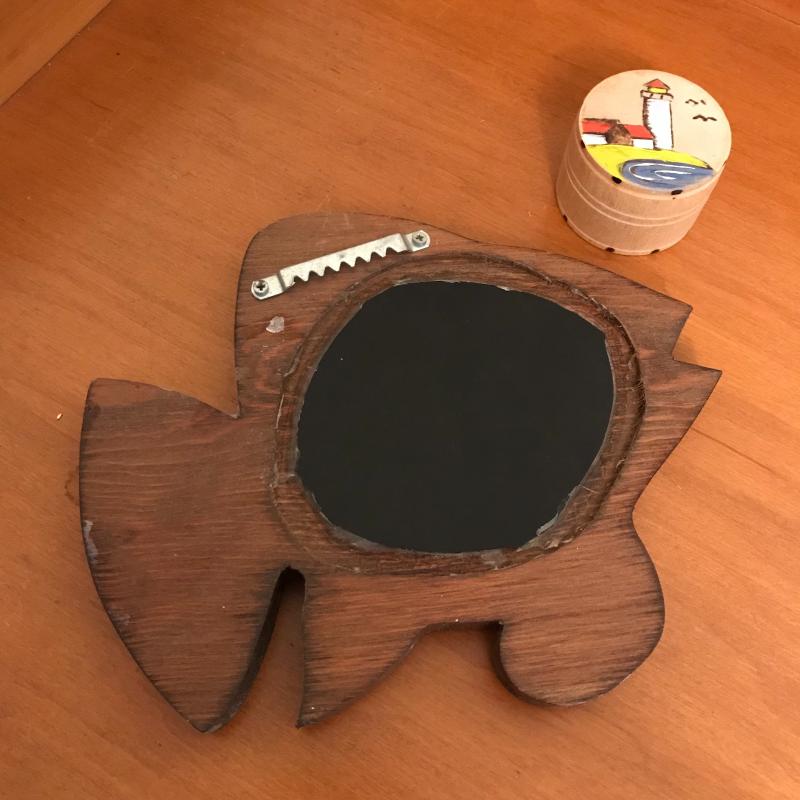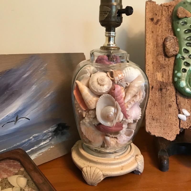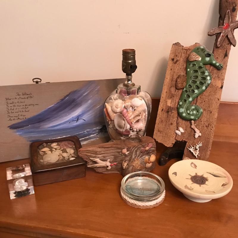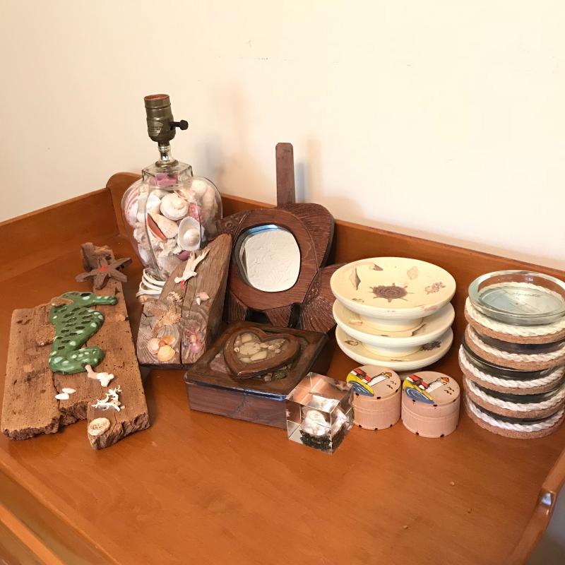 All things beachy! Shell lamp is in working condition, 3 candle stands one with pink wax, 2 small matching round boxes with light houses from New England, a set of 5 Maine coasters, a lacquered shell box (a couple chips on the inside lid, see photos) with a matching heart-shaped lid (missing the heart shaped box), a display cube with an oyster and apparent pearl, 3 more pieces of hanging beach art (one signed, see photos) and a wood carved fish mirror (the mirror itself shows age, see photos) The signed wave art “The Ultimate” measures approx. 17.25” x 7.75”. Local pick up only.