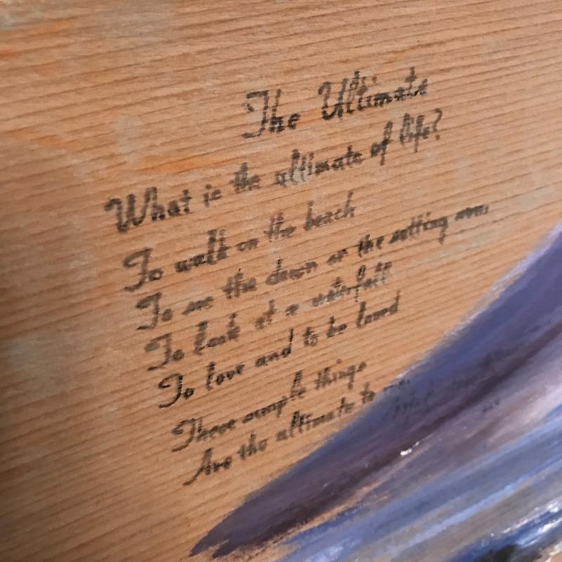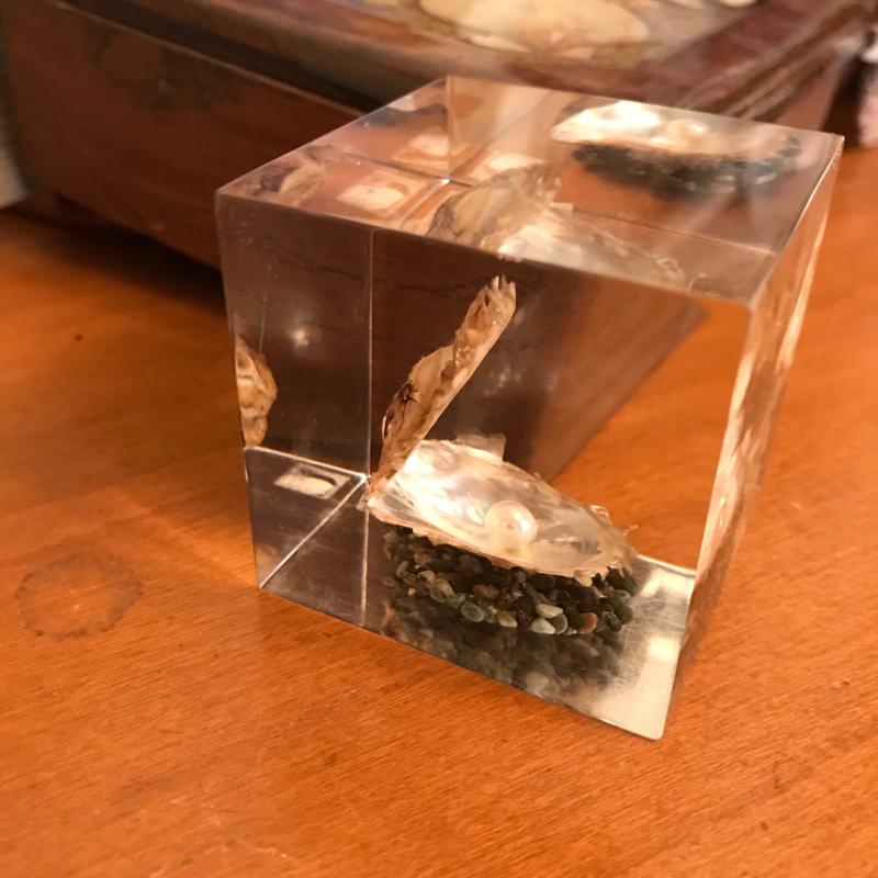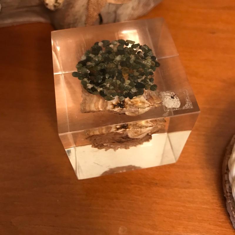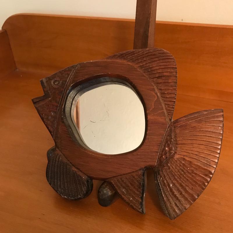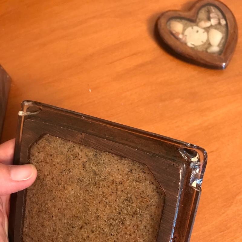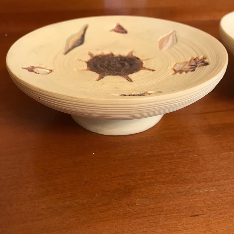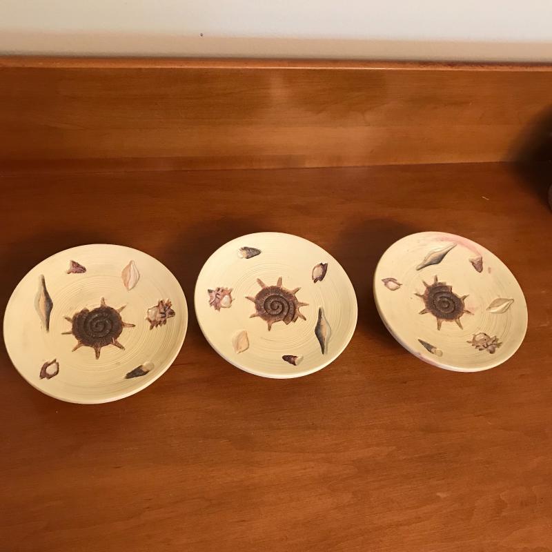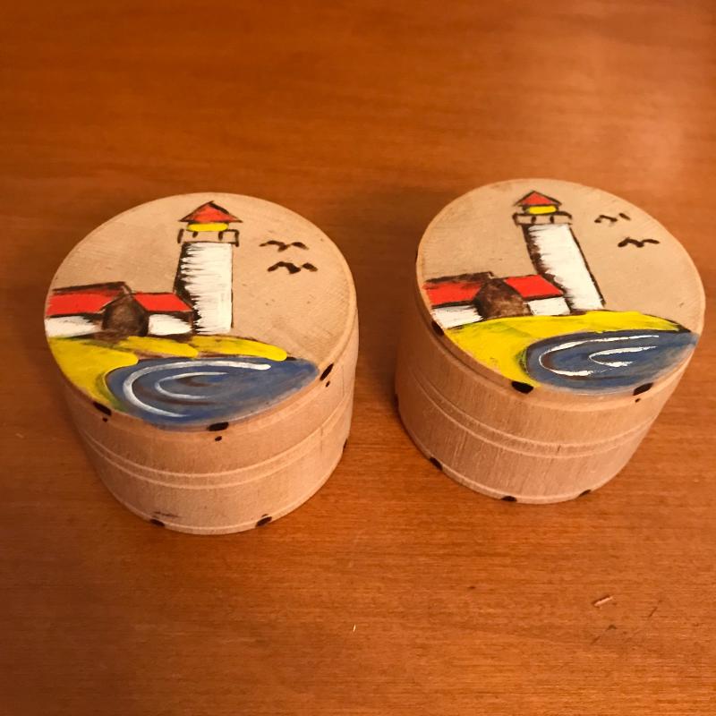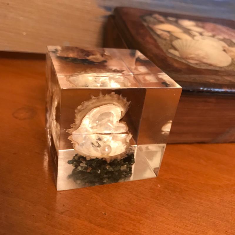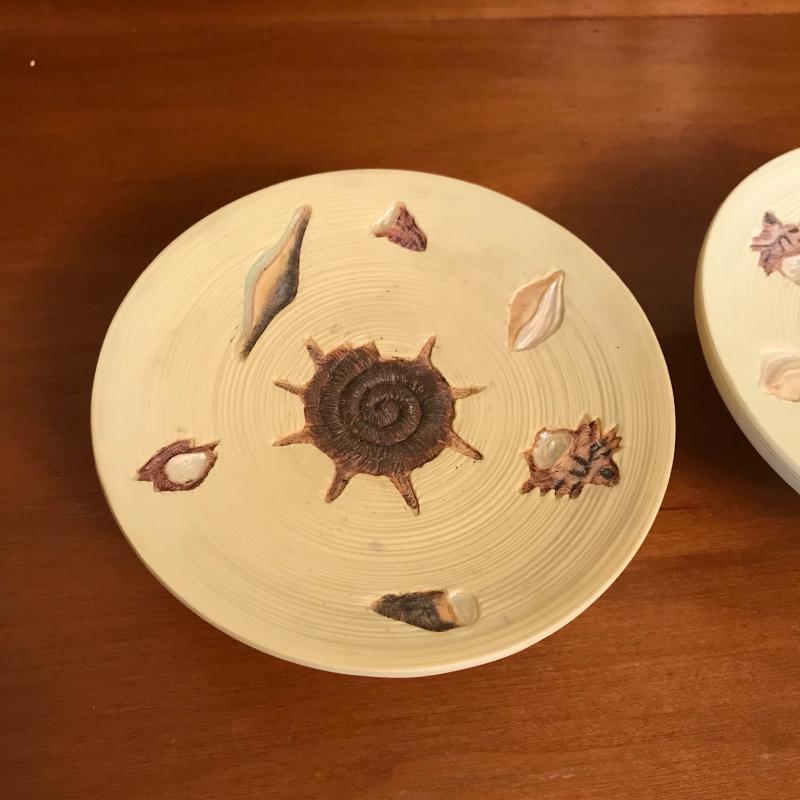 All things beachy! Shell lamp is in working condition, 3 candle stands one with pink wax, 2 small matching round boxes with light houses from New England, a set of 5 Maine coasters, a lacquered shell box (a couple chips on the inside lid, see photos) with a matching heart-shaped lid (missing the heart shaped box), a display cube with an oyster and apparent pearl, 3 more pieces of hanging beach art (one signed, see photos) and a wood carved fish mirror (the mirror itself shows age, see photos) The signed wave art “The Ultimate” measures approx. 17.25” x 7.75”. Local pick up only.