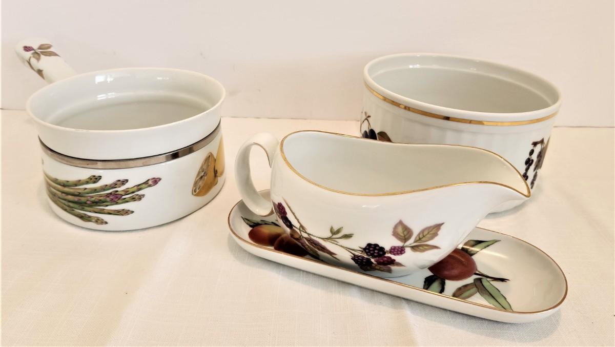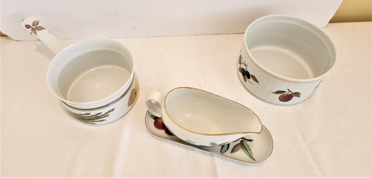 You get all you see here - gravy w/underplate, saucepan (no lid), and casserole (no lid). Gravy boat is 9" long, casserole is 6.5" across and 3.5" tall, and saucepan is 3.25" tall, 10" across. All in gently used condition. Royal Worcester in the popular "Evesham" pattern.