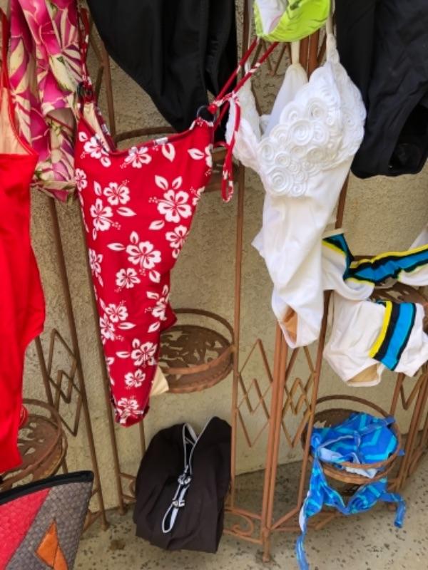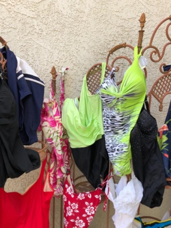 Lot 23. Twenty-two size large women’s bathing suits, two mumus, cover-up, vacation lounge wear, foldable sun hats, etc.--WAS $145““NOW $72.50