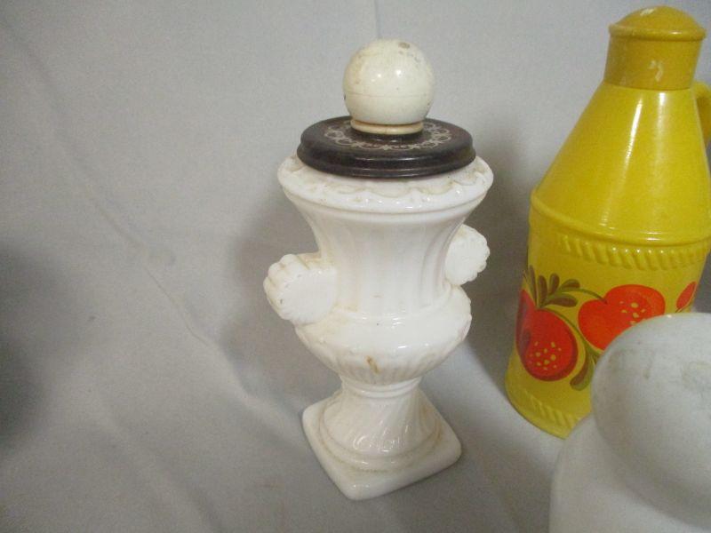 Please see the pictures for more details. The main issue is that they need to be cleaned. The bowling pin bottle still has product in it.