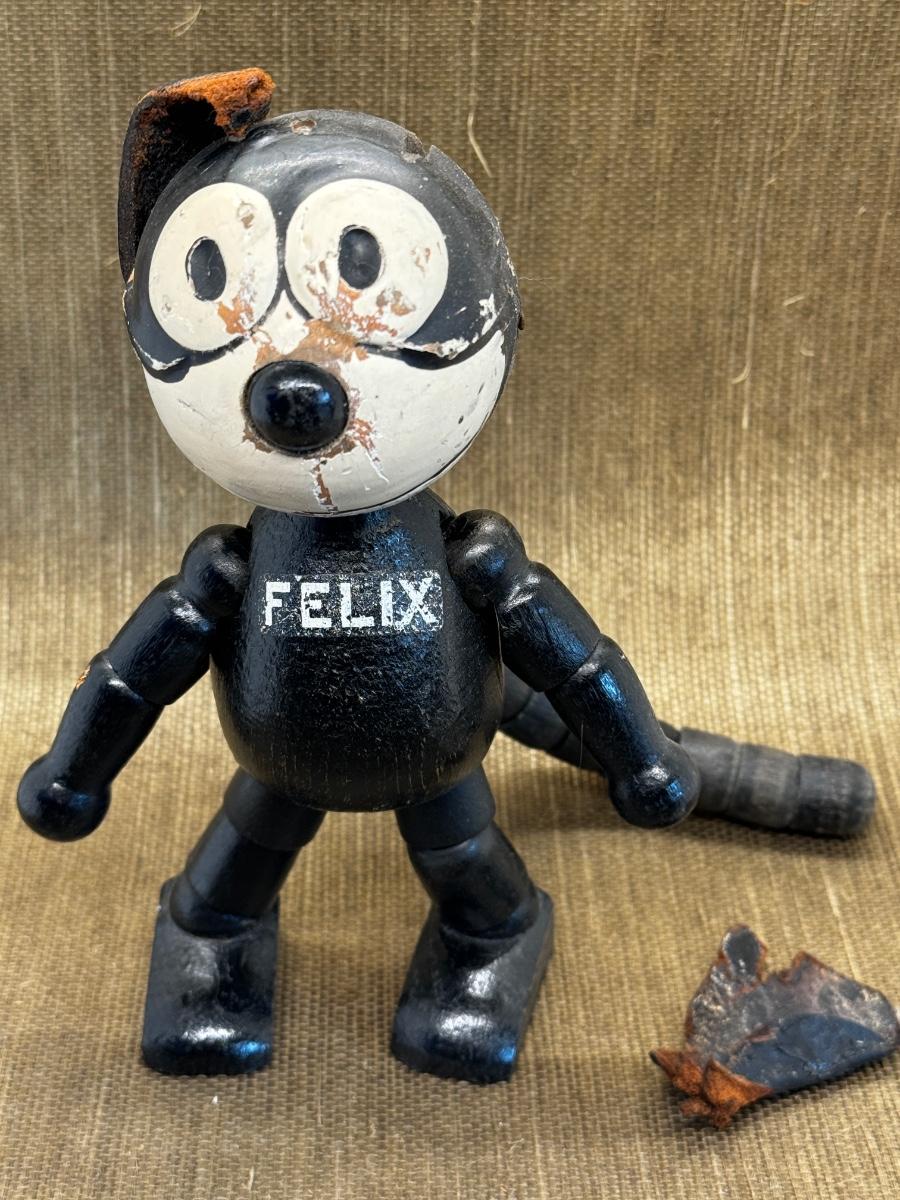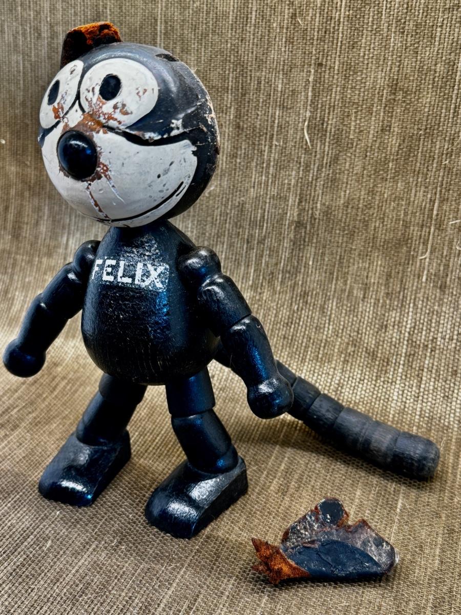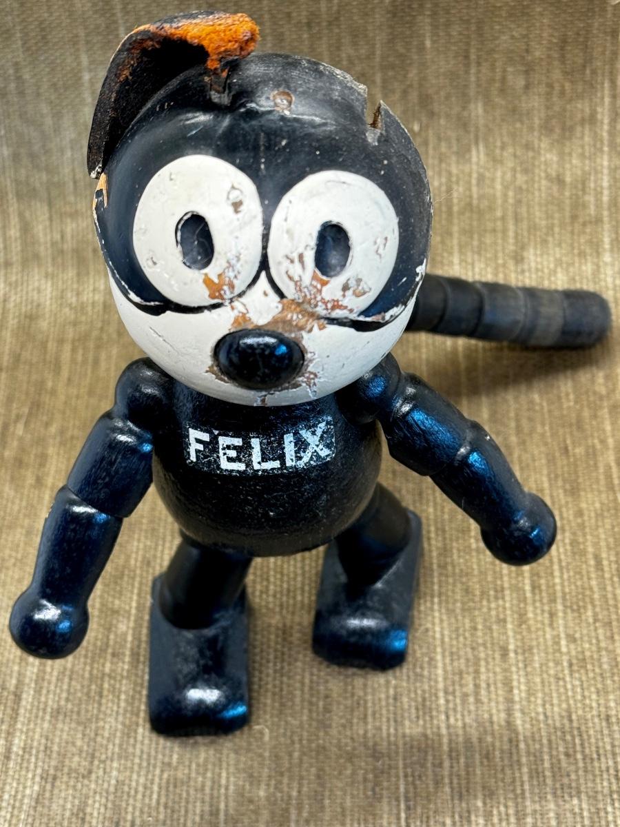 LOT 23 - Vintage Felix the Cat Wooden Toy. Moveable. Worn with an injured ear. It could use some restoration. He measures 7 inches tall.