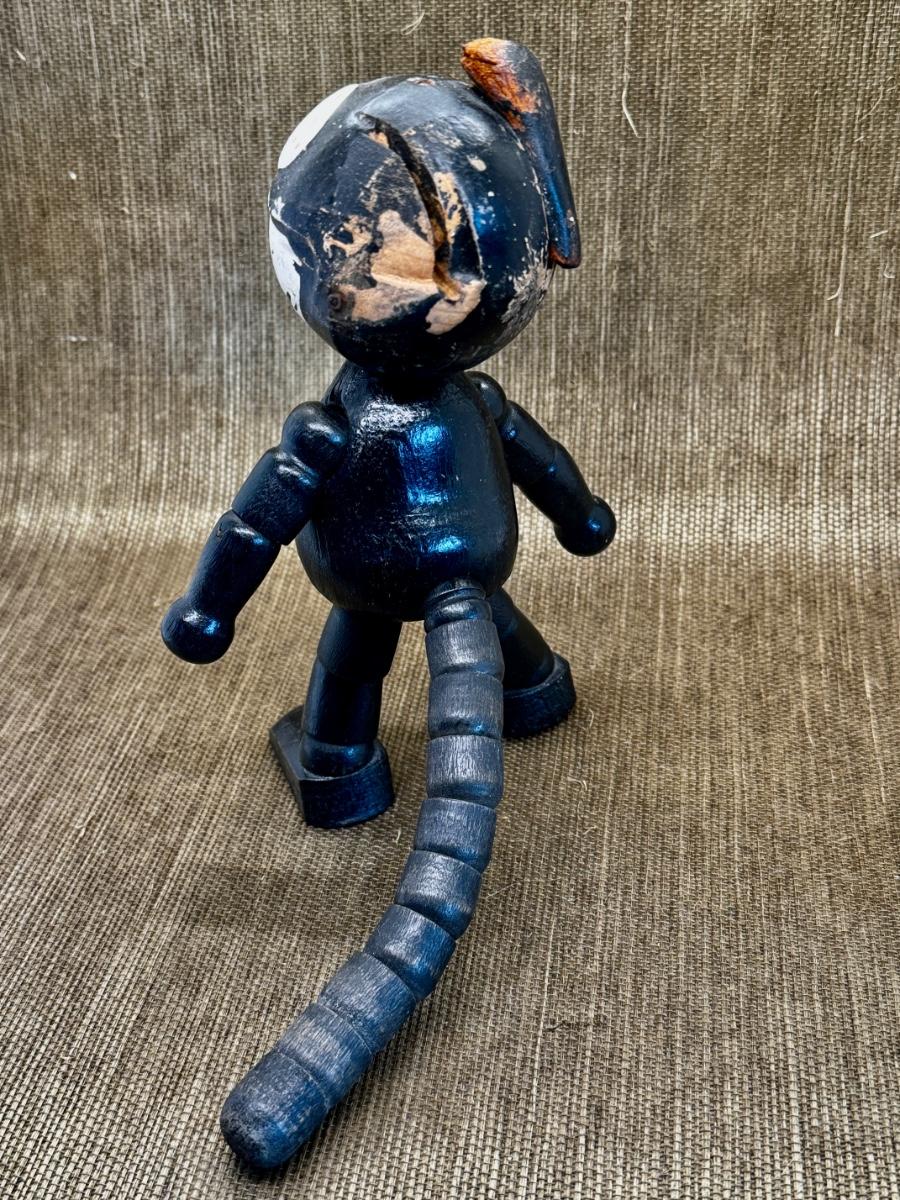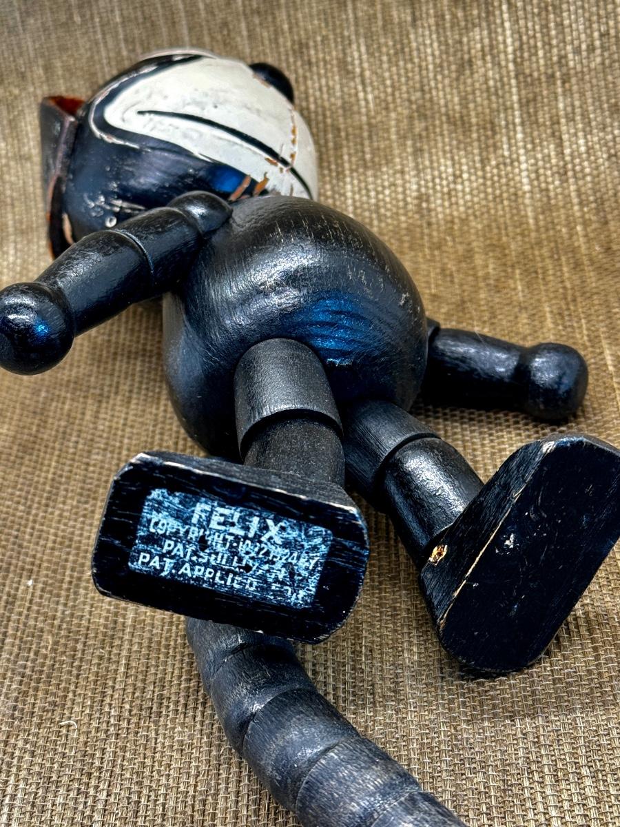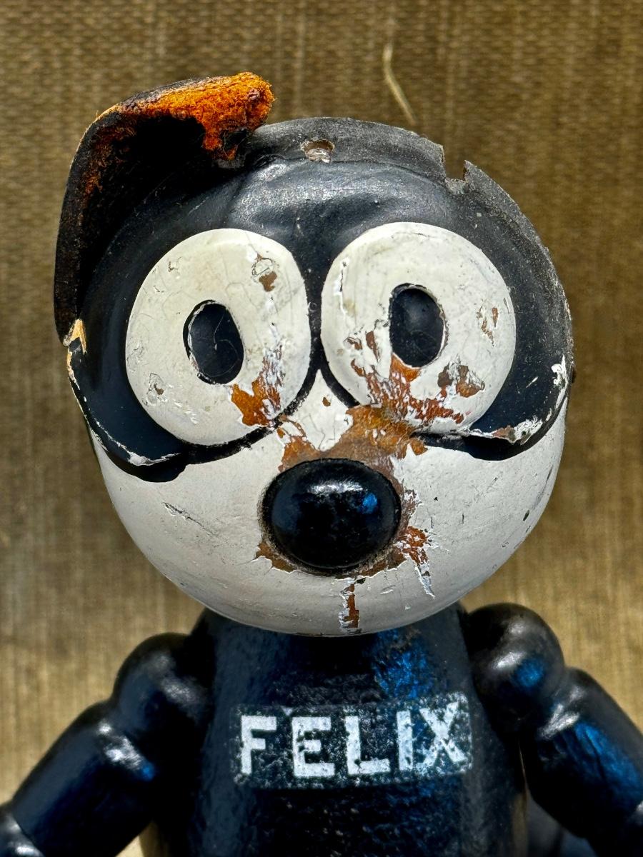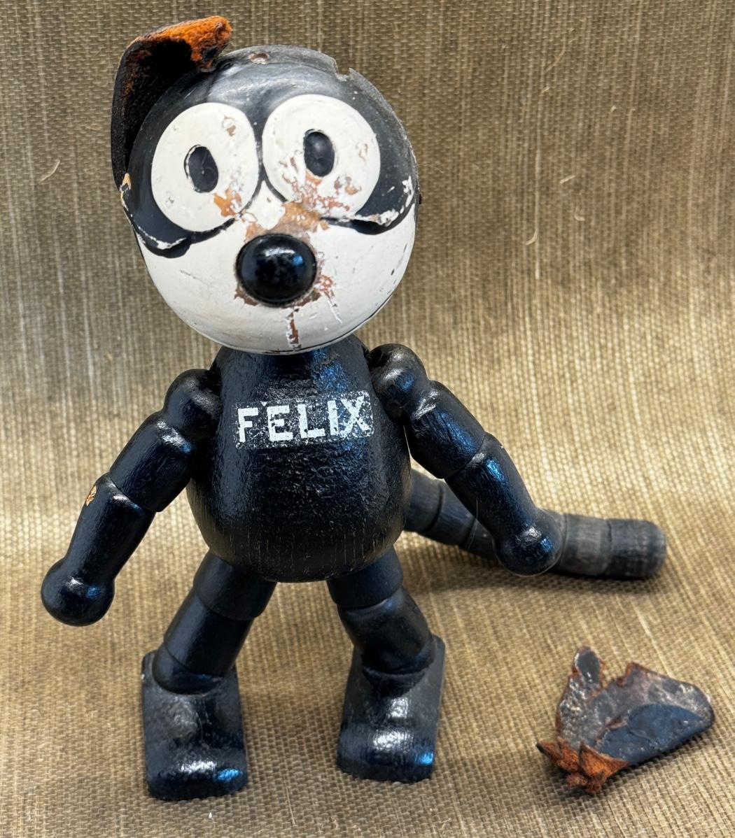 LOT 23 - Vintage Felix the Cat Wooden Toy. Moveable. Worn with an injured ear. It could use some restoration. He measures 7 inches tall.