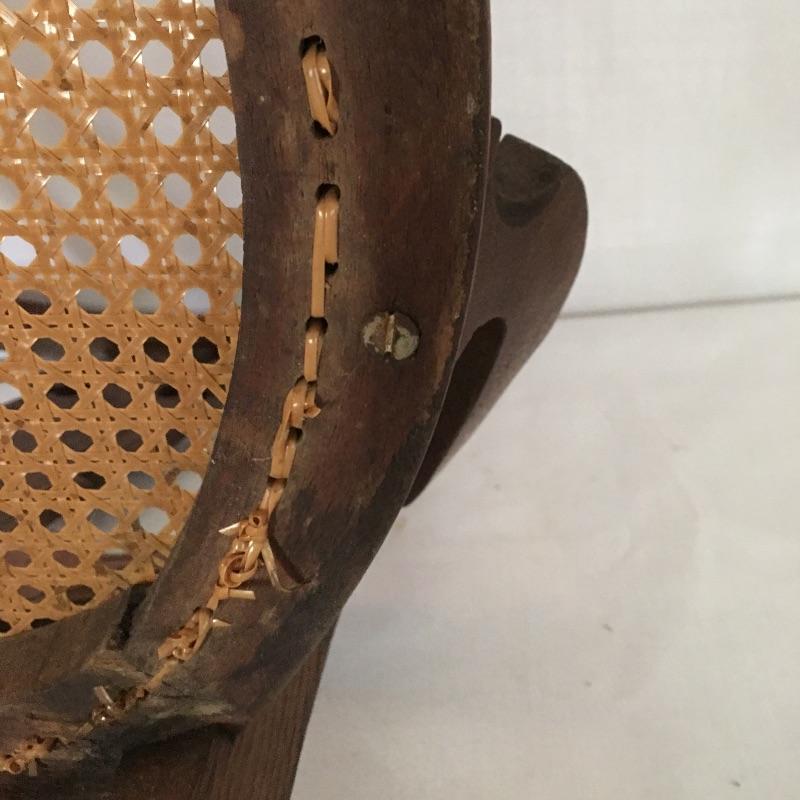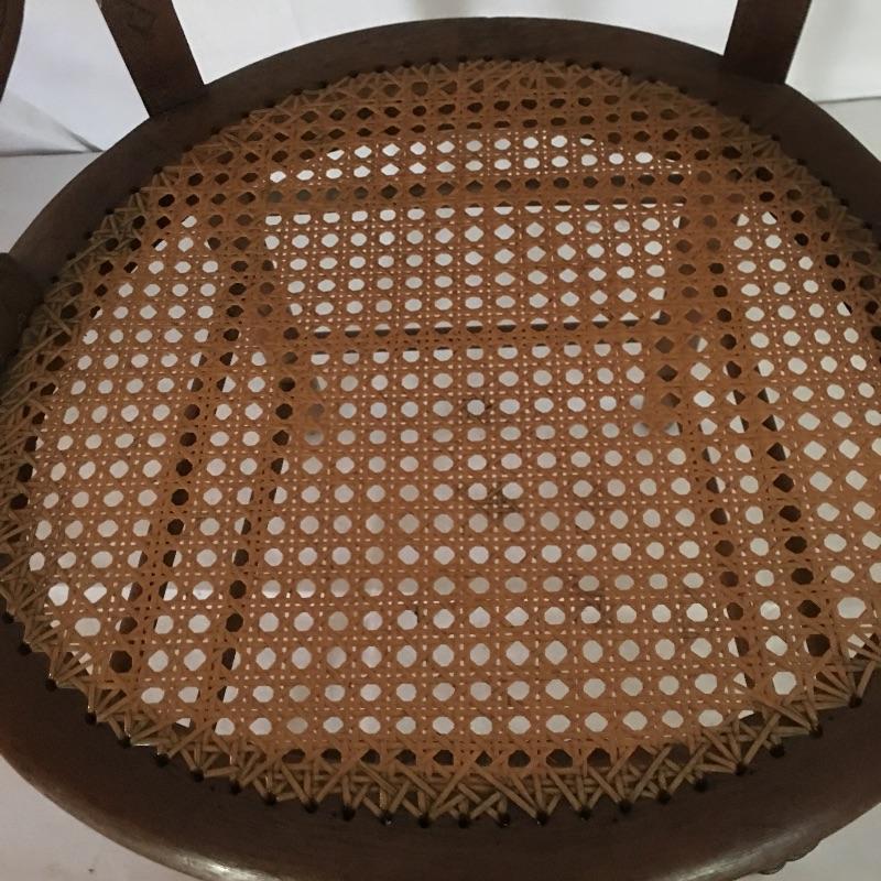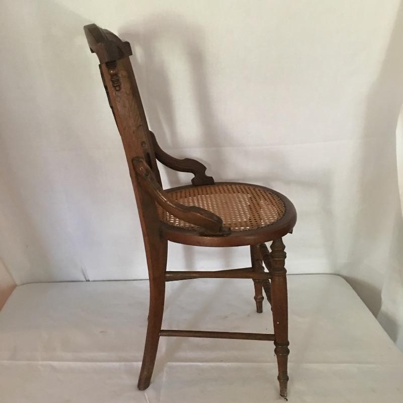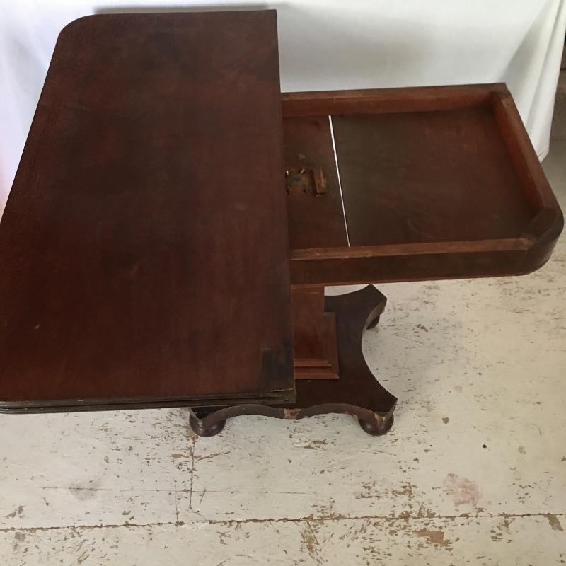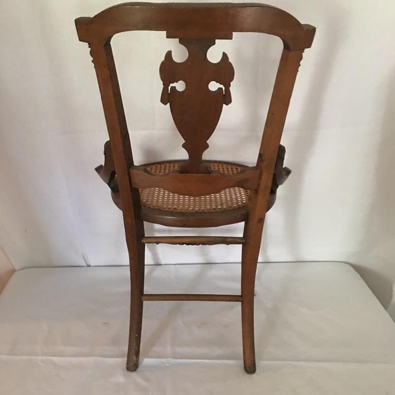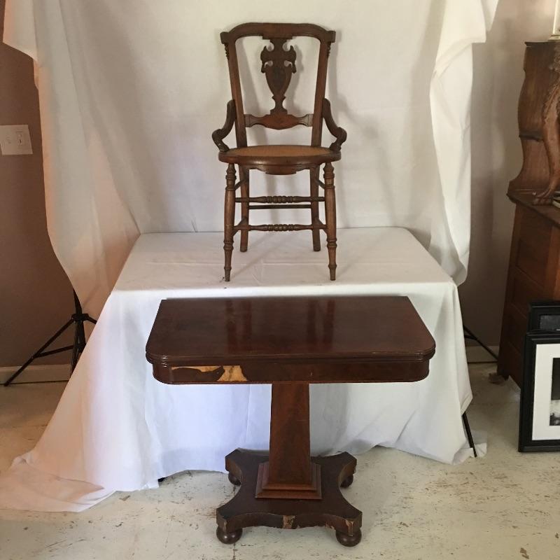 Enchanting games table and cane bottom chair. Table unfolds to double the size and has storage under top. Great craftsmanship on this pair. Table unfolded measures 33.5” x 33.5” x 28”. Veneer is broken on front - see pictures.