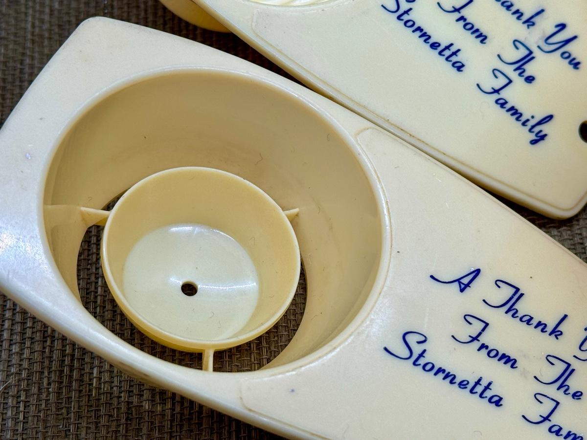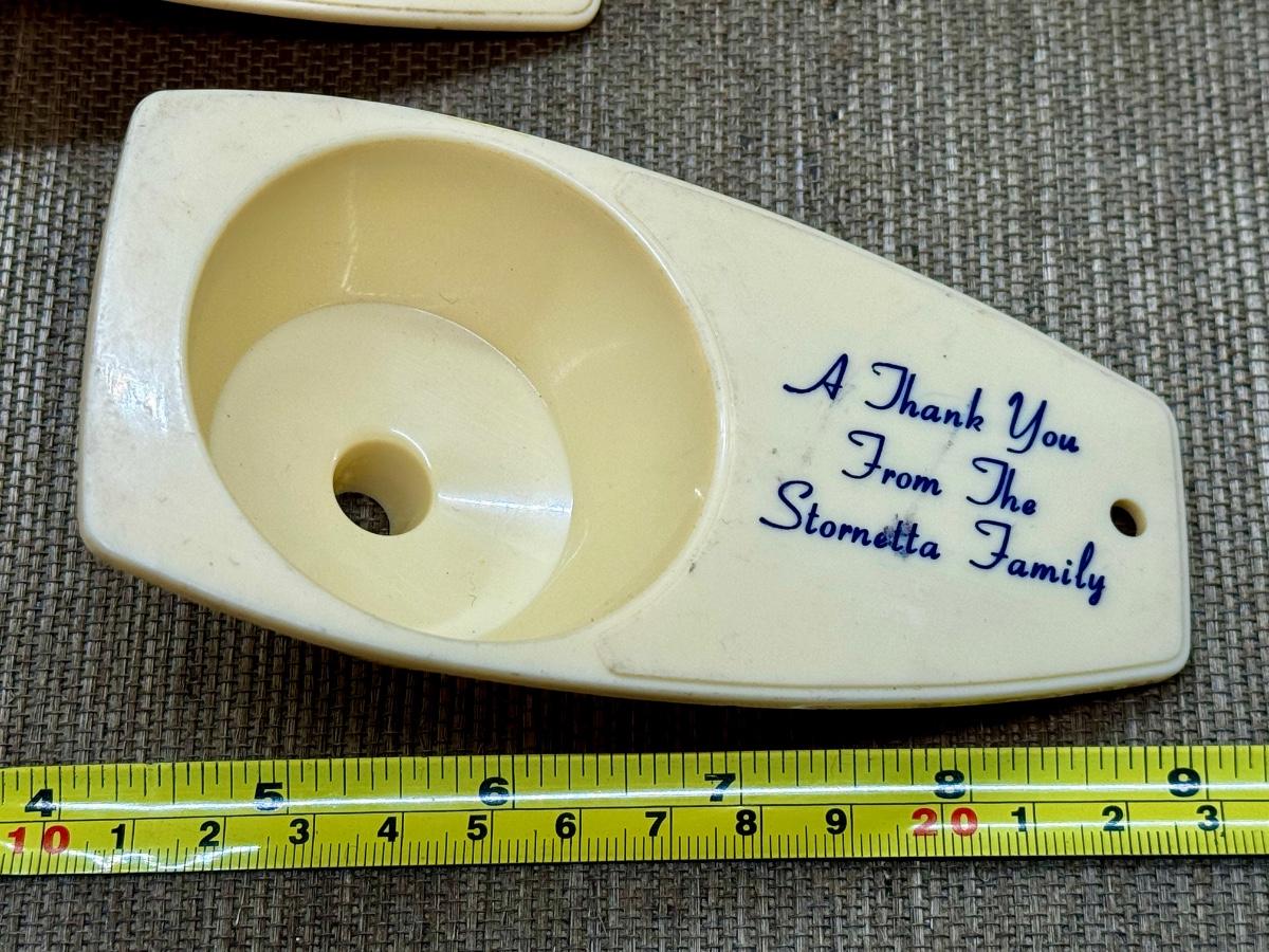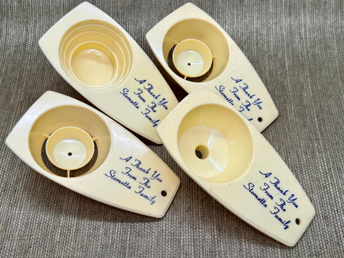 LOT 23 - Vintage Stornetta Dairy /Clover Dairy Egg Strainers. 3 different variations, 4 in total. They have some wear and marks. Slightly yellow in color possibly due to age. Please look closely at the photos as they are part of the description.