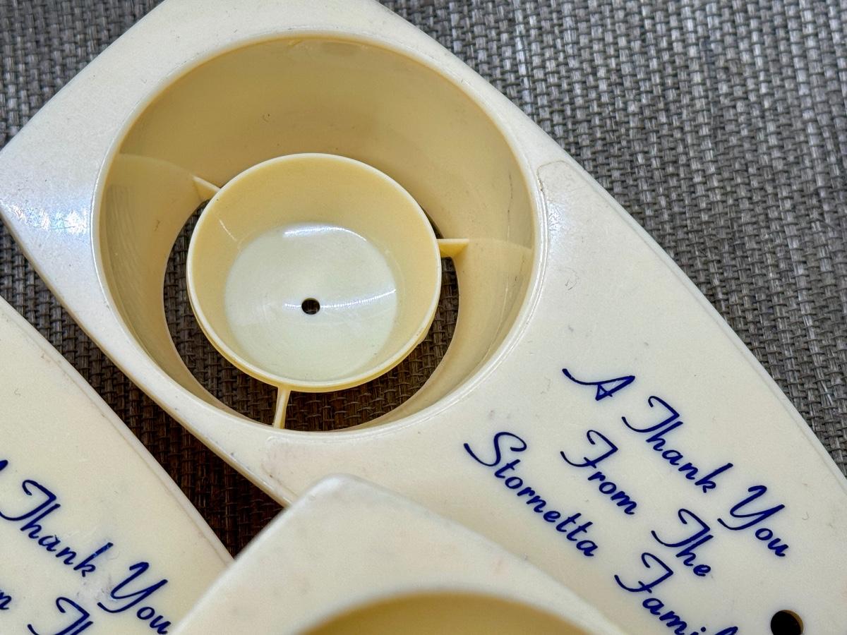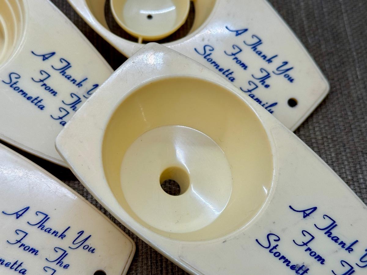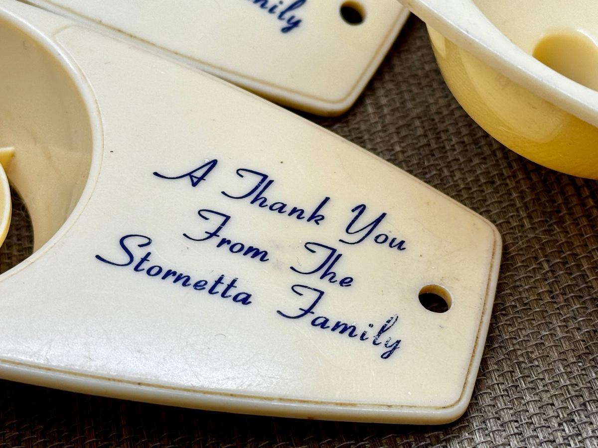 LOT 23 - Vintage Stornetta Dairy /Clover Dairy Egg Strainers. 3 different variations, 4 in total. They have some wear and marks. Slightly yellow in color possibly due to age. Please look closely at the photos as they are part of the description.